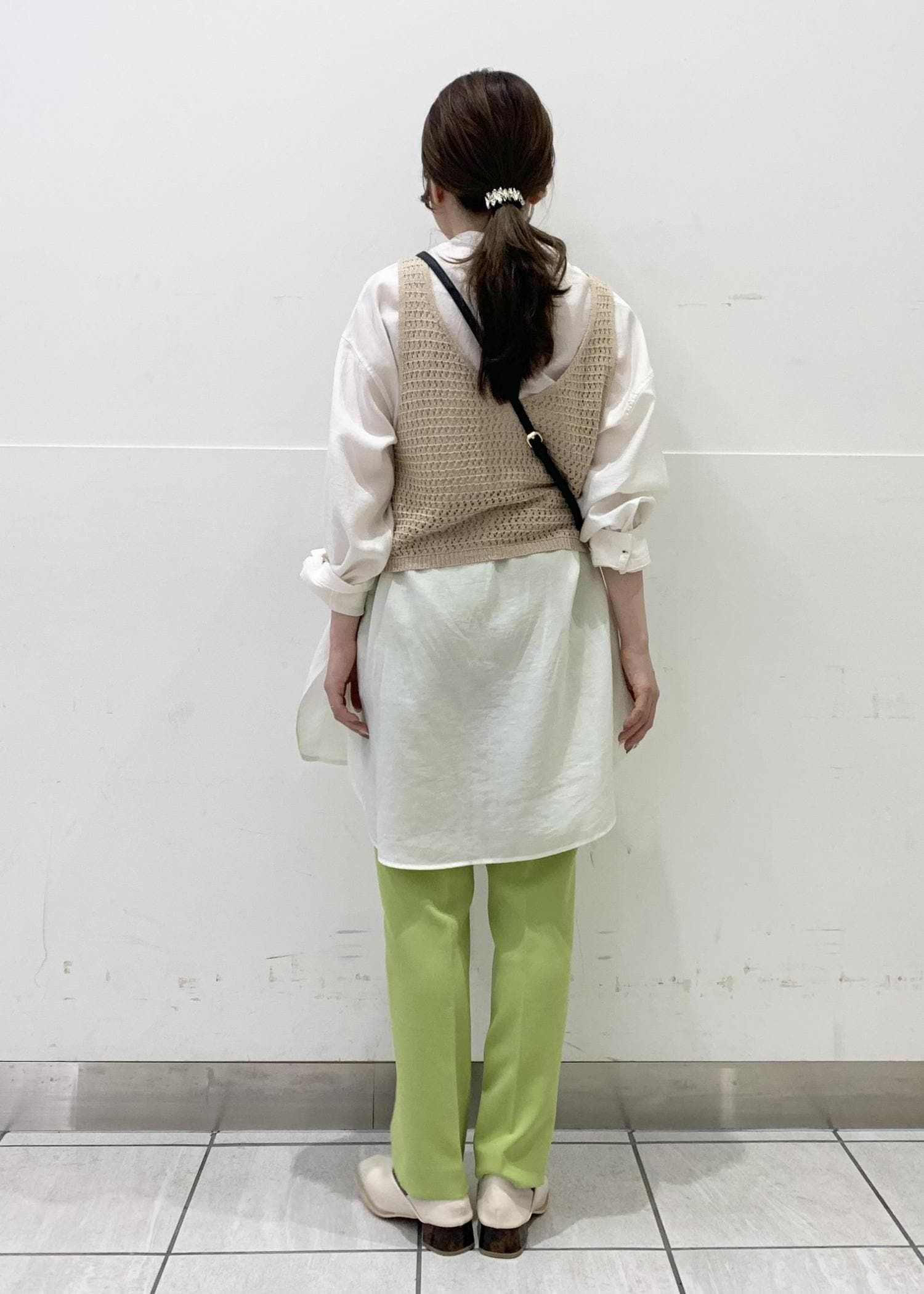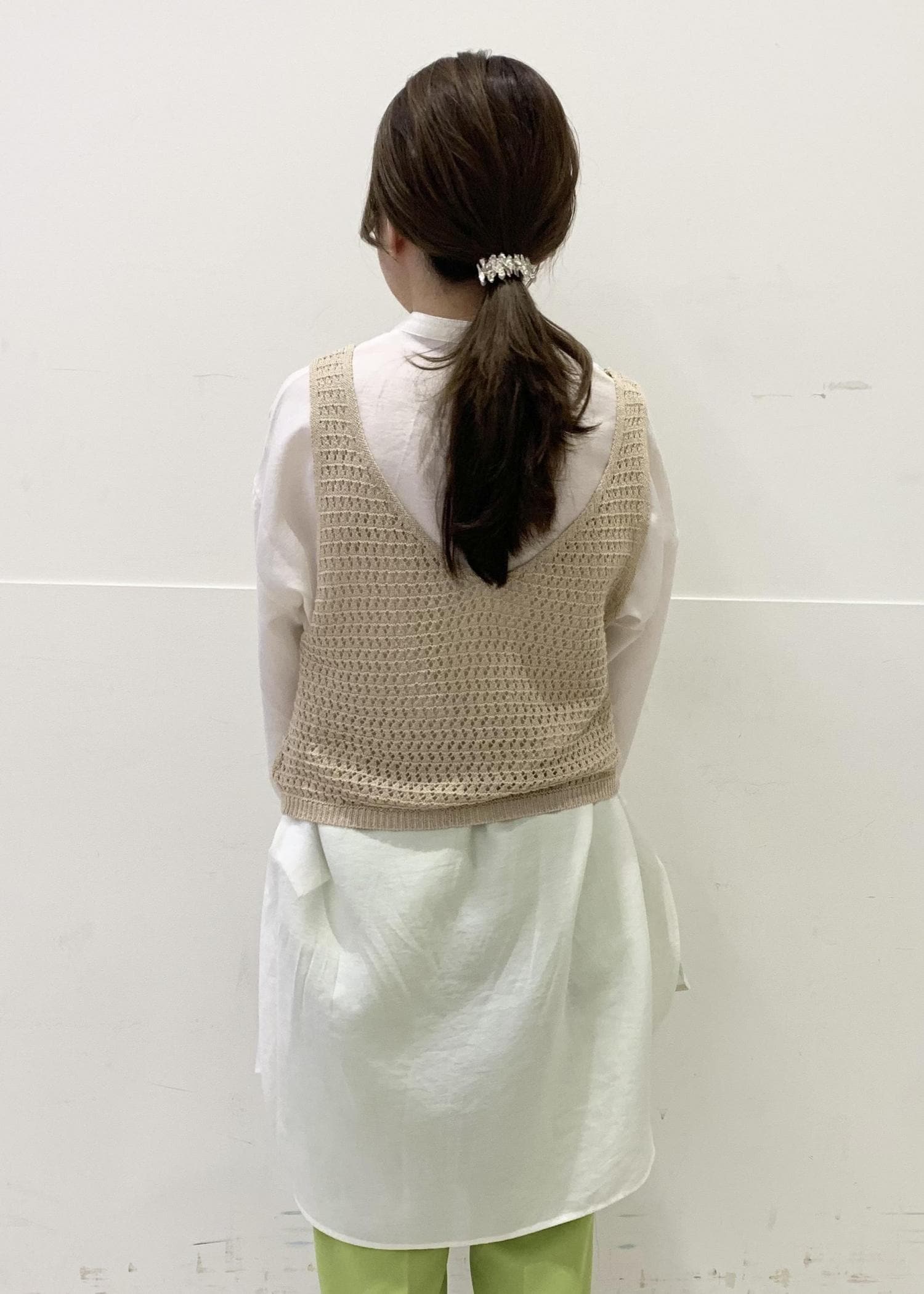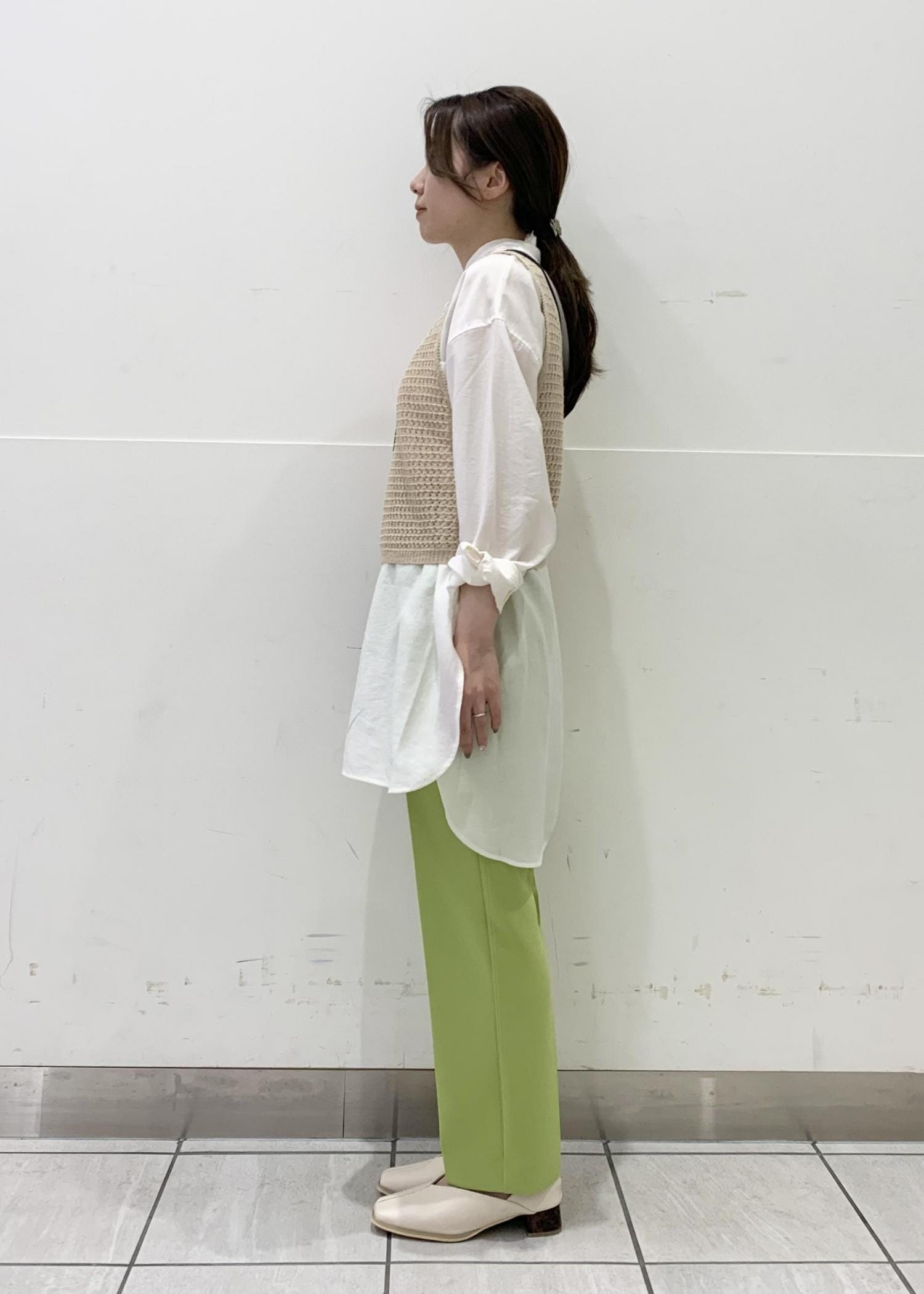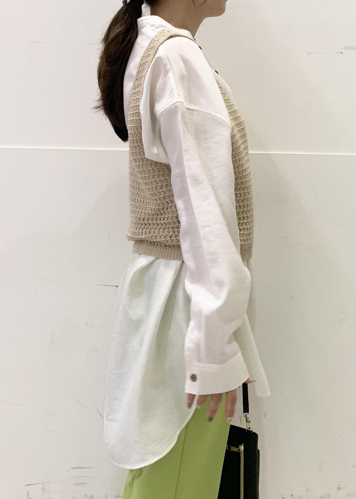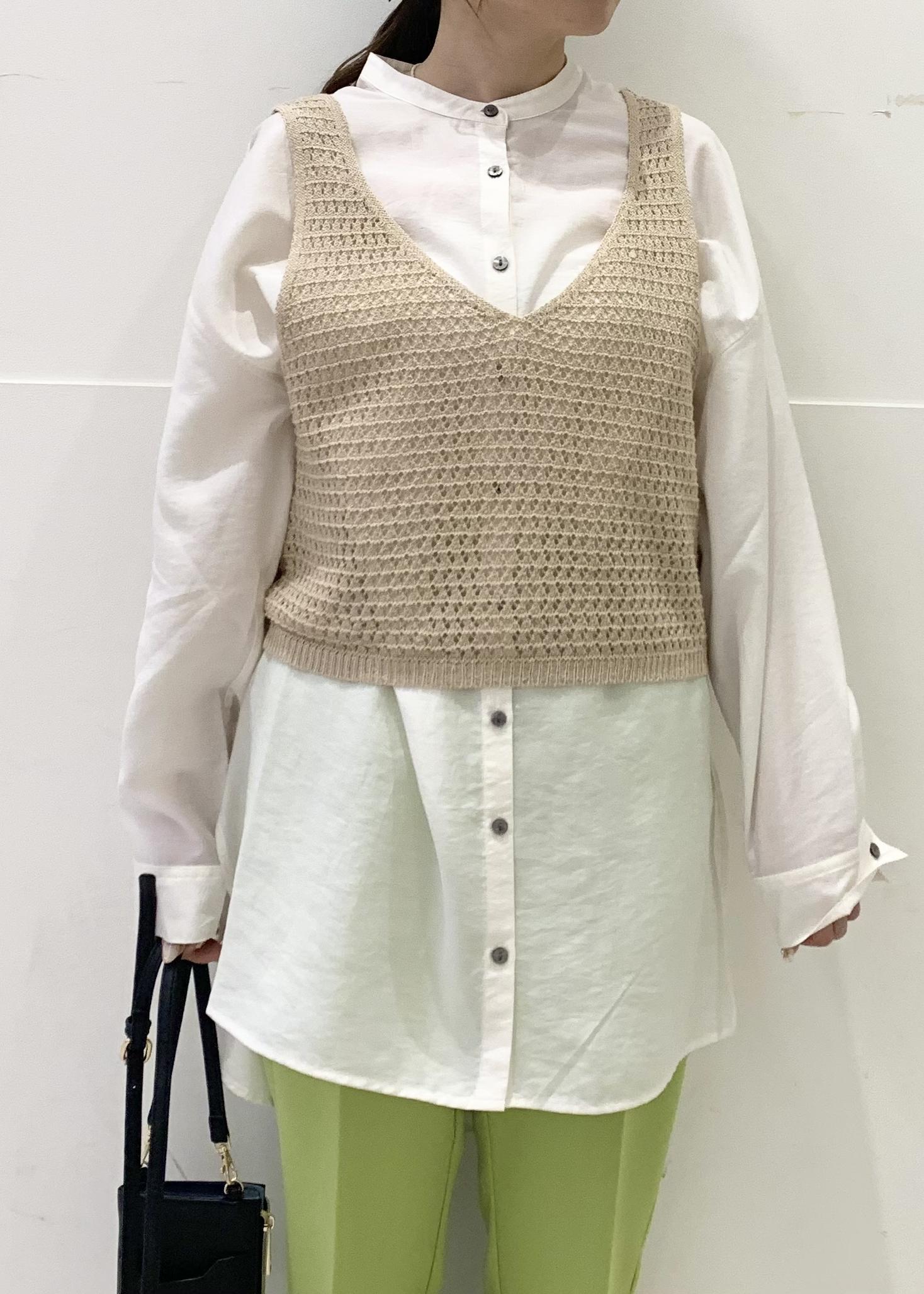 長めの丈のシアーシャツに着丈の短いニットベストを合わせることで低身長さんでもバランス良くお召しいただけます!