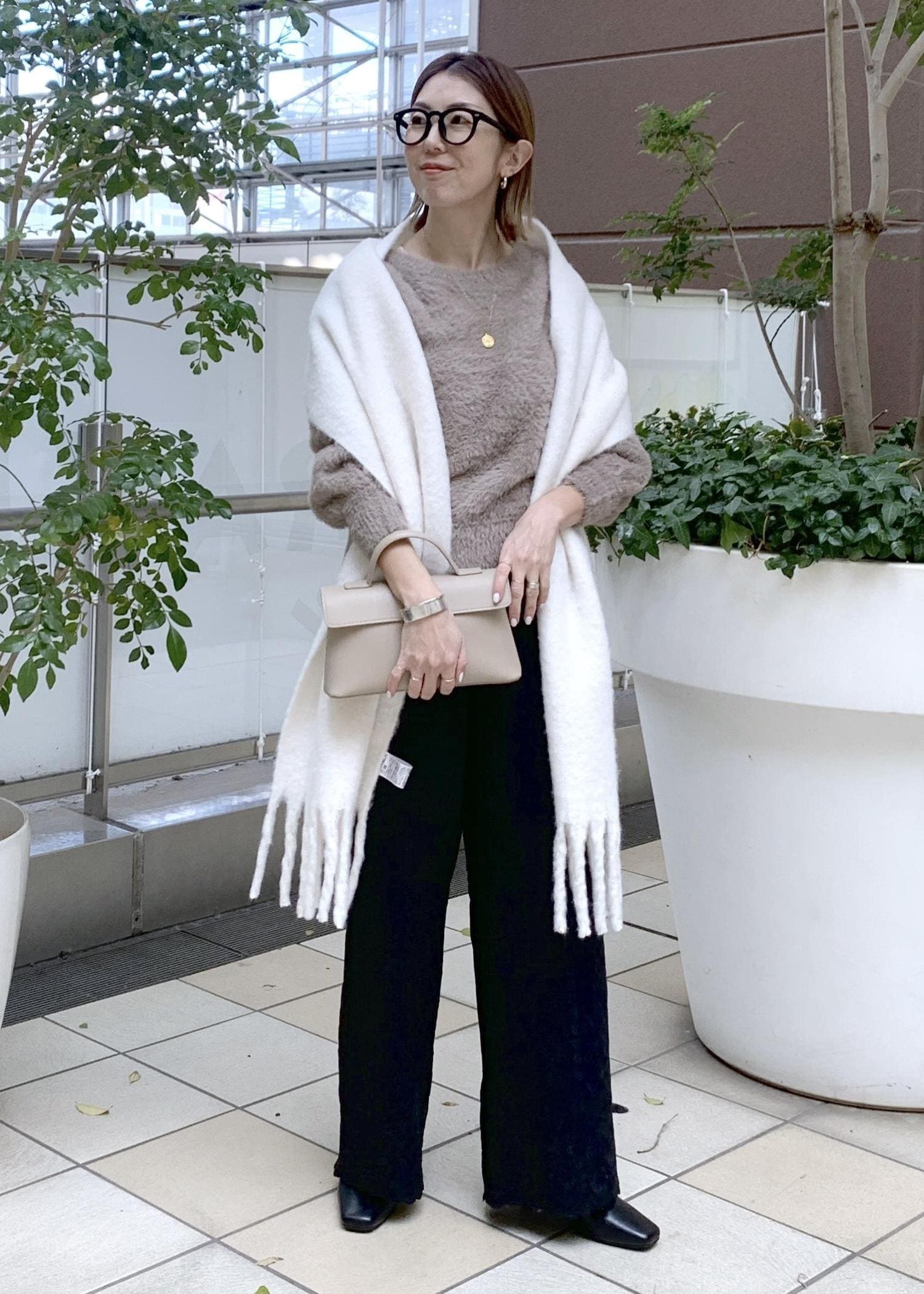 レーヨン素材の楽ちんパンツを合わせて、ラフでもきちんと感もある大人カジュアルコーデにしました。