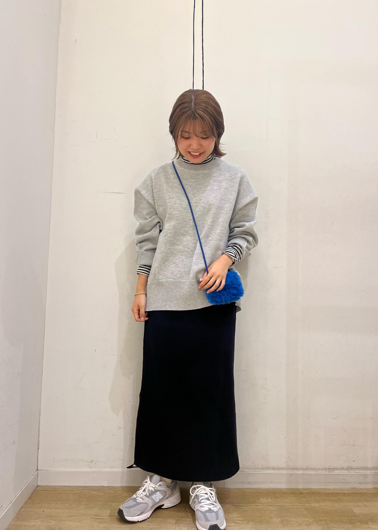 全体はブラック、ブルー系のクールカラーでまとめたコーデですが、血色感UPでヘルシーな印象のオレンジ系メイクとオレンジ色のスカーフで今年らしさをプラスしているところがポイントです☺︎