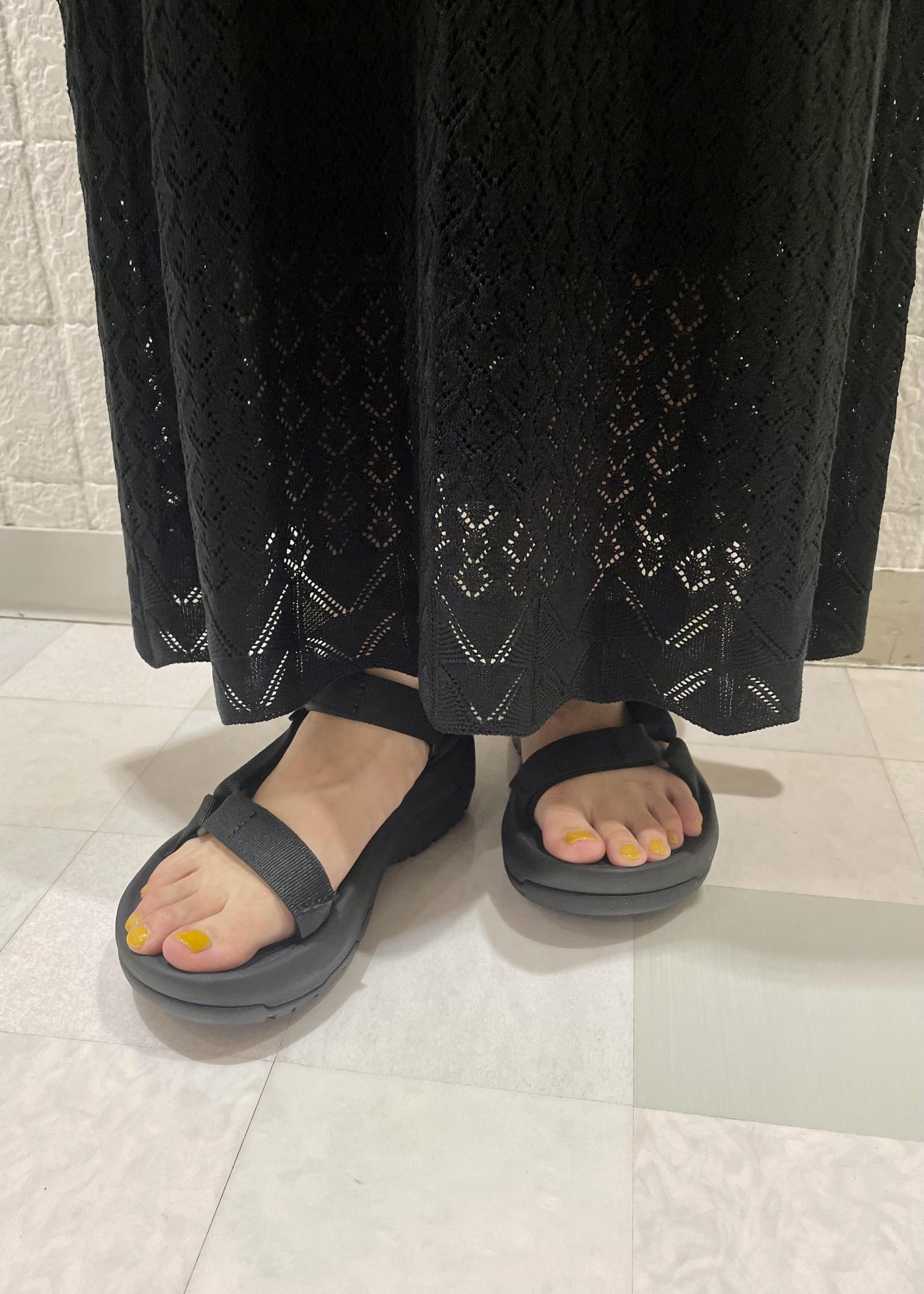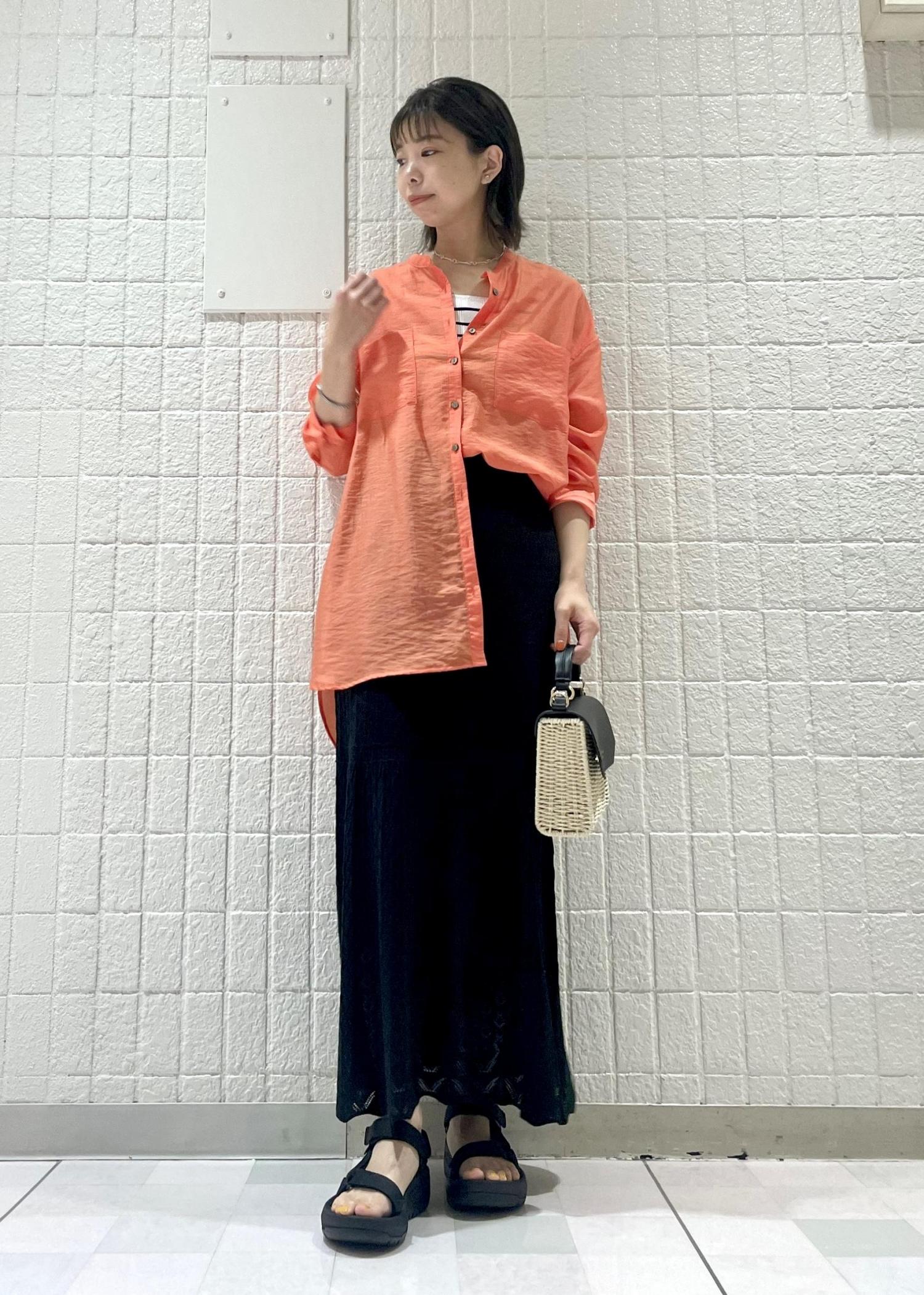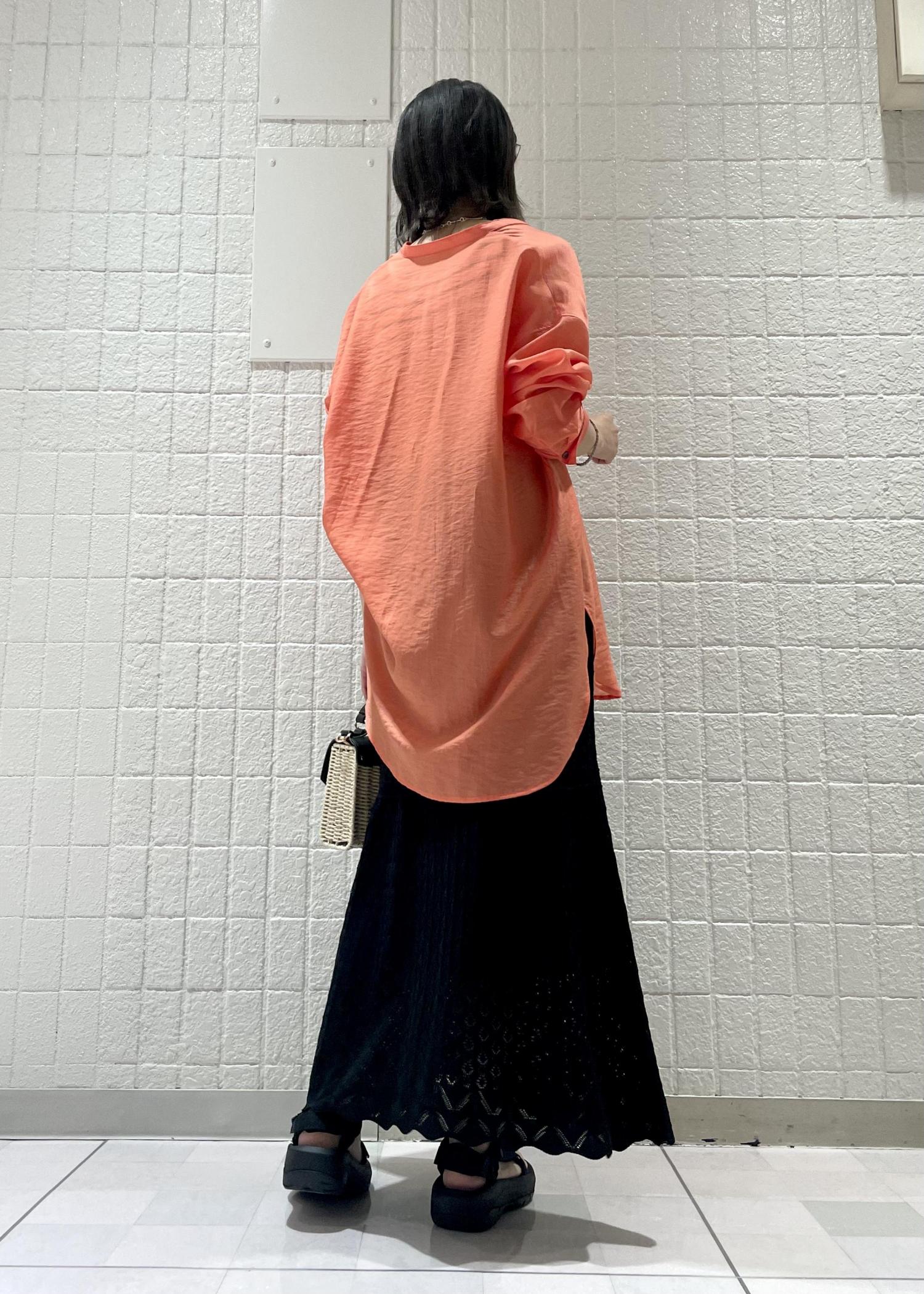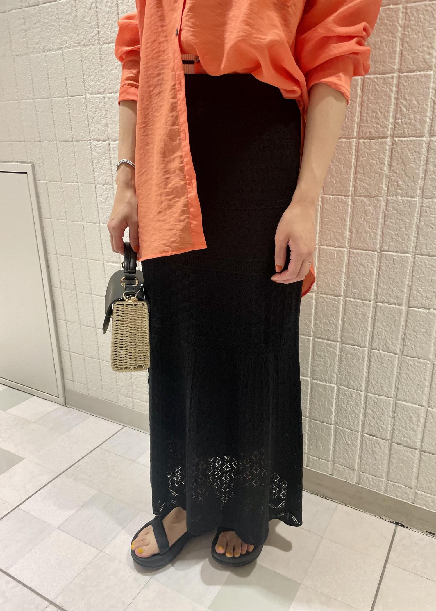 透かし編みニットスカートを合わせた大人カジュアルコーデ