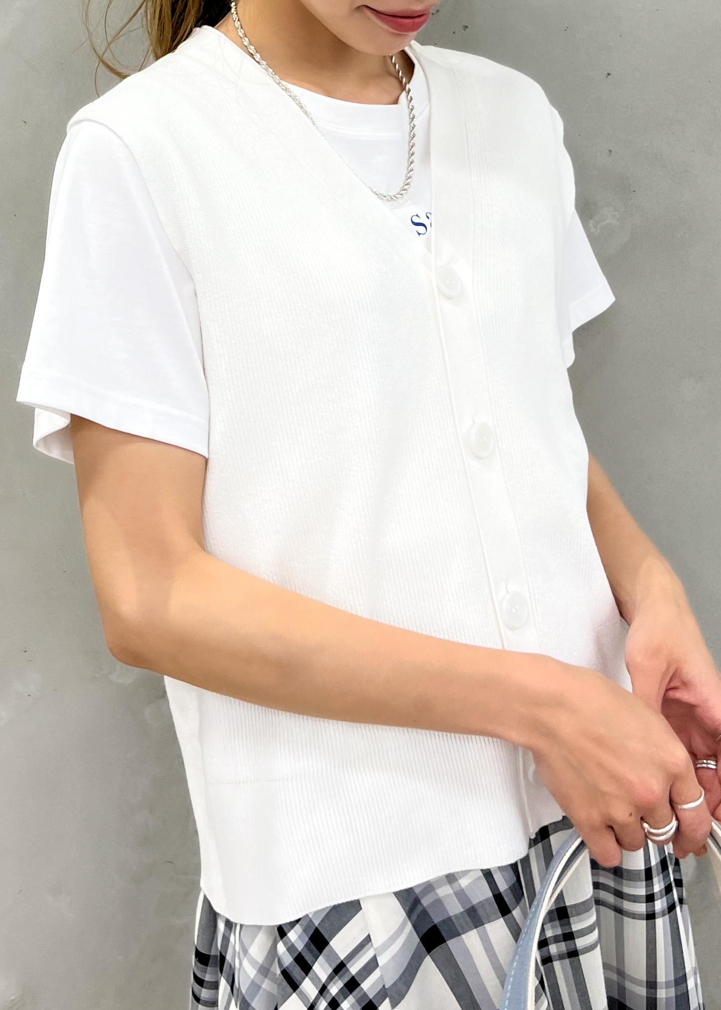 ノースリーブのニットベストはTシャツに合わせてカジュアルコーデにもおすすめ。