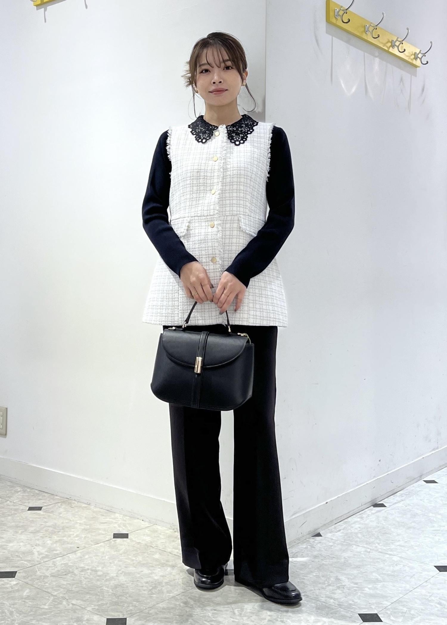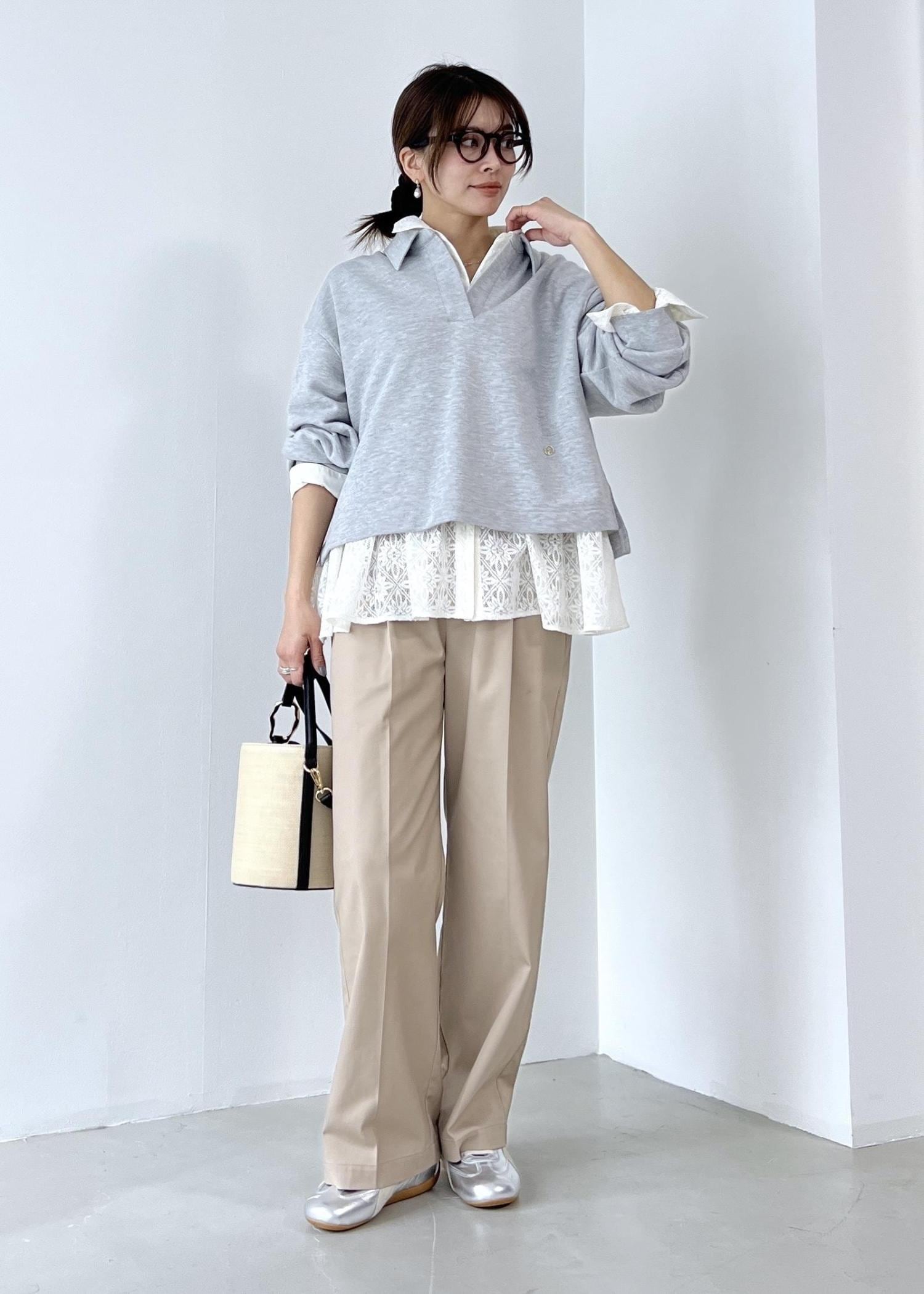柔らかい生地のボトムは、スカート見えするデザインのパンツデザイン。