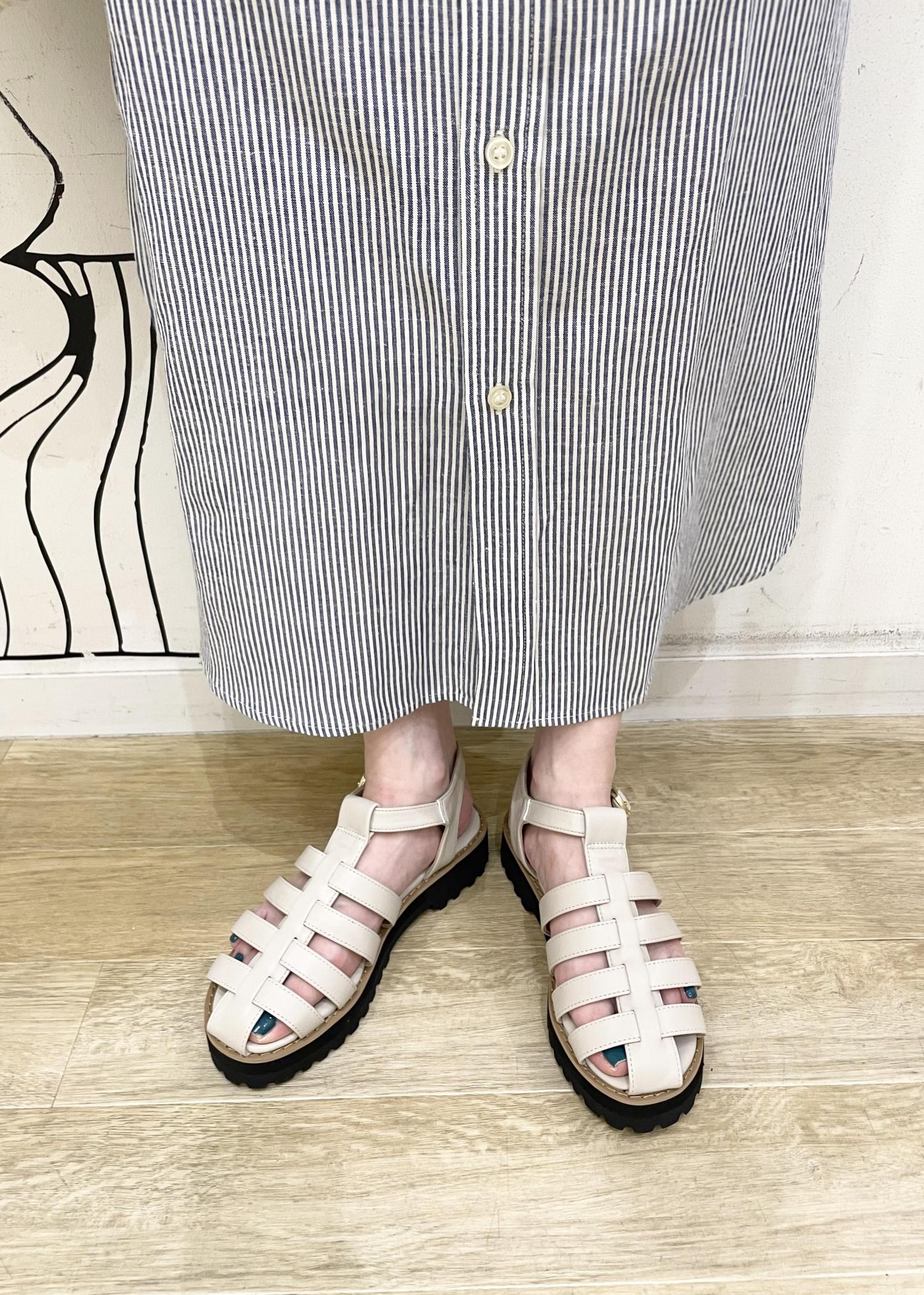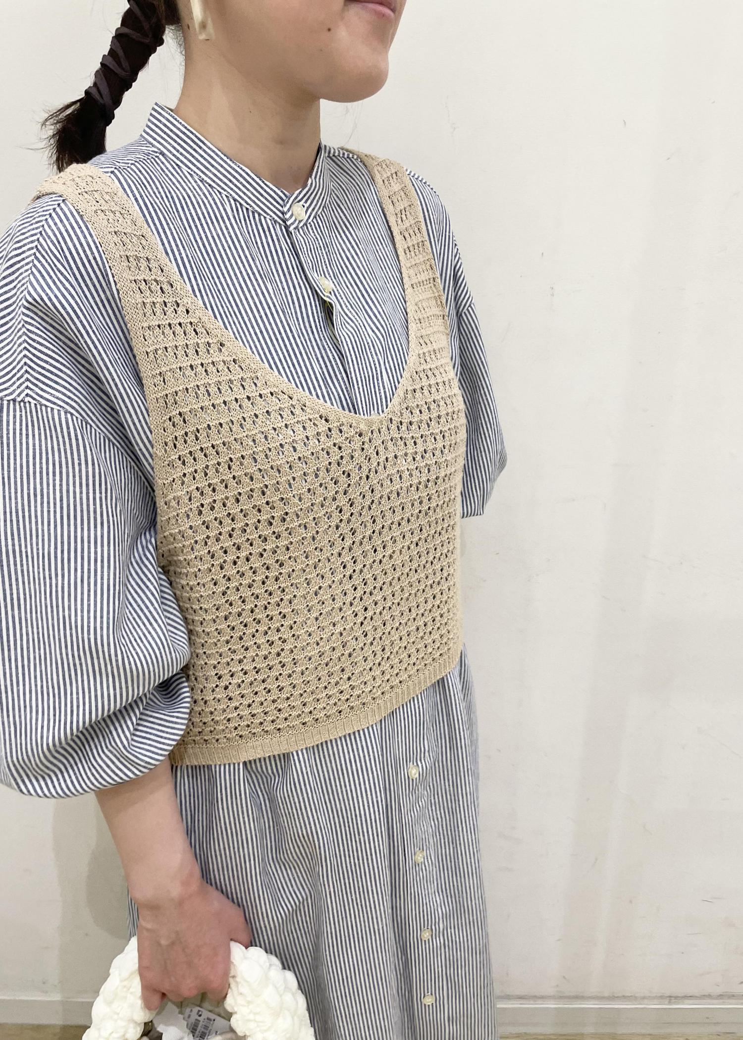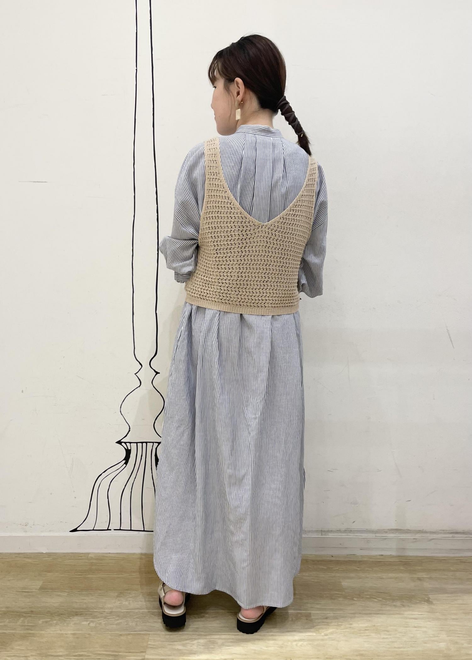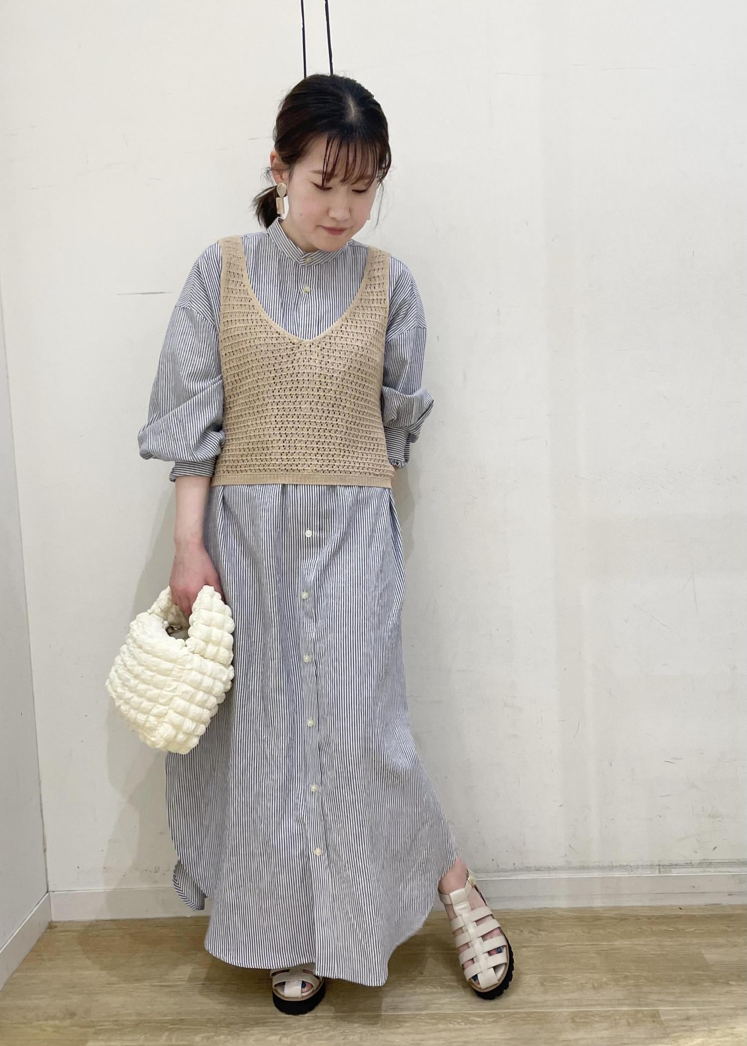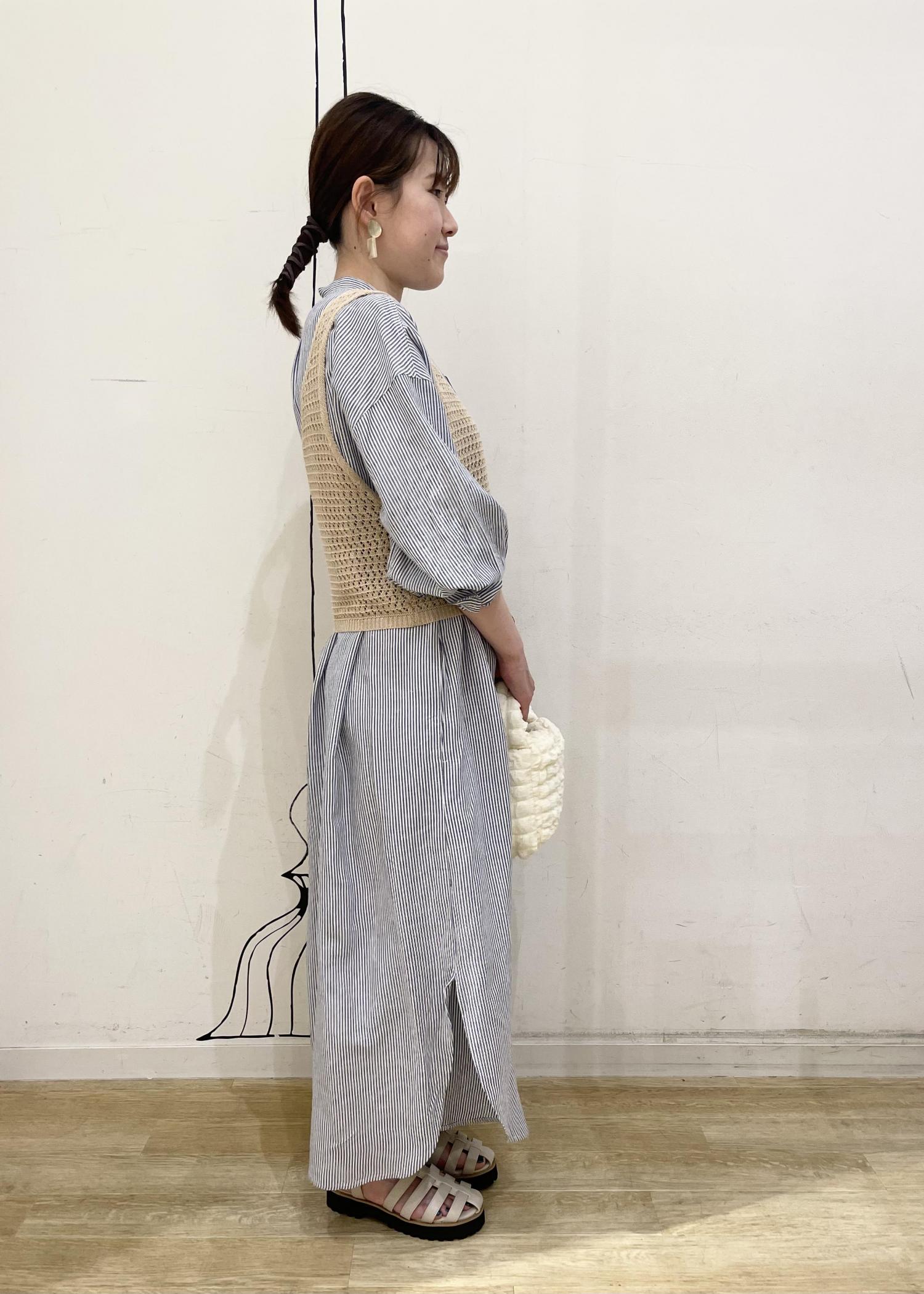 春夏らしい麻混のワンピースをビスチェと合わせたレイヤードスタイルにしました。ゆったりしたシルエットなので短いビスチェと合わせるとスッキリ感が生まれて脚も長く見えます。 ワンピースは羽織にもなって着回し万能アイテムです。