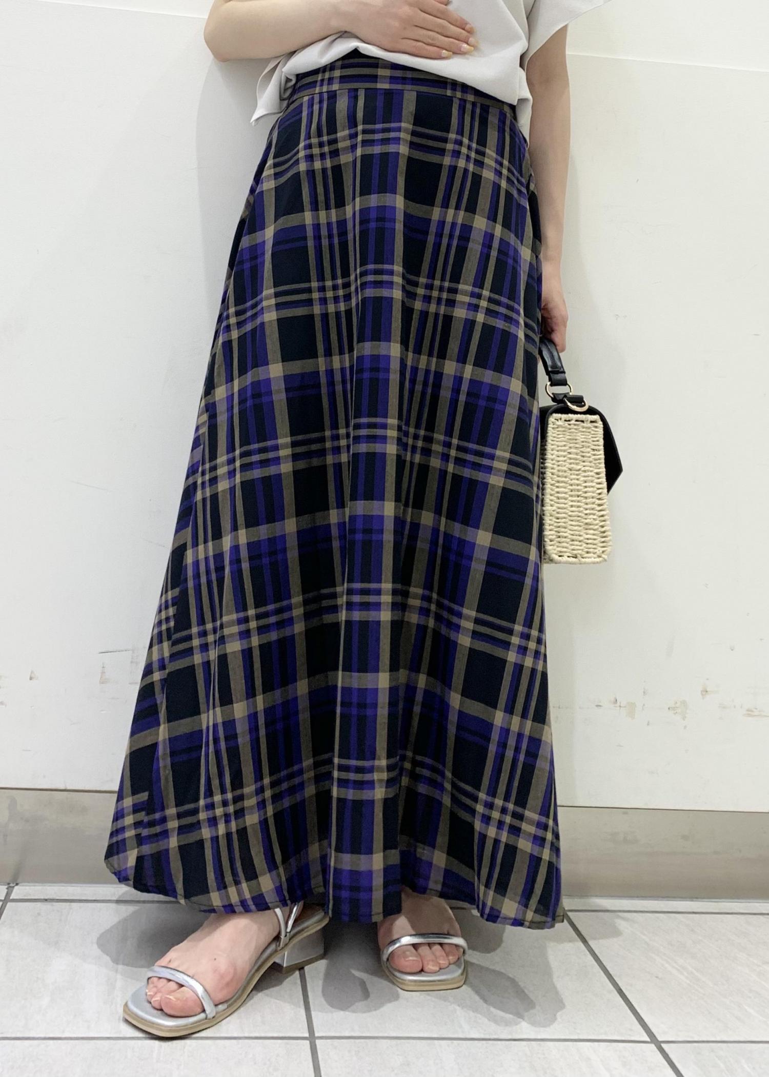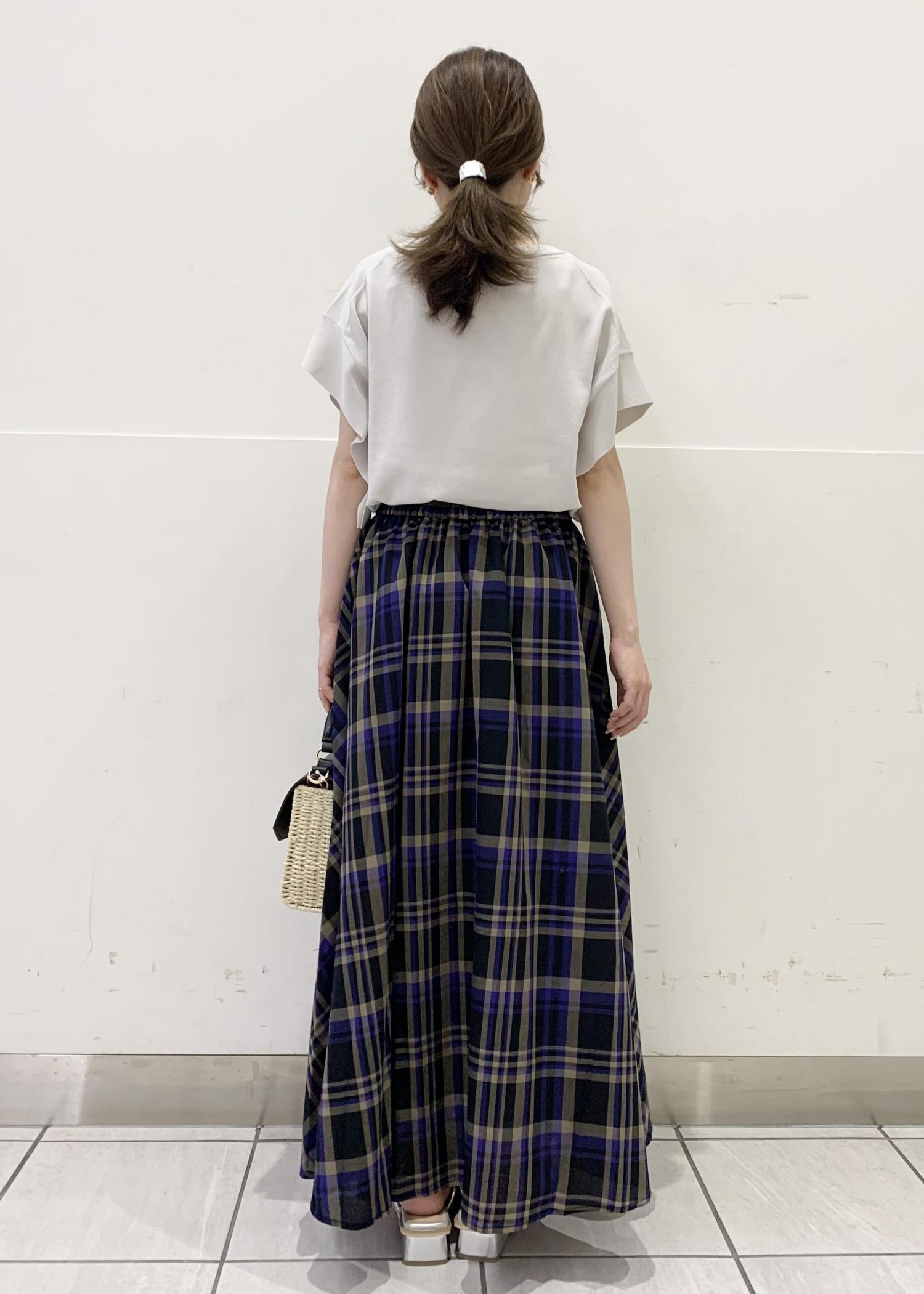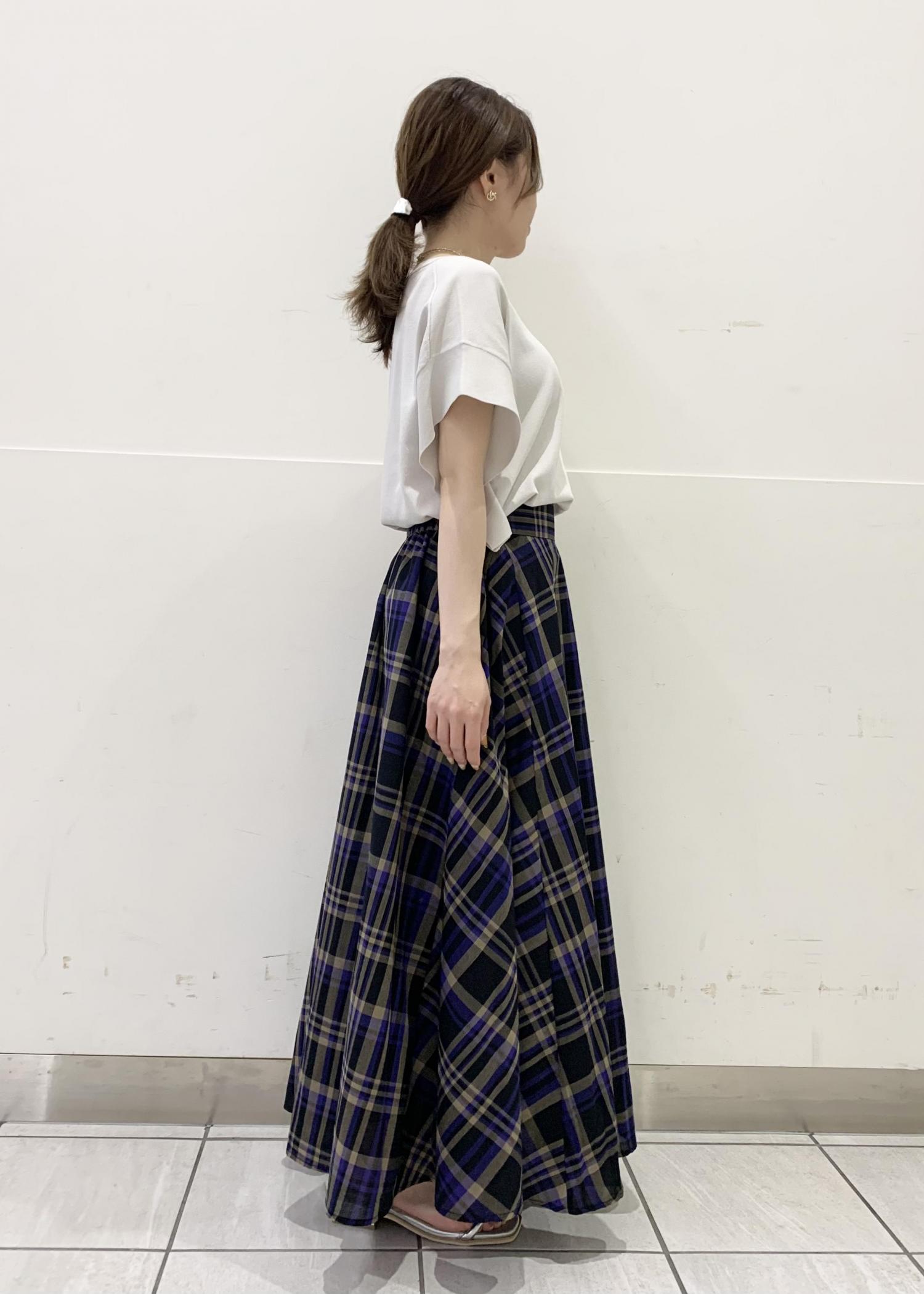 フレアスカートにトップスインすることで、目線が上がりスッキリとした印象に。