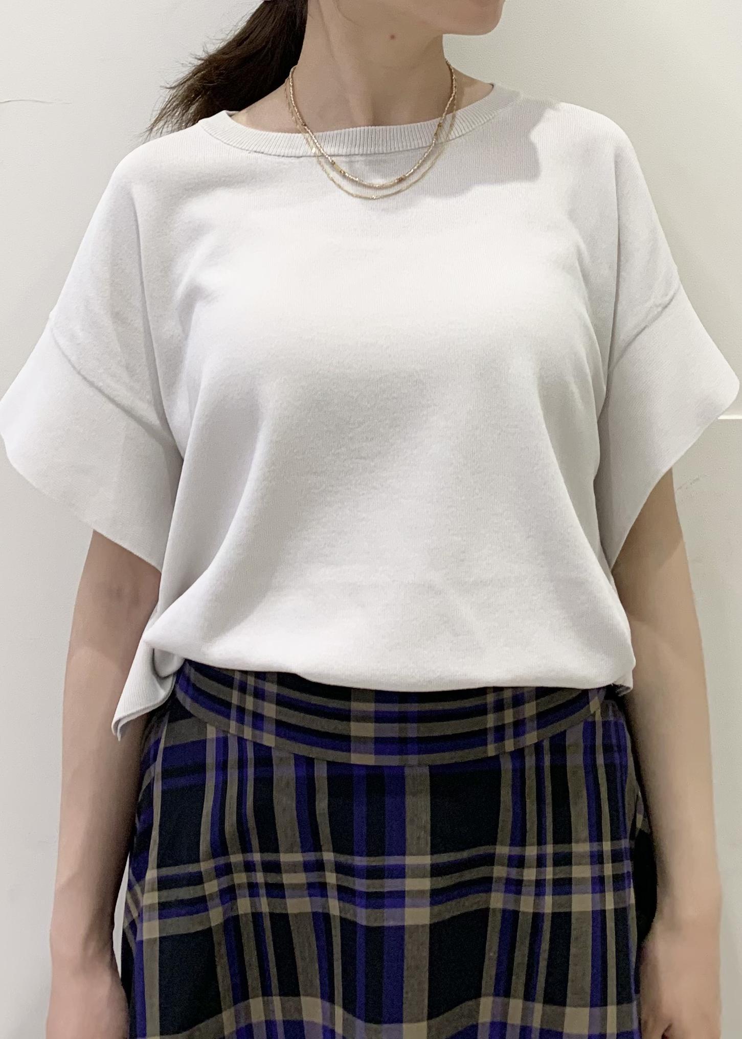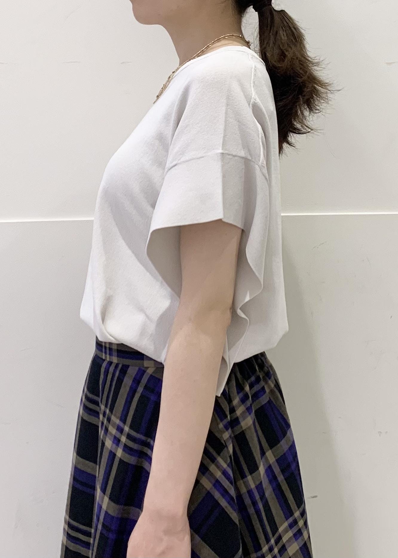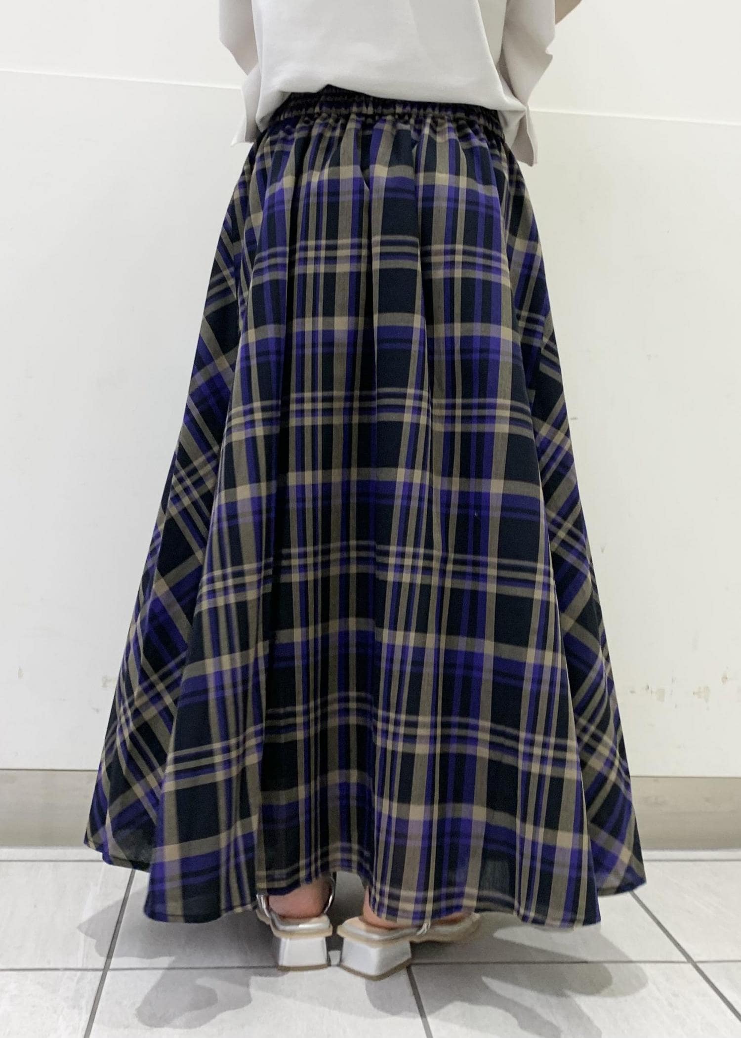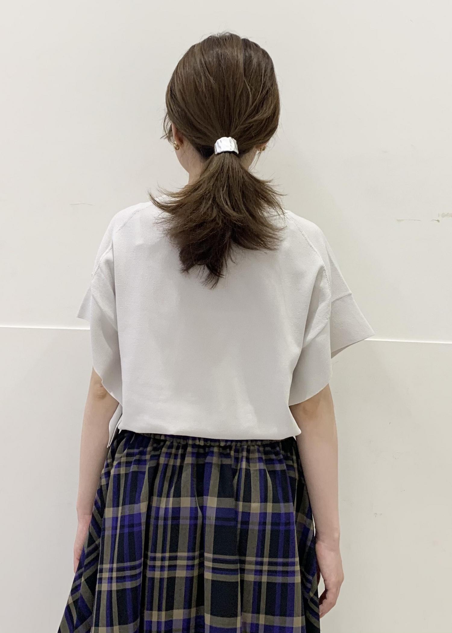 フレアスカートにトップスインすることで、目線が上がりスッキリとした印象に。