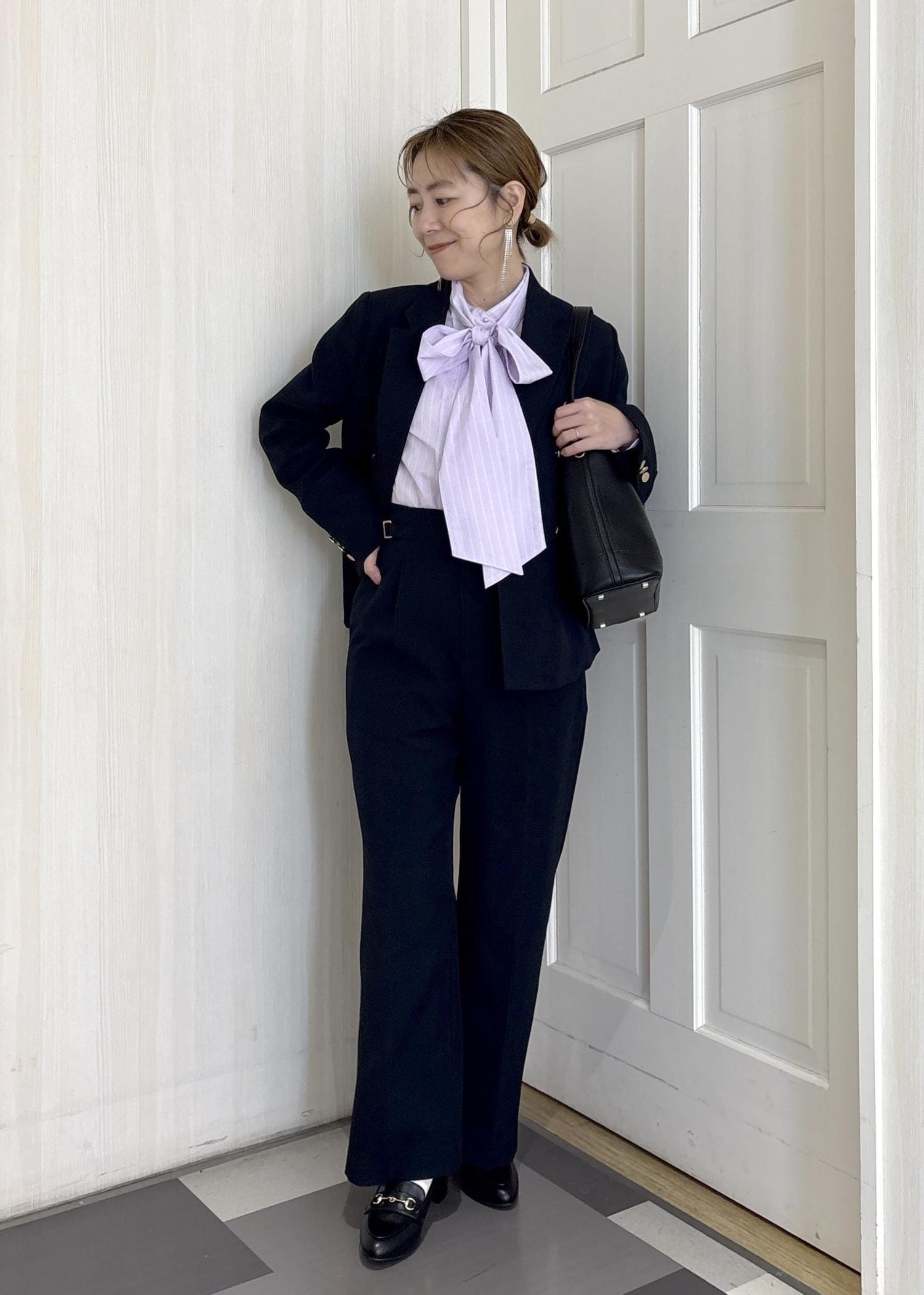 おすすめコーデ:ブラウスをアウトで着て、すっきり感を出すのがおすすめです。お仕事用にも履けるデザインです。