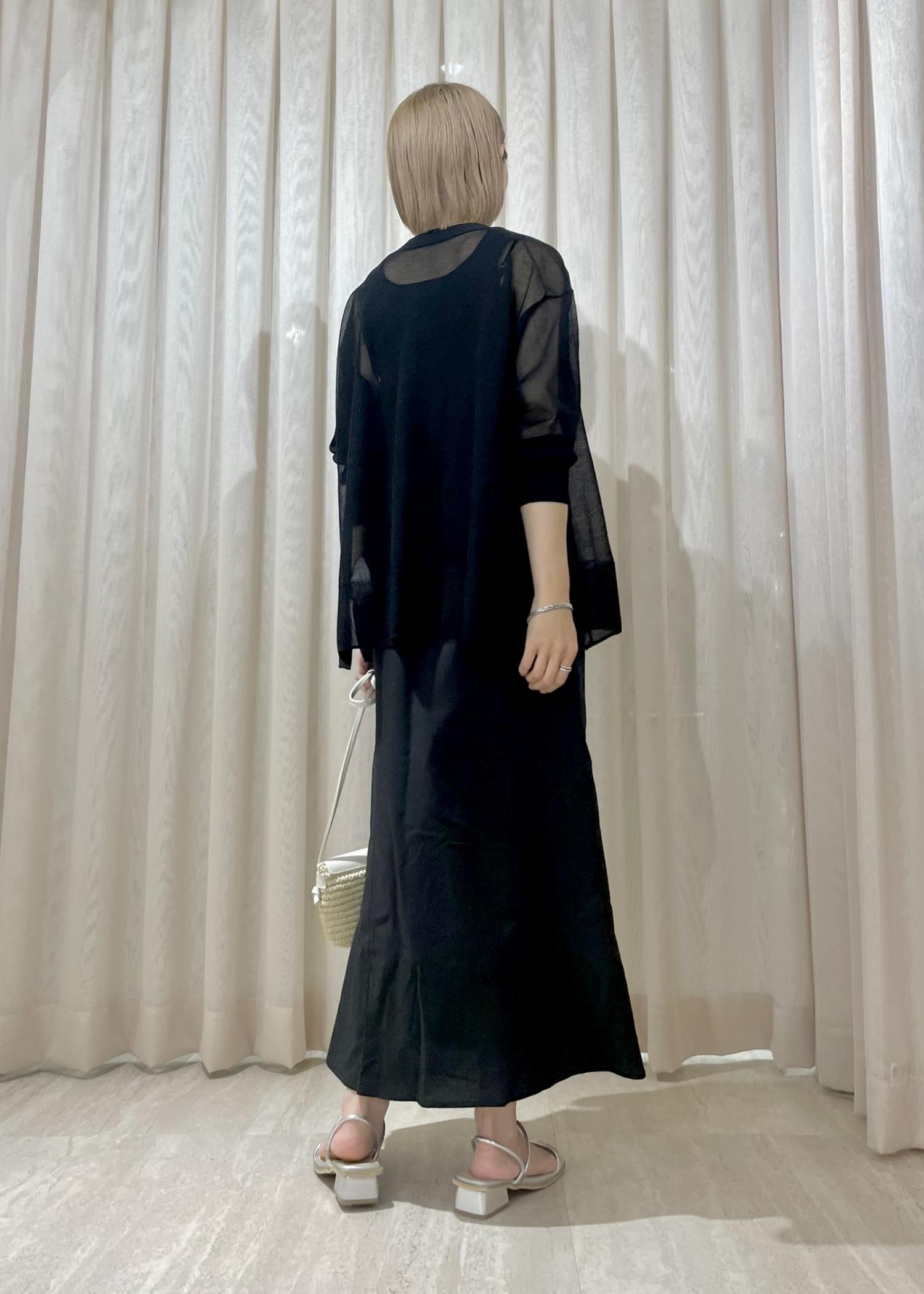 タンクトップにキャミワンピースを合わせ、シアー感のあるカーディガンをプラスすることで、軽い印象に!