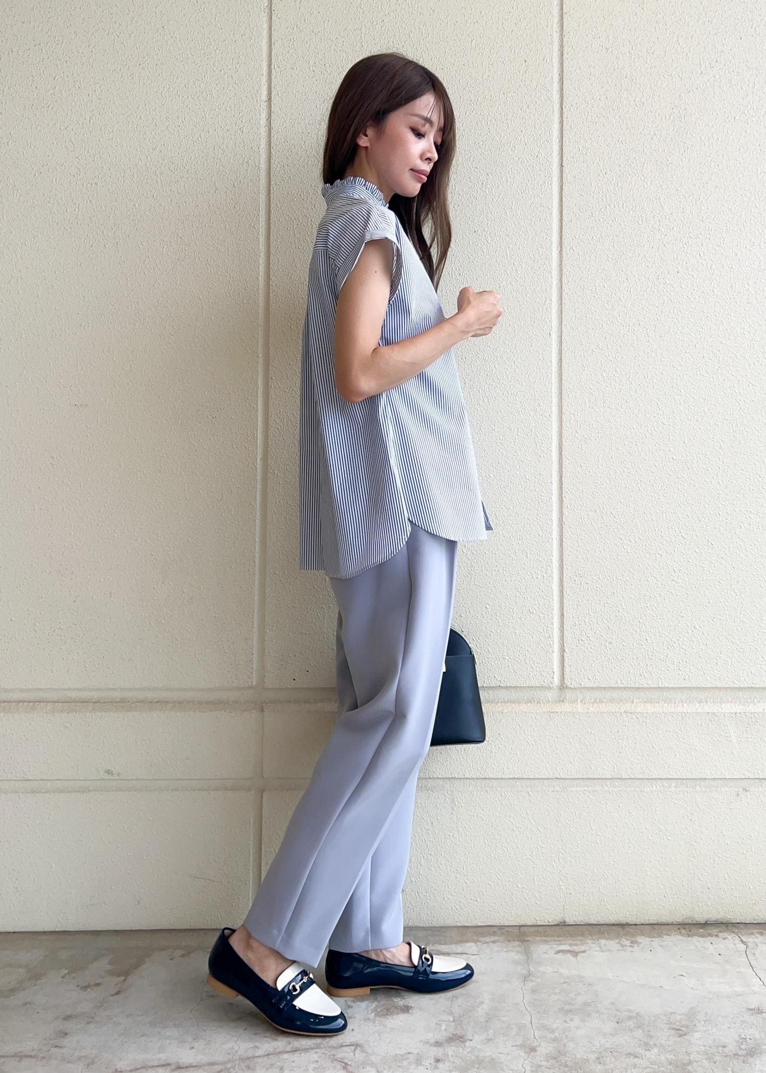 人気のウルトラストレッチシリーズのテーパードパンツを合わせて、お仕事にも使える綺麗めコーデにしました。