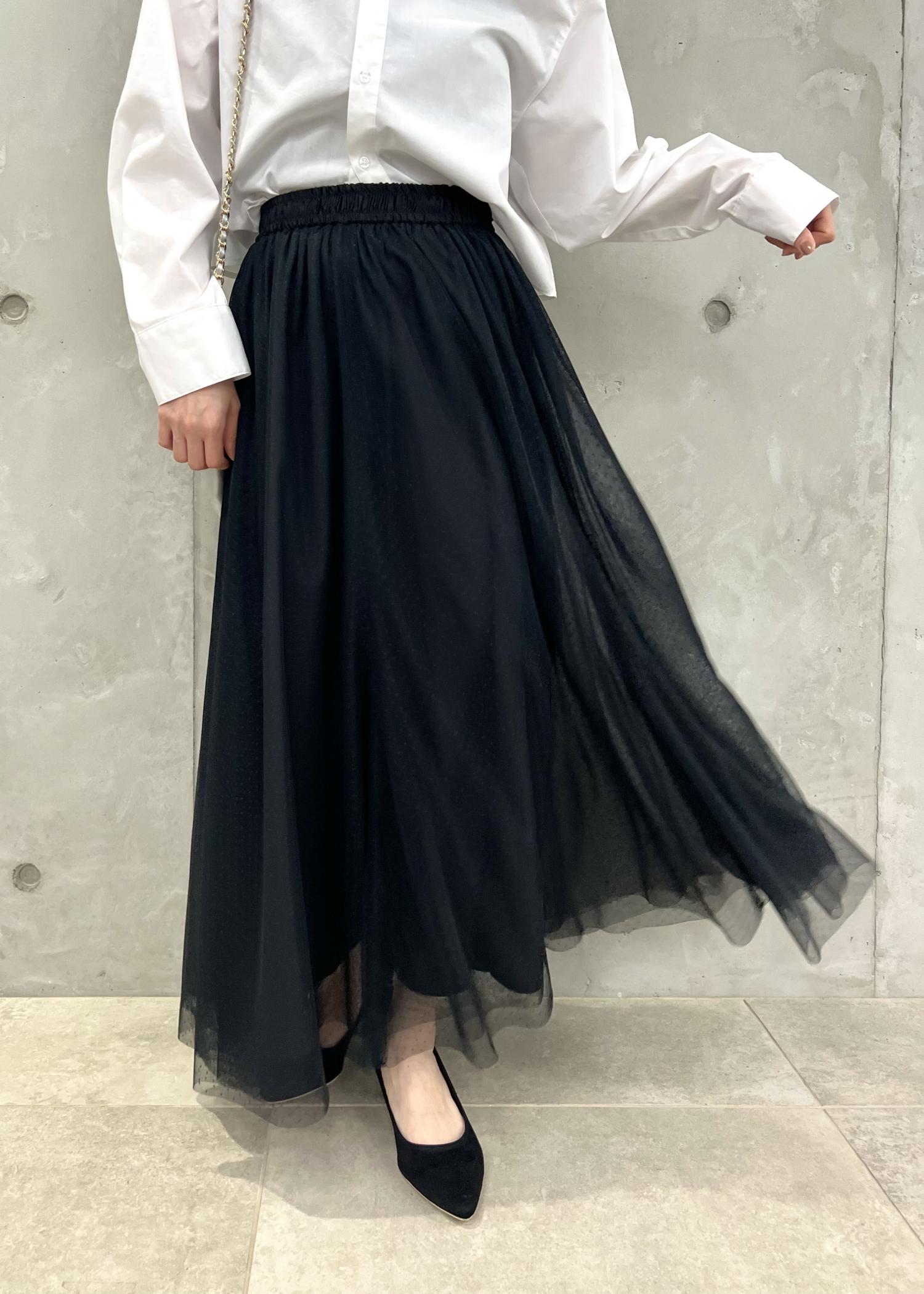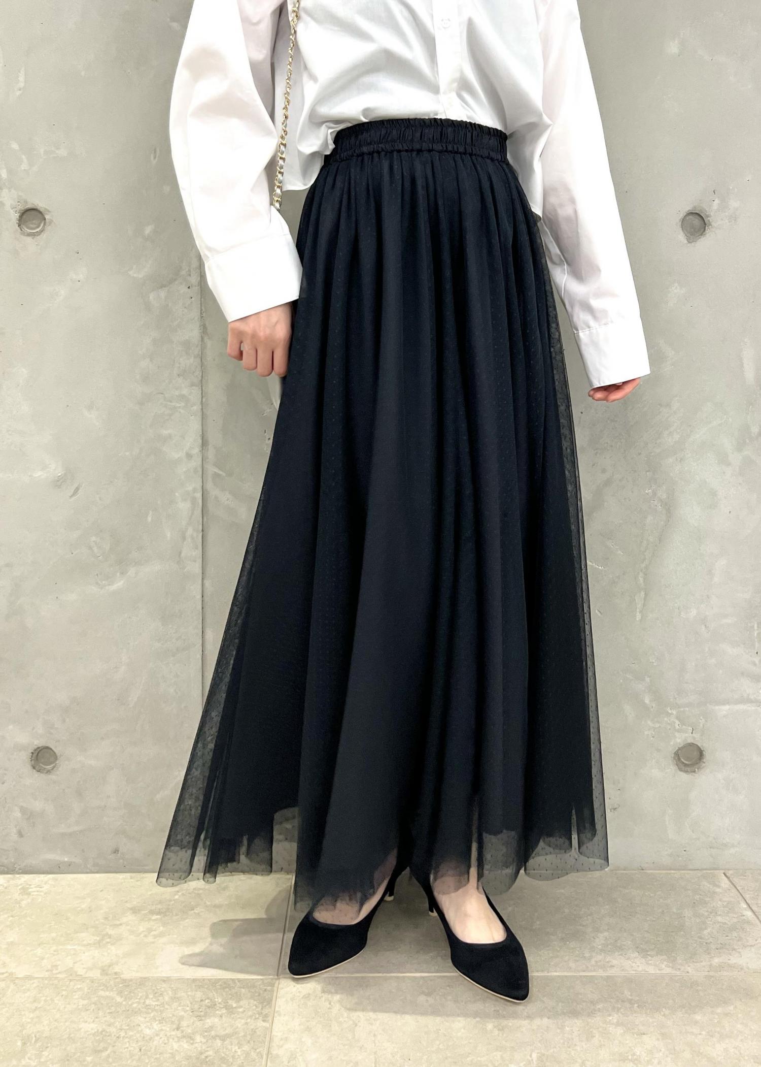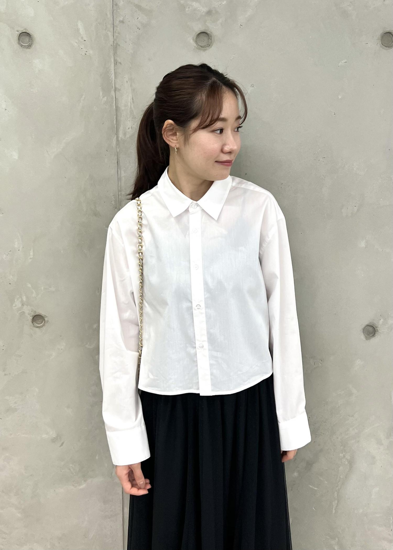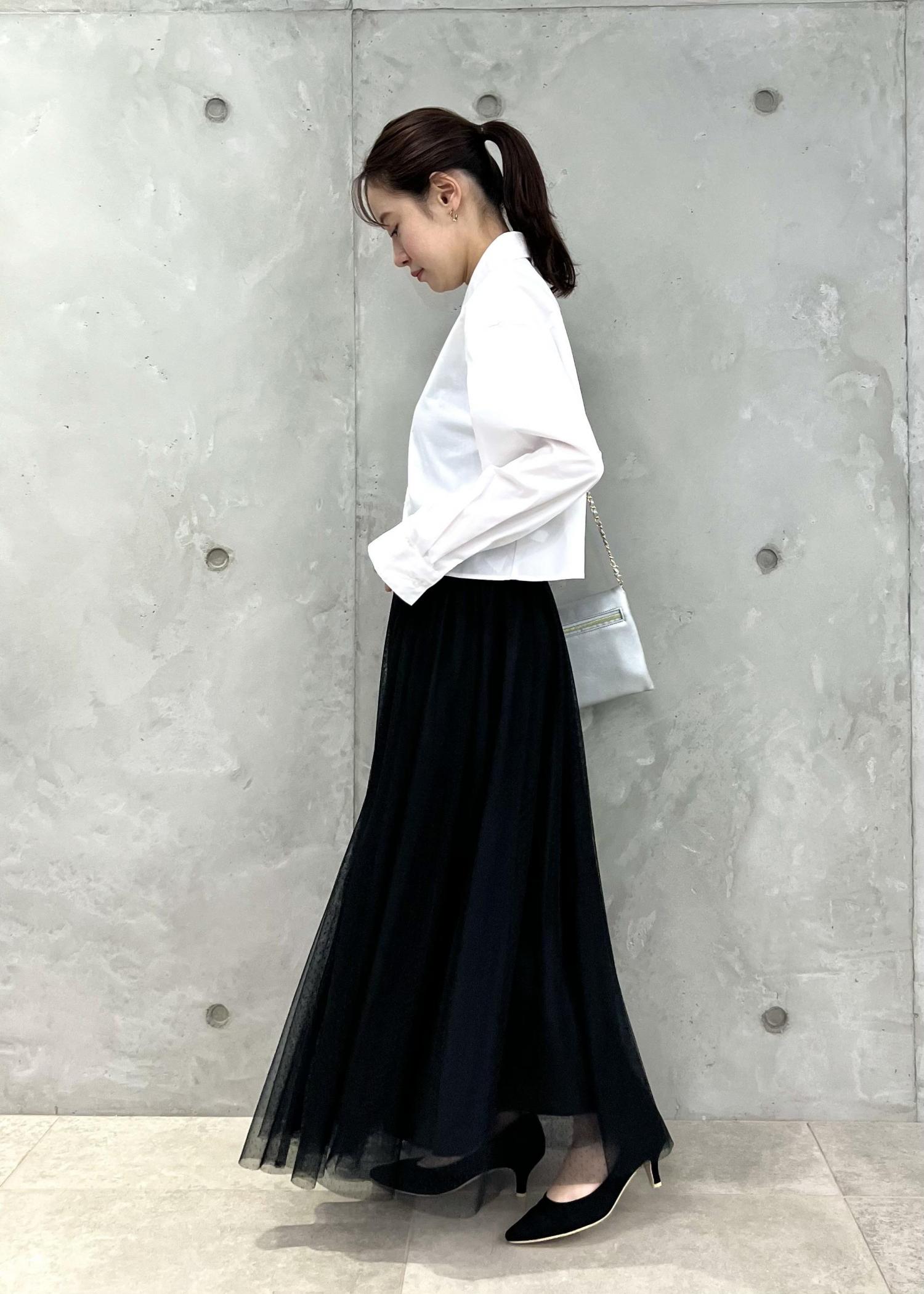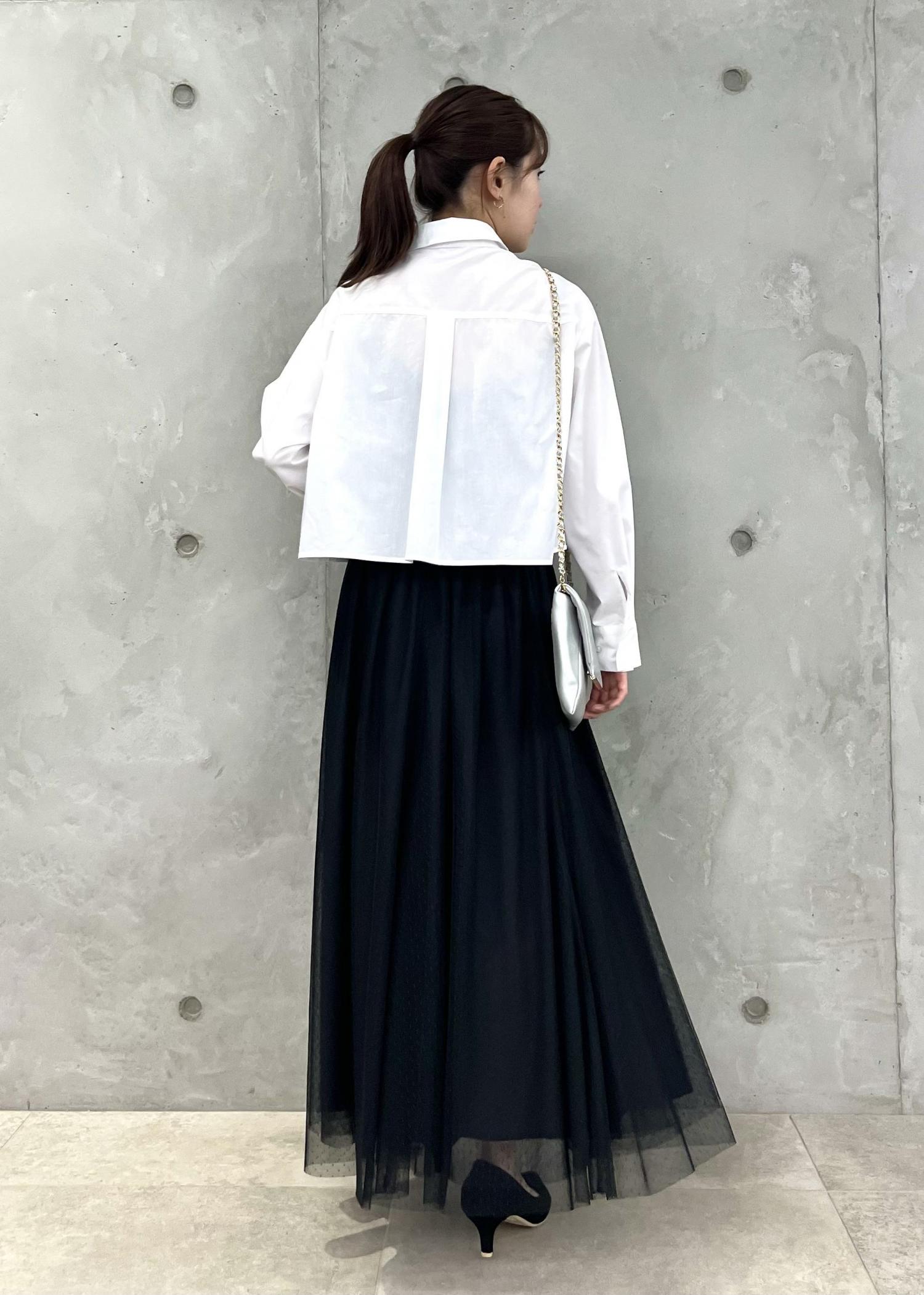 インしがちなボリュームスカートも、短丈シャツならアウトで着てもバランス良く着こなせます。