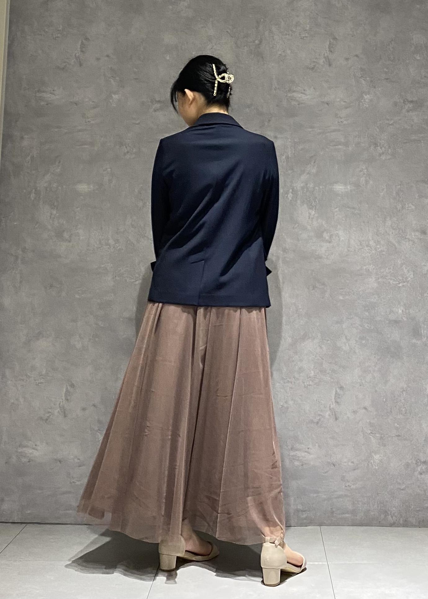 使い回ししやすいネイビーのジャケットと肌馴染みの良いブラウンのチュールスカートを合わせた大人っぽい上品なスタイリングです!秋のお出かけのコーディネートにいかがでしょうか!