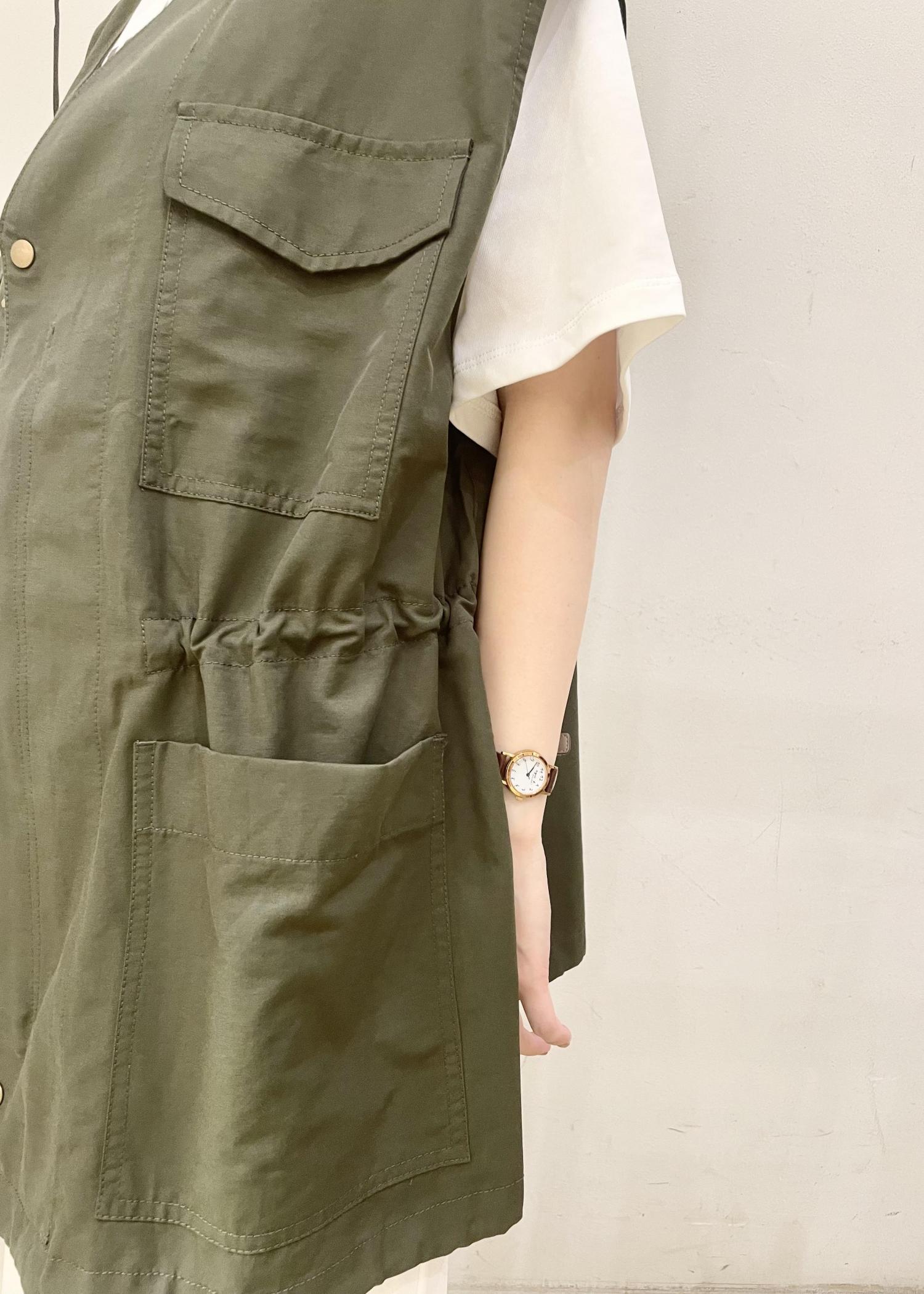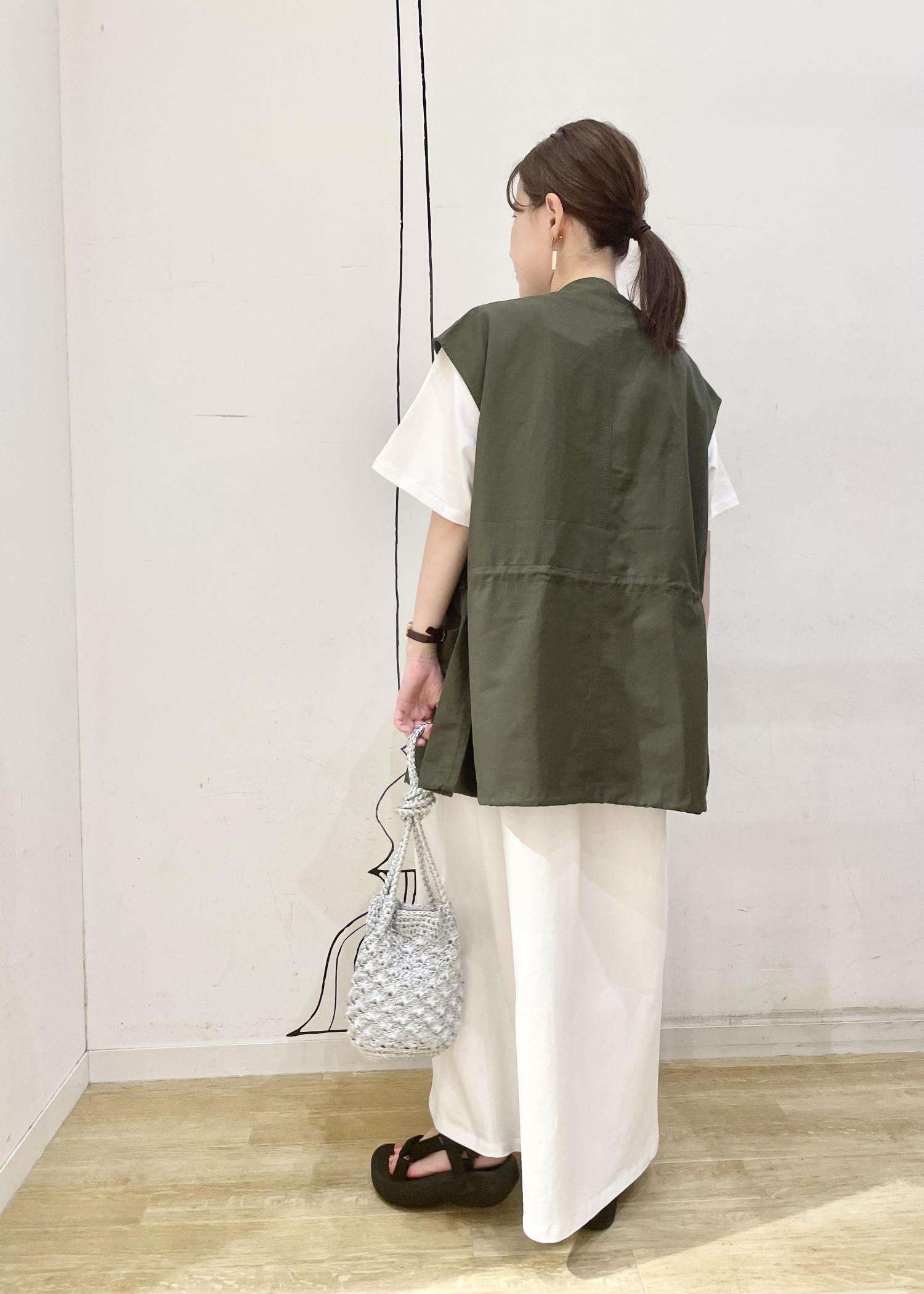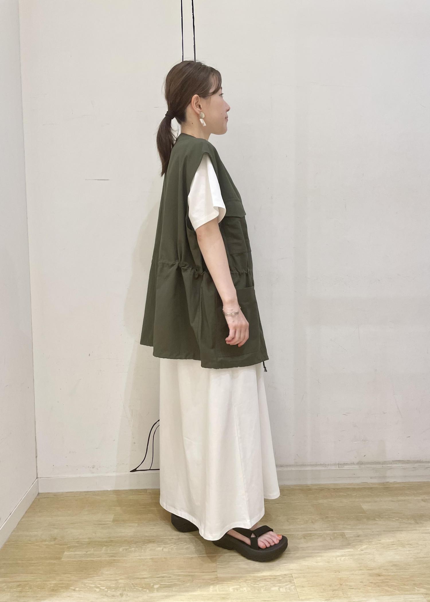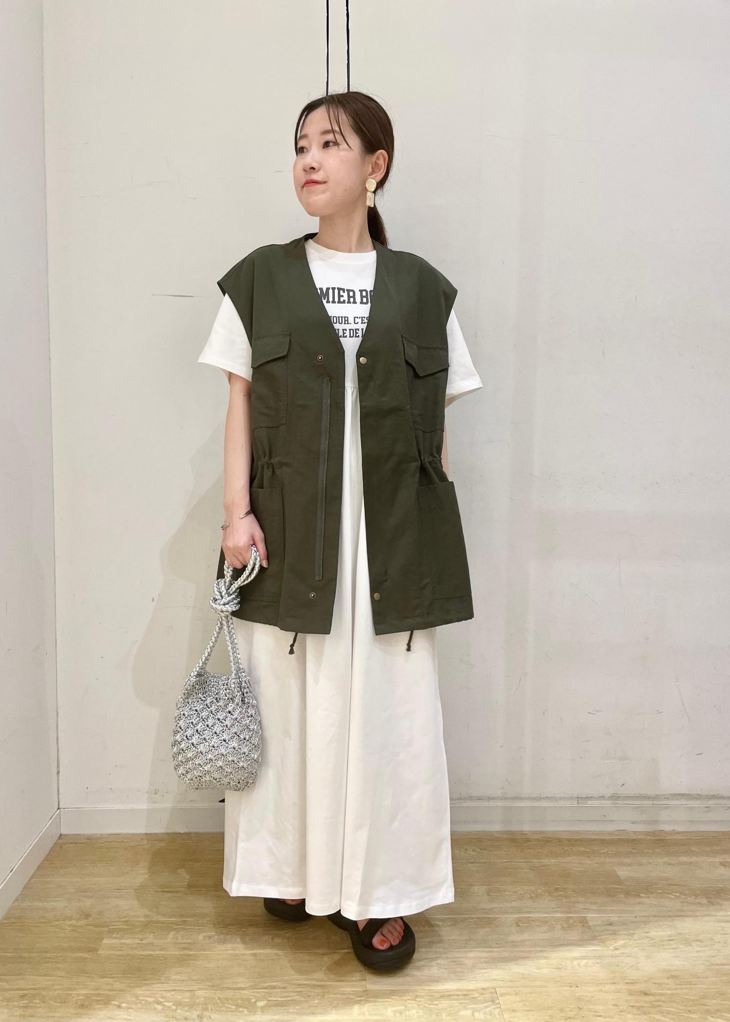 シンプルなカットワンピースにベストを合わせてポイントにしました。カジュアルになりすぎないようにあえてキャップなどは被らず、シルバーのショルダーバッグを選んで大人カジュアルな雰囲気に仕上げました。