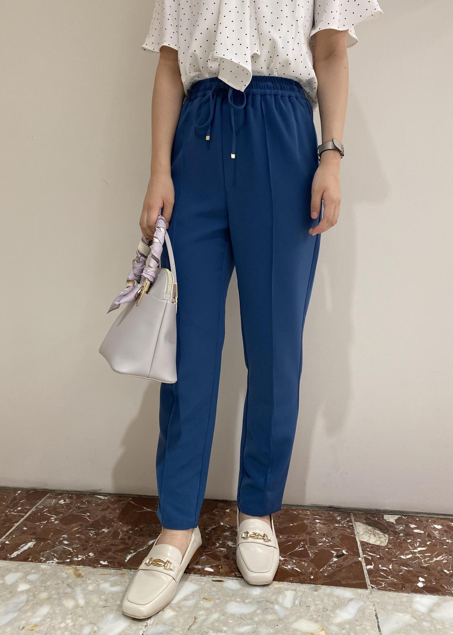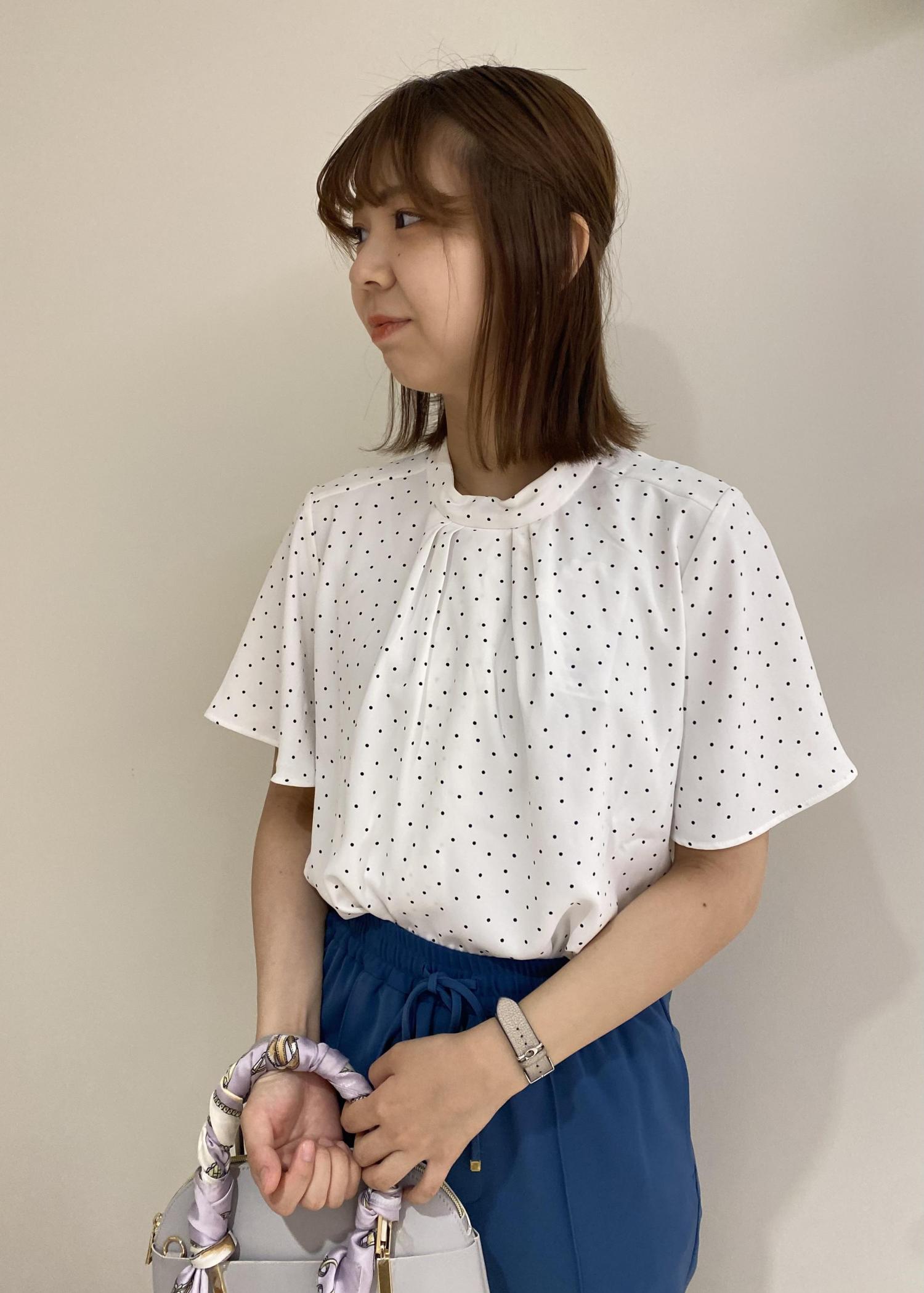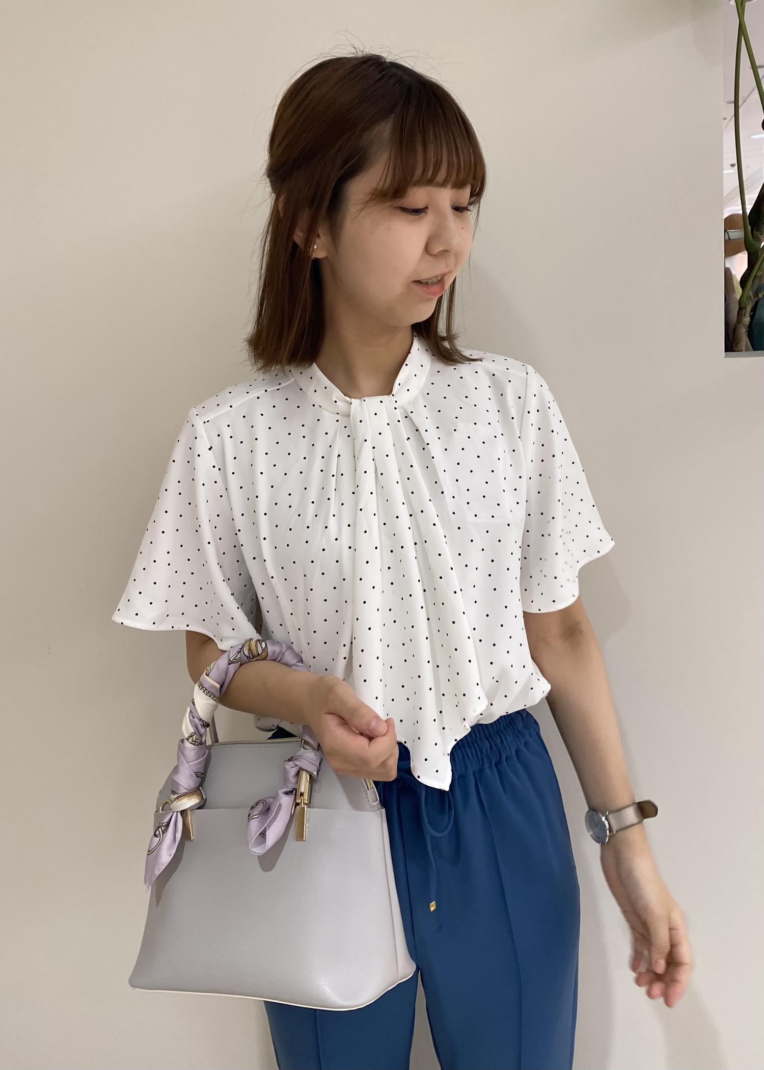 ブルーのパンツを主役にドット柄のボウタイブラウスを合わせてフレンチカジュアルスタイルにしました。