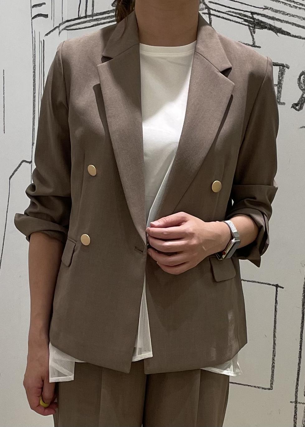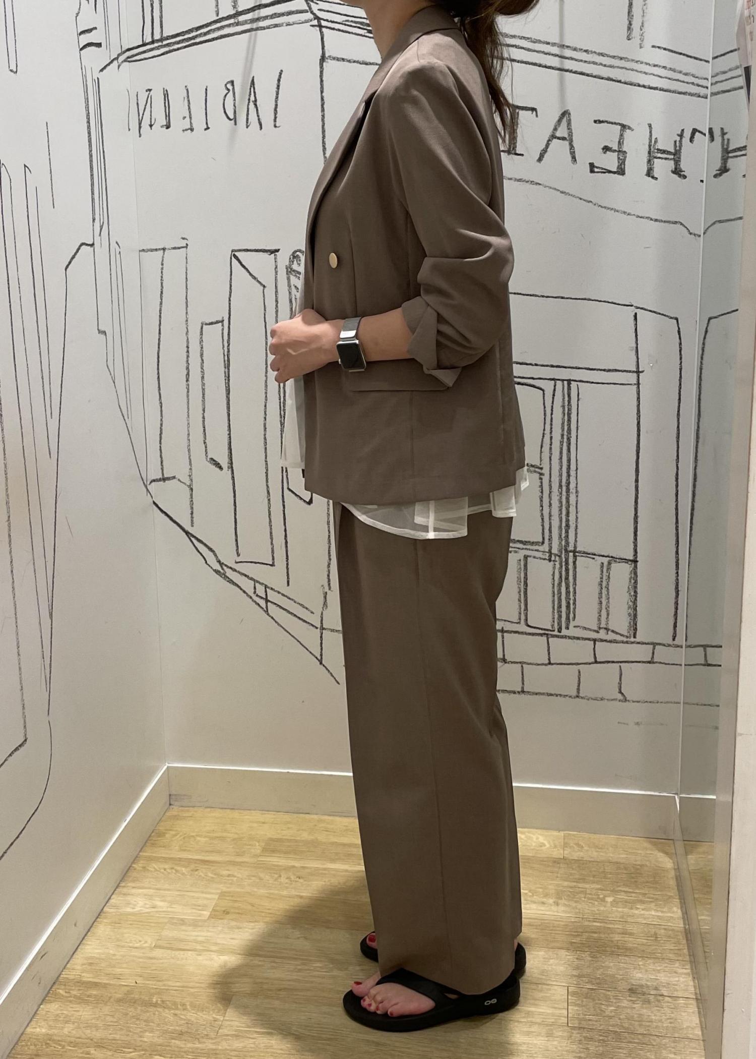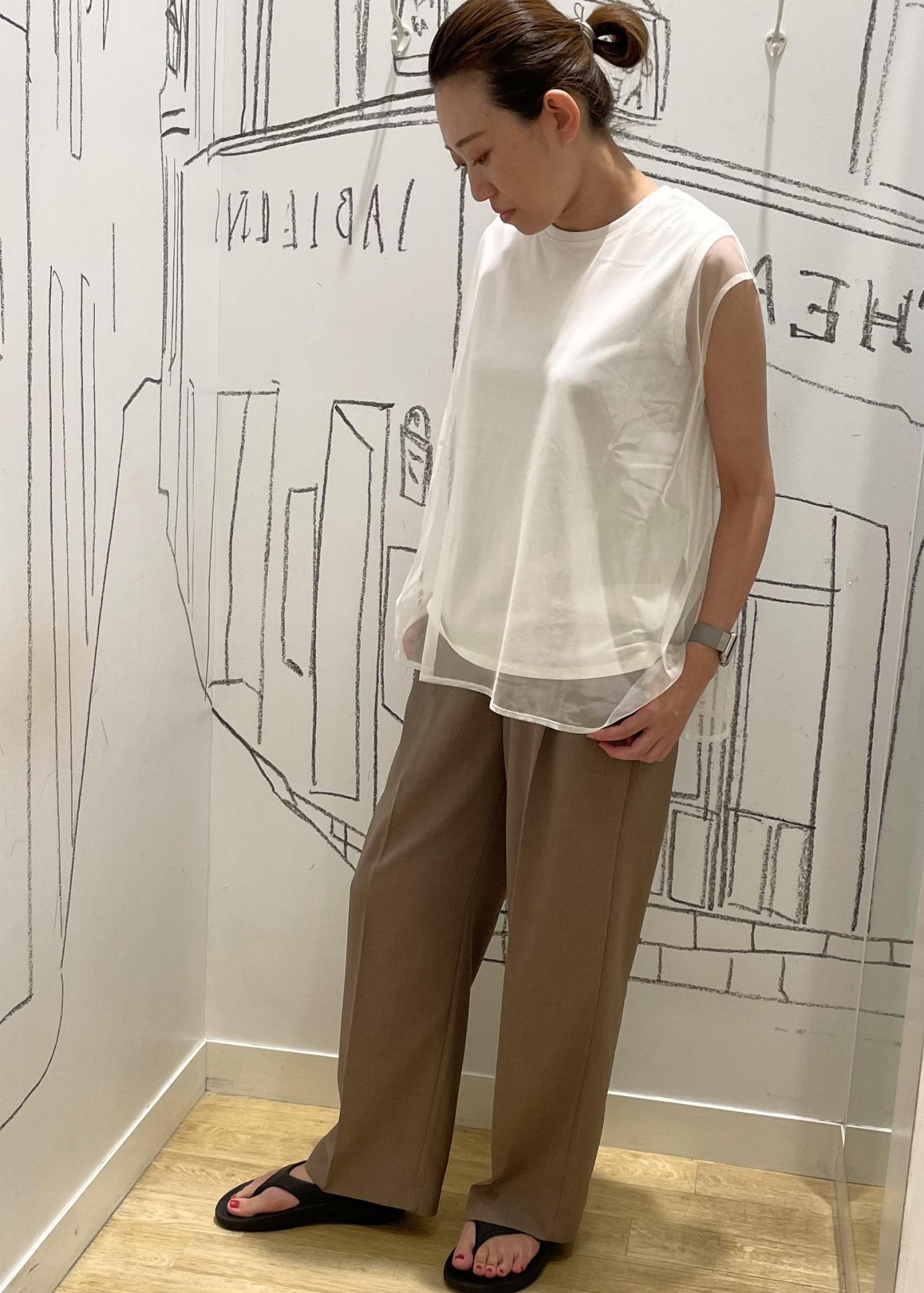ジャケット、パンツは接触冷感の機能性の素材です。足元をパンプスやローファーに変えればオフィスコーデにも◎