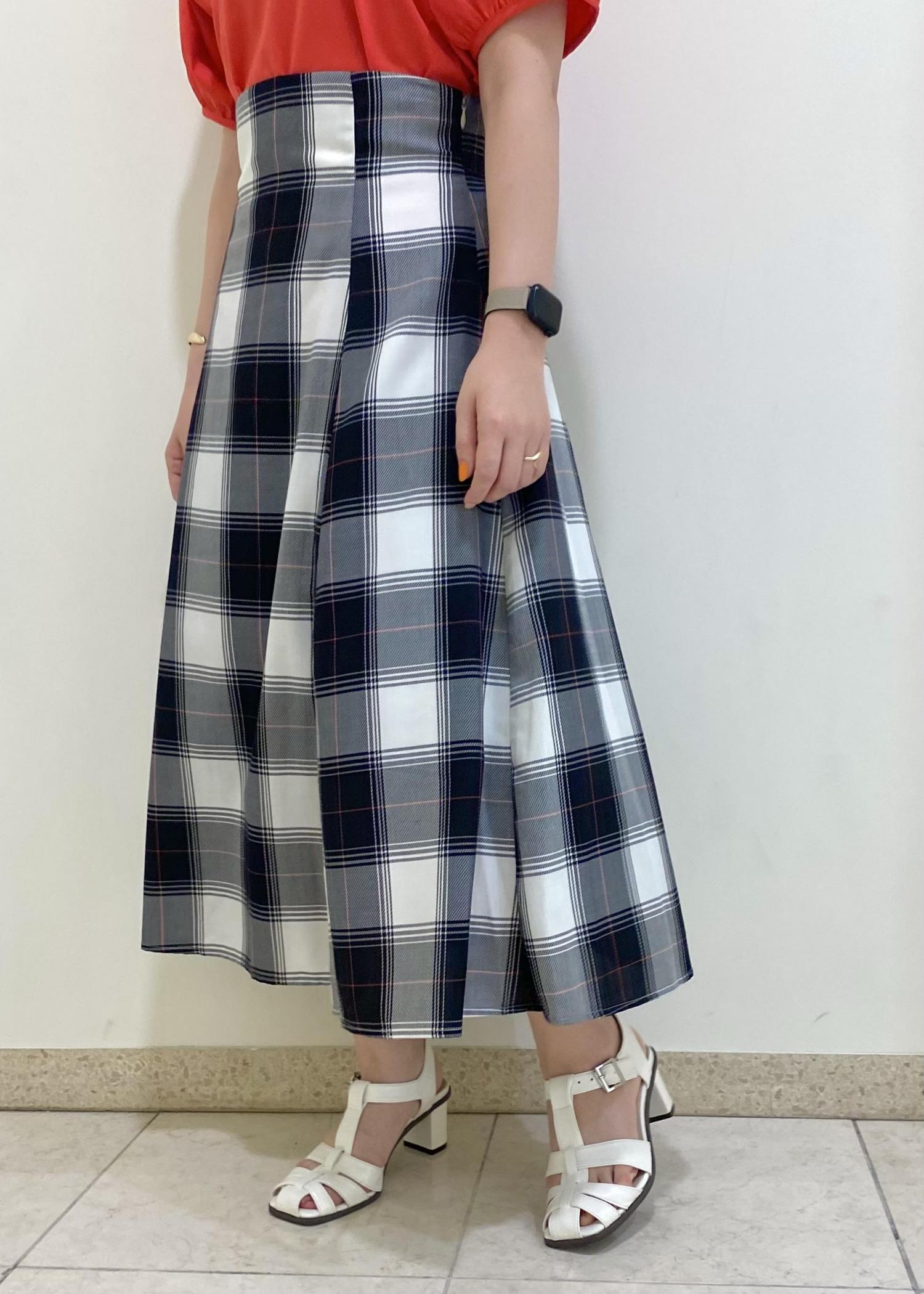 チェック柄の赤のラインとトップスのカラーを合わせてまとまりのあるコーデに。