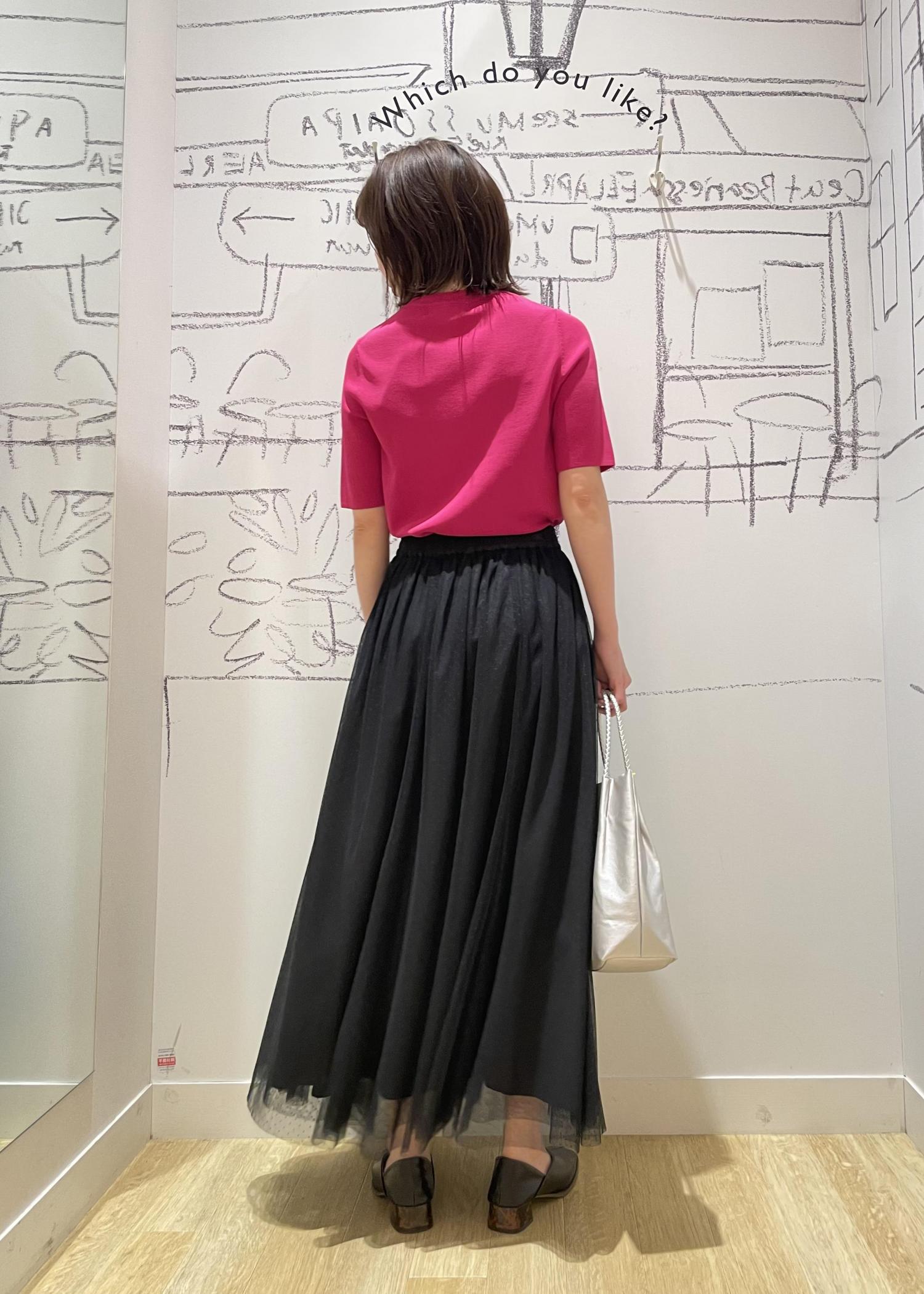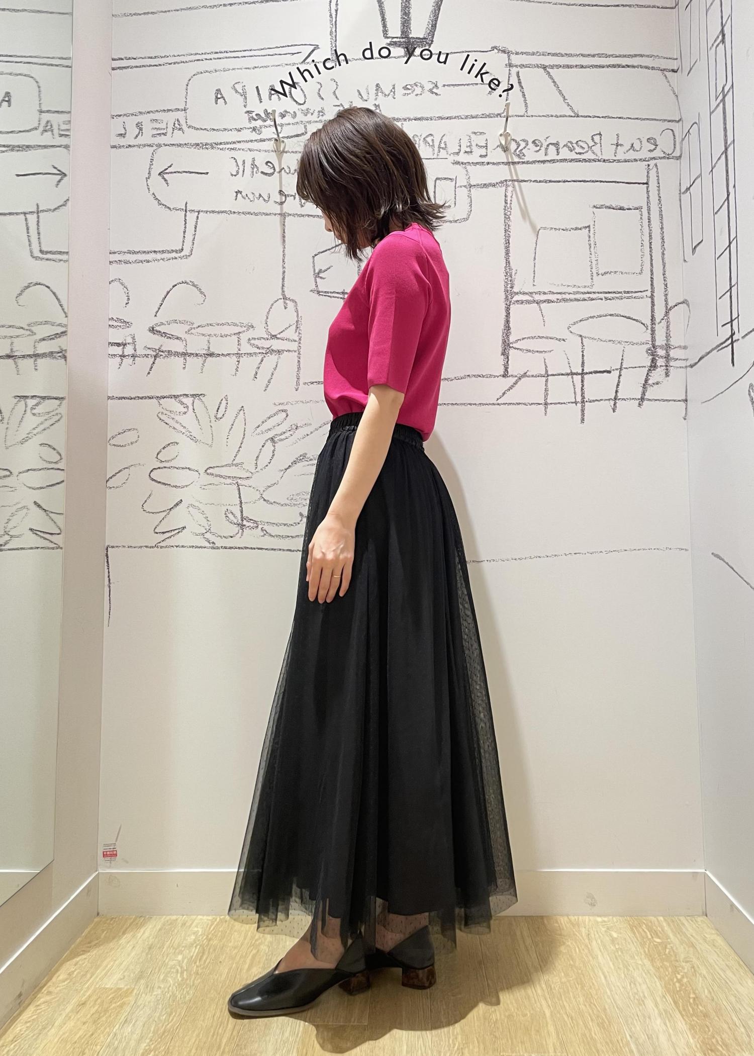 ビビットなピンクのニットに今年らしいチュールスカートを合わせた大人なクラシカルをイメージ。 まだまだ暑い夏ですが 少し秋を先取りしたコーディネートです◎