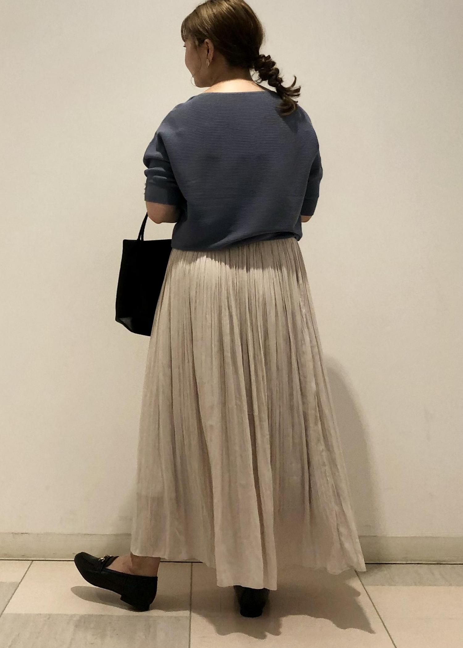 ドルマンスリーブニットに楊柳スカートを合わせ、キレイめなお出かけコーデにしてみました。爽やかなブルーのニットも、小物は黒で合わせることで甘くなりすぎない印象で着ていただけます。