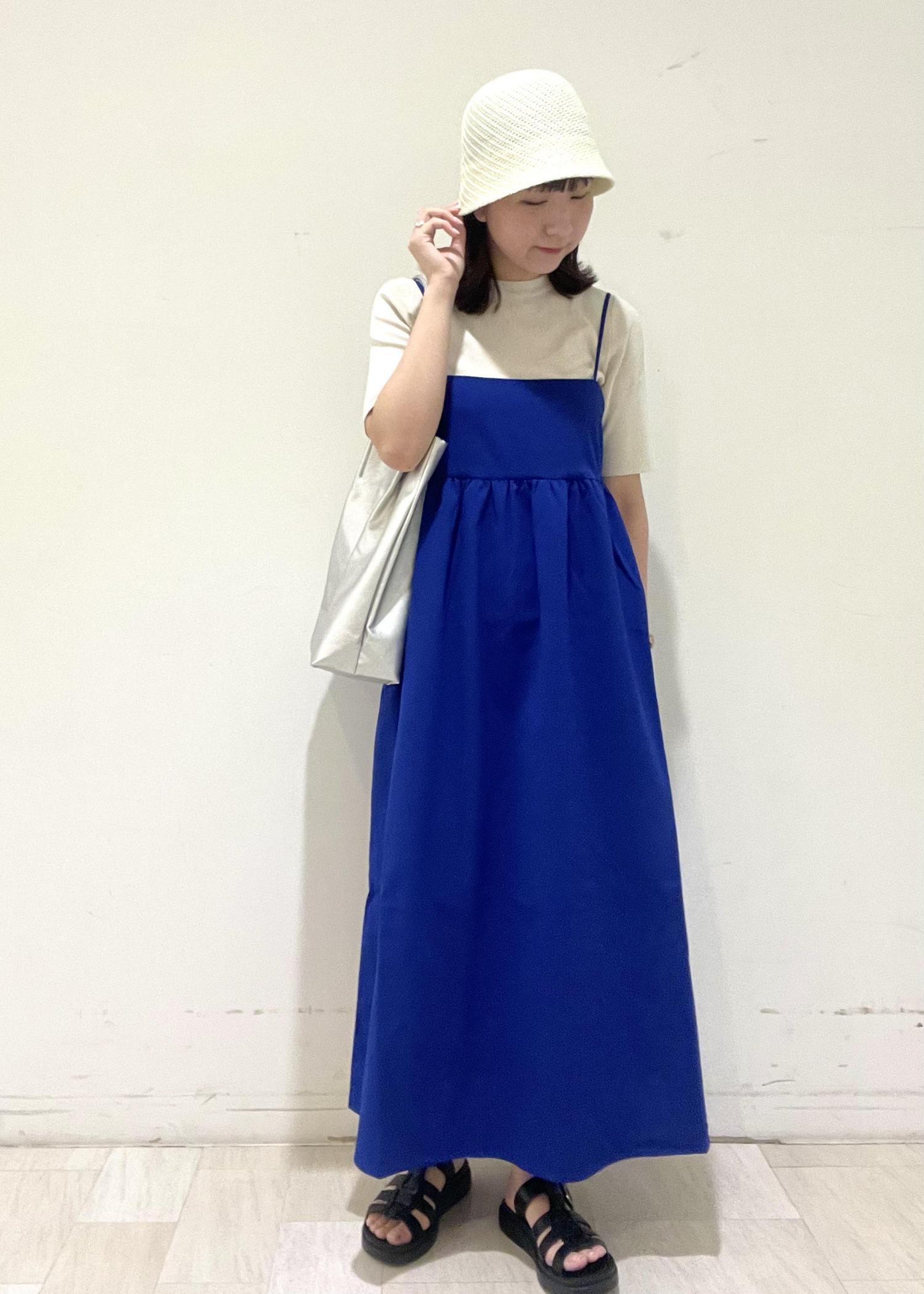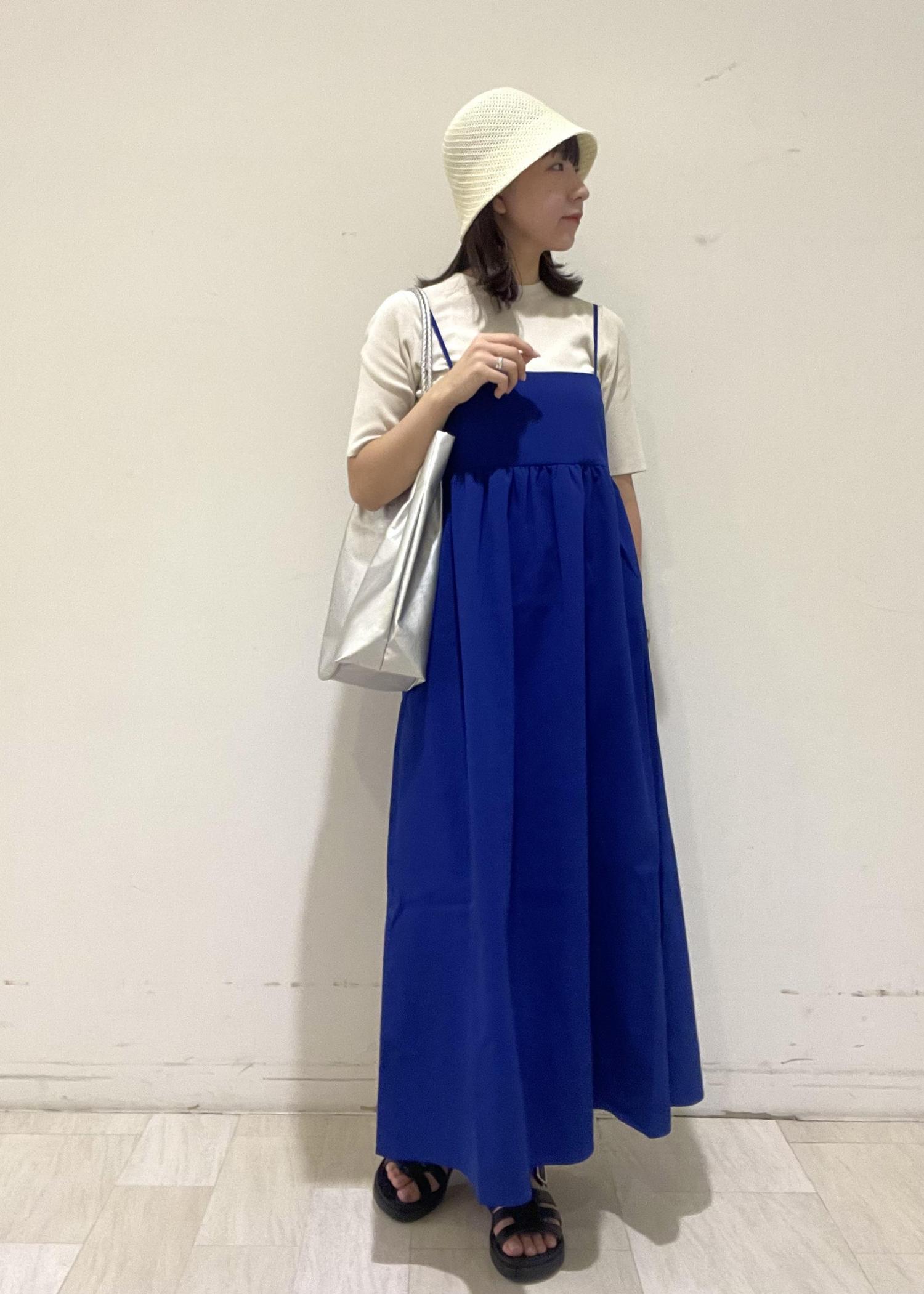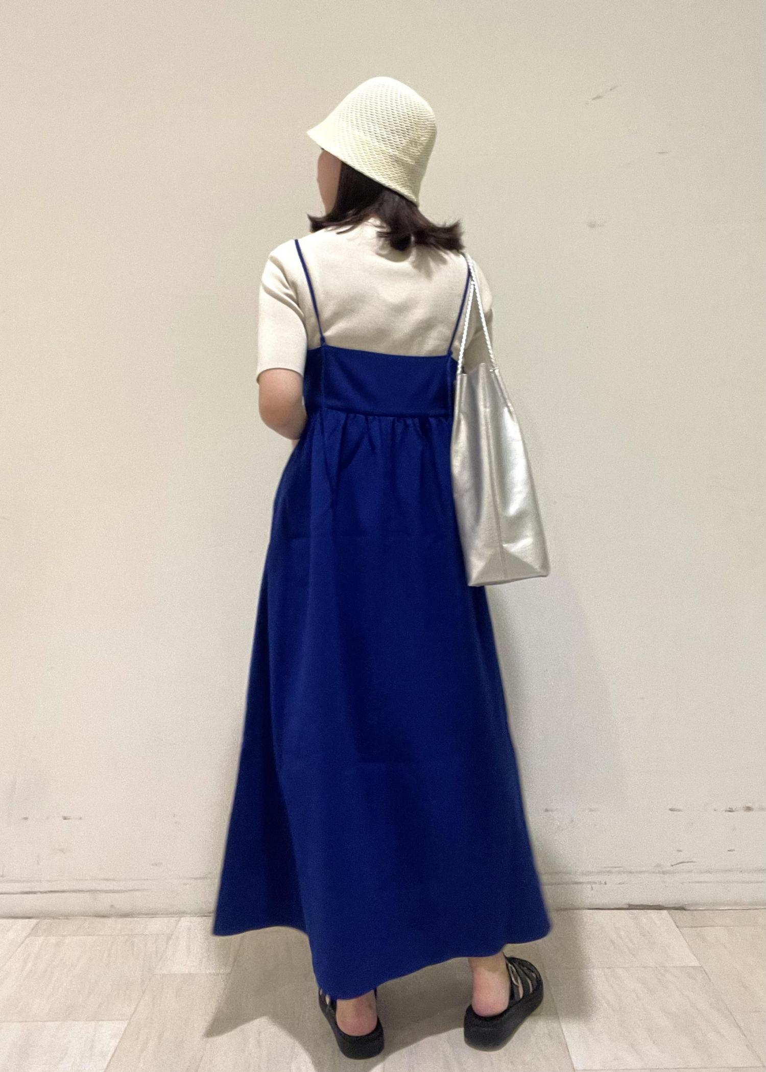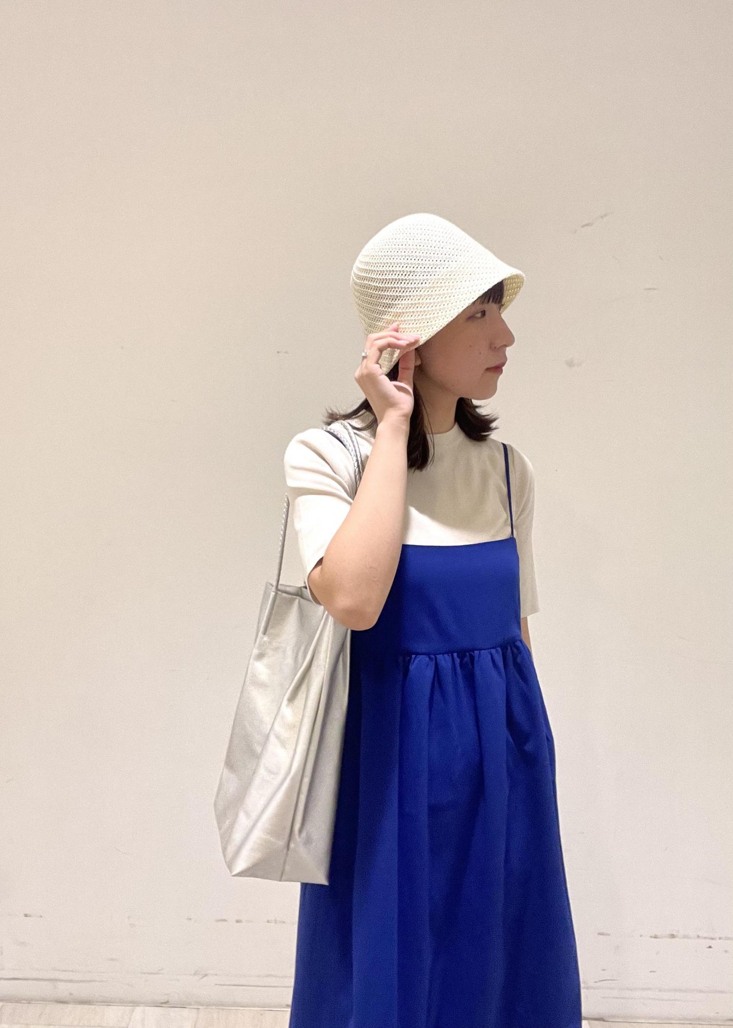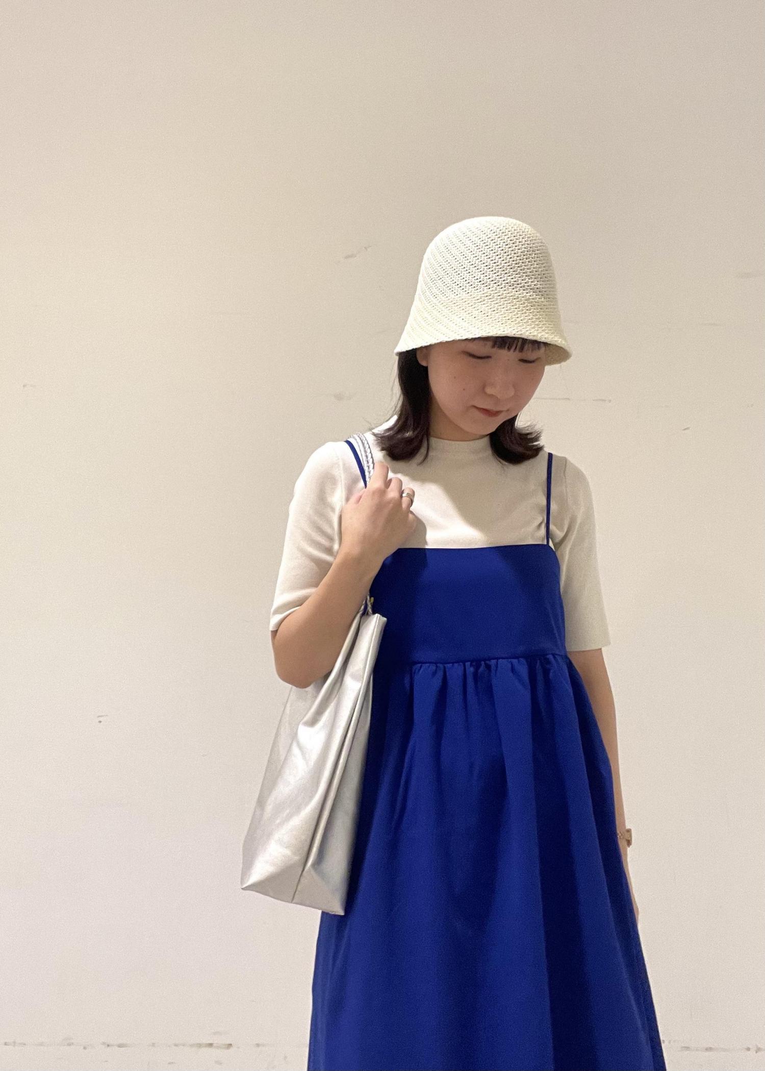 ニットをインナーに合わせて少しキレイめな印象にしました。 バッグはブルーとも相性がよく爽やか見えするシルバーを選んで、全体のブルーが重く見えないように、帽子は白で合わせました。