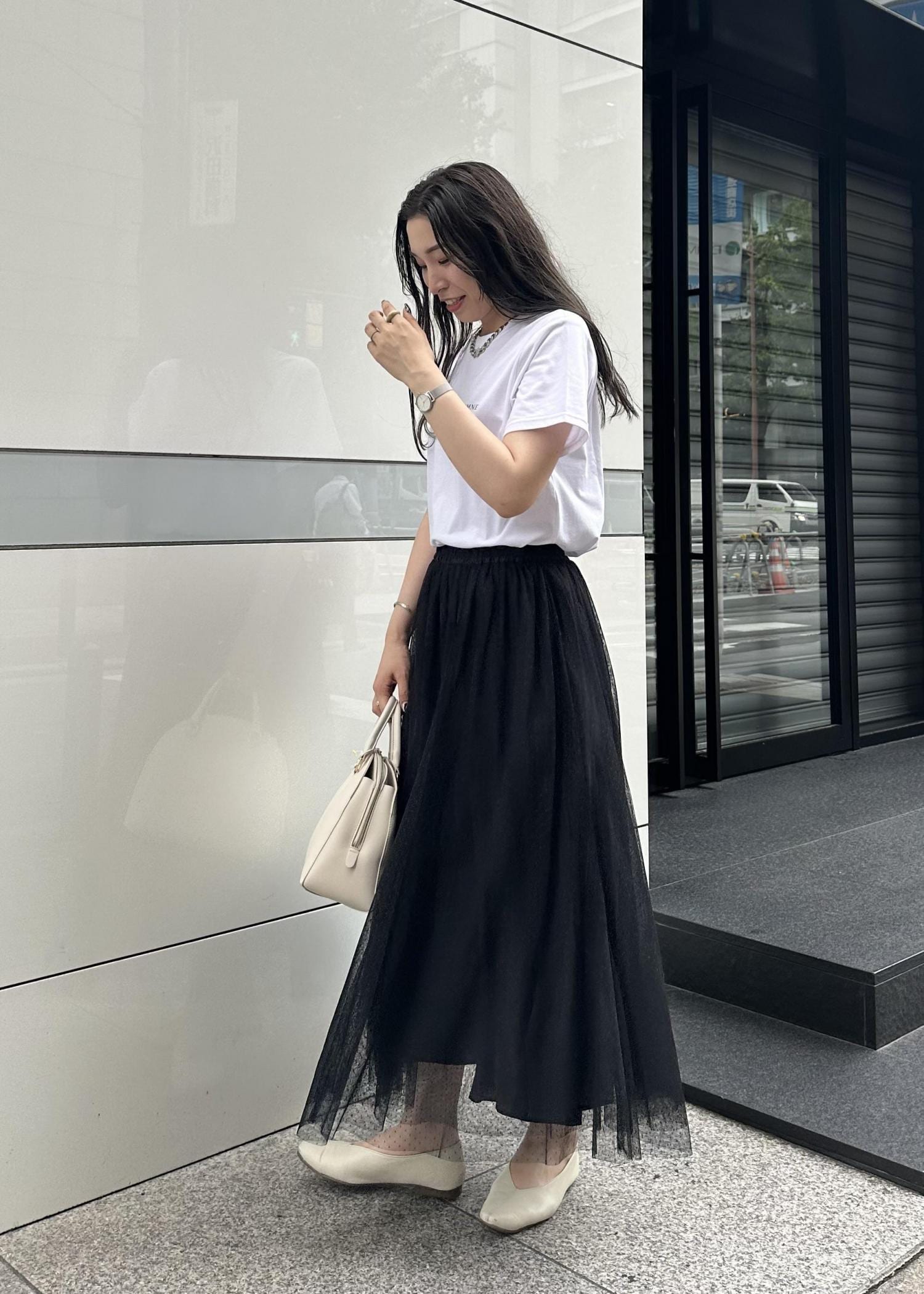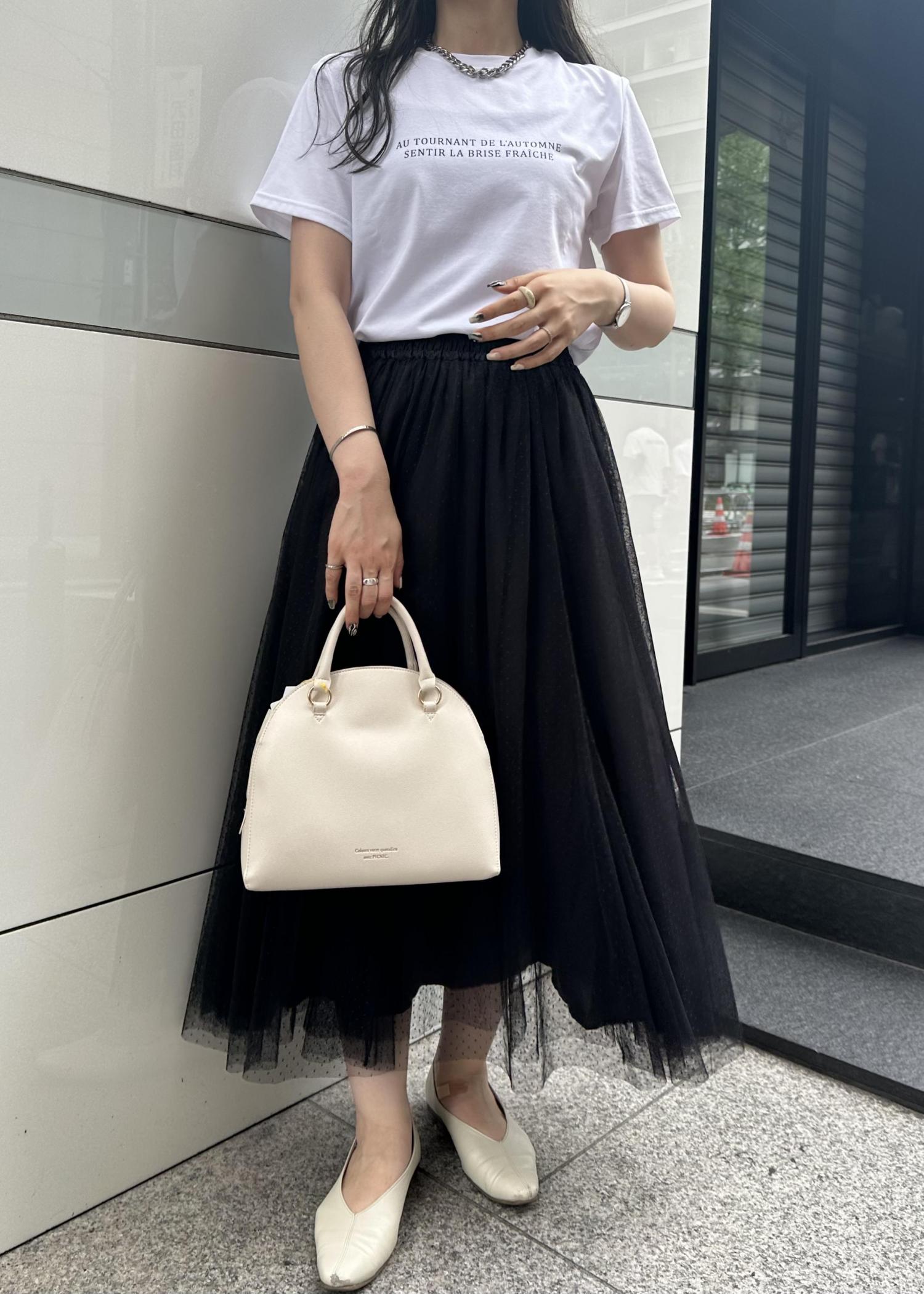 ボトムスはチュールスカートで女性らしい印象に。