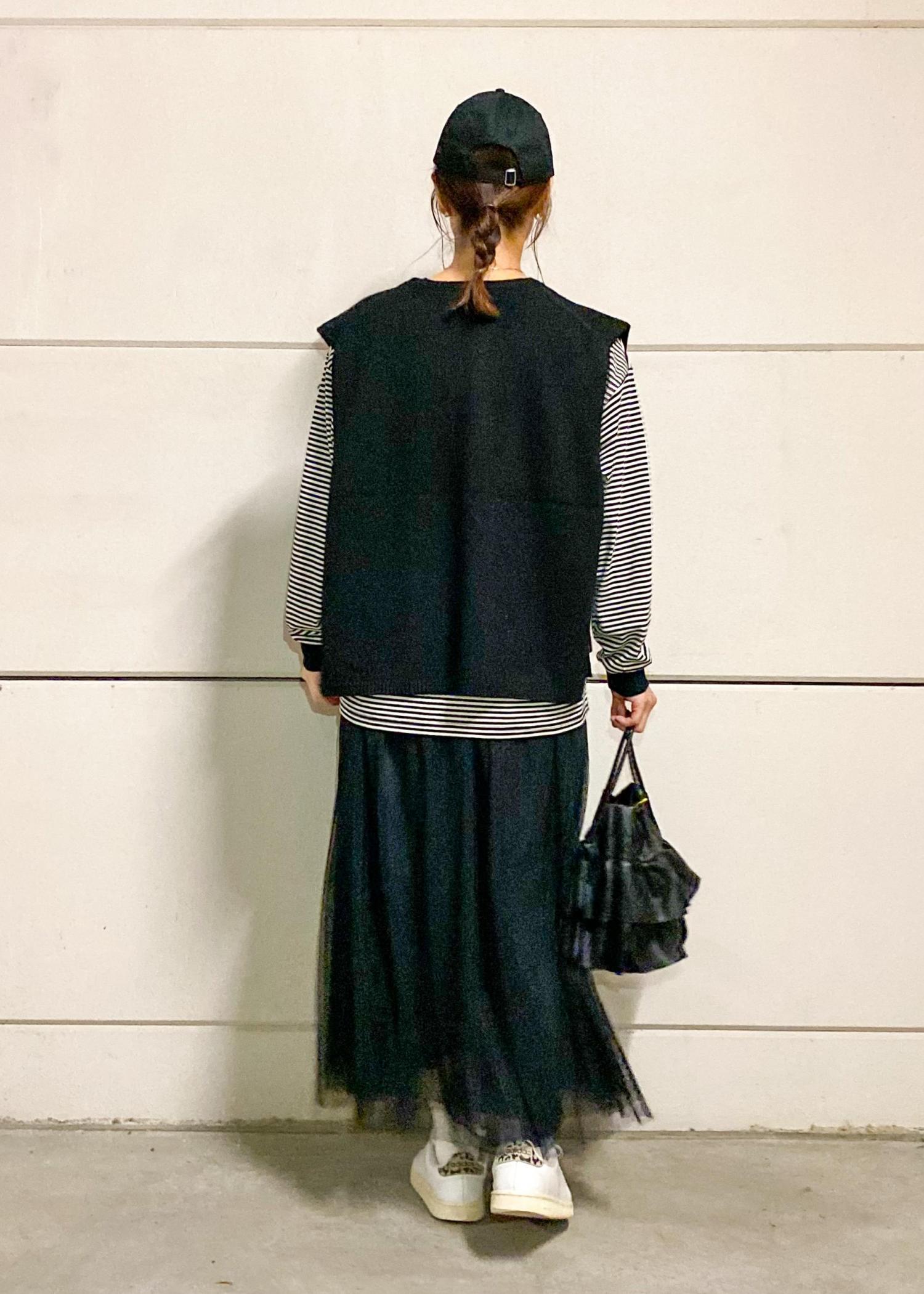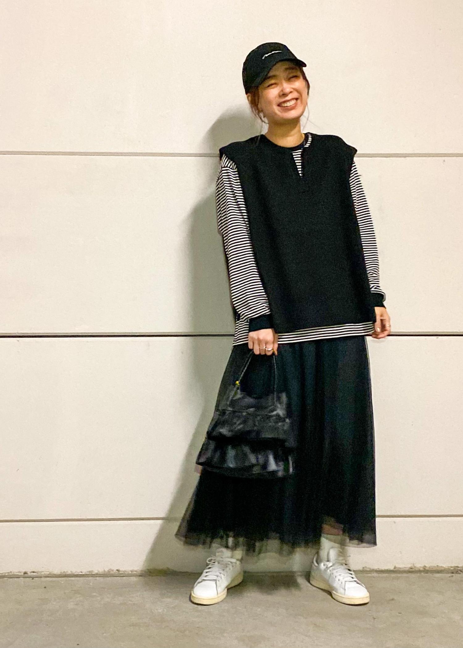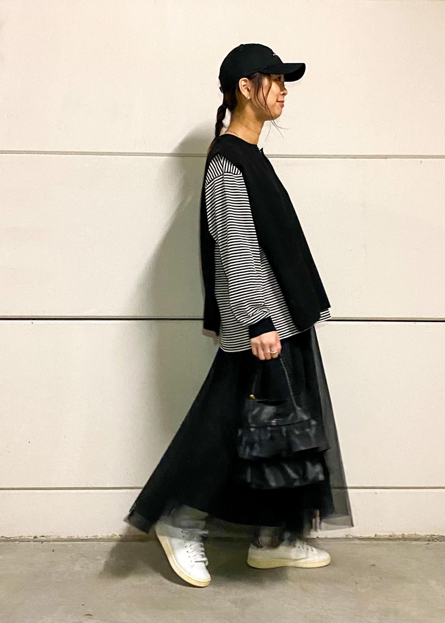 ブラックで統一したカジュアルコーデ。 どカジュアルになりすぎないように、シフォンスカートやフリルバッグで女性らしさも忘れずに。