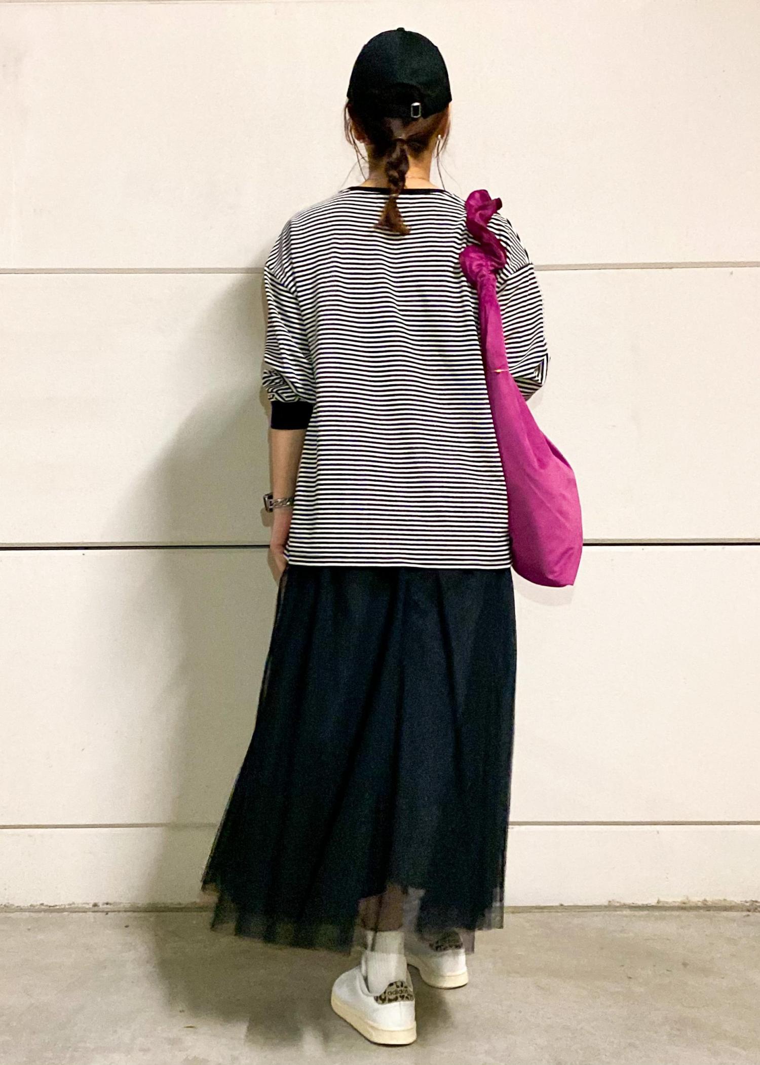 シルエットがかわいいボーダーTを主役に◎ フリルバッグでピンクを差し色にしてみました!