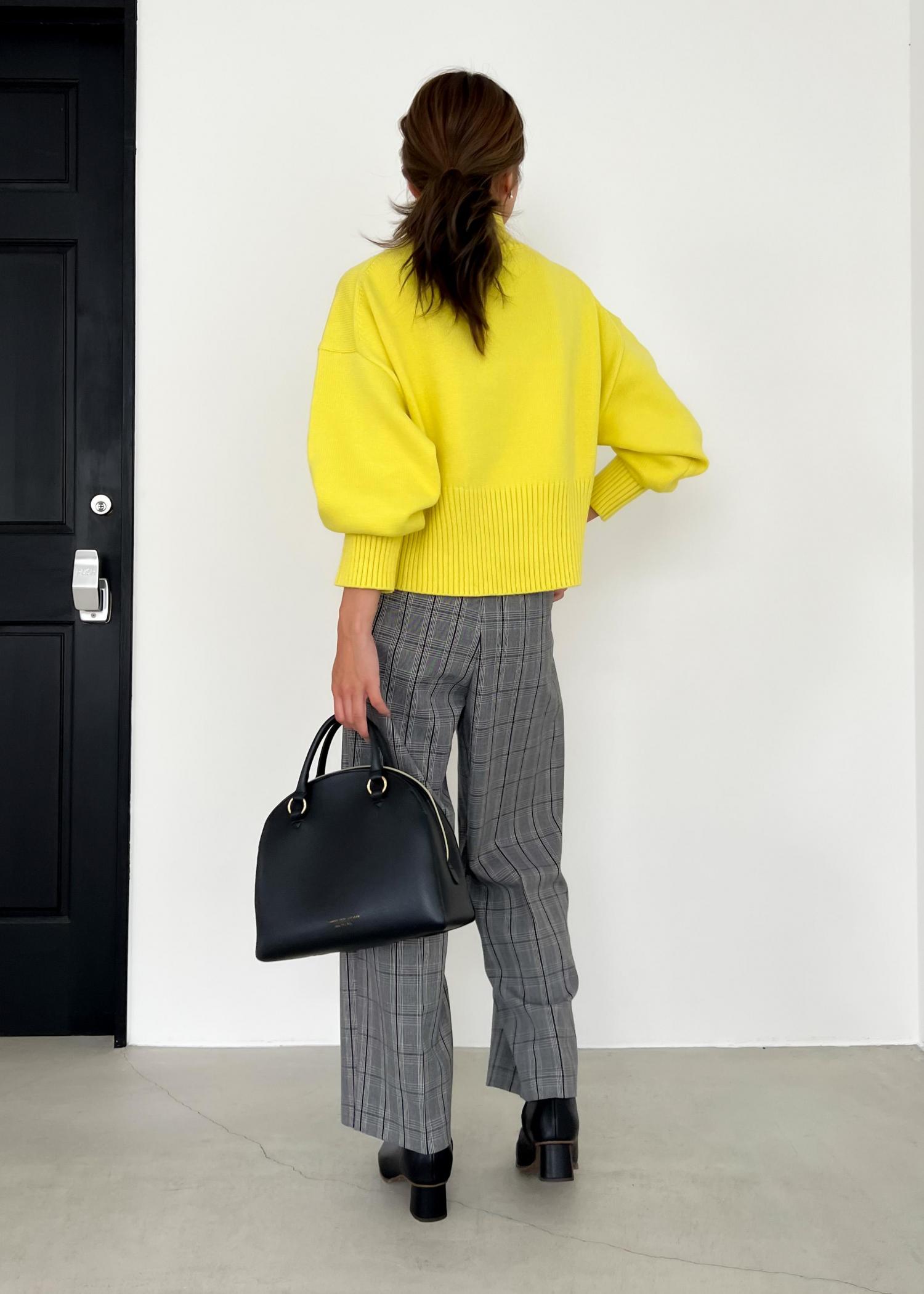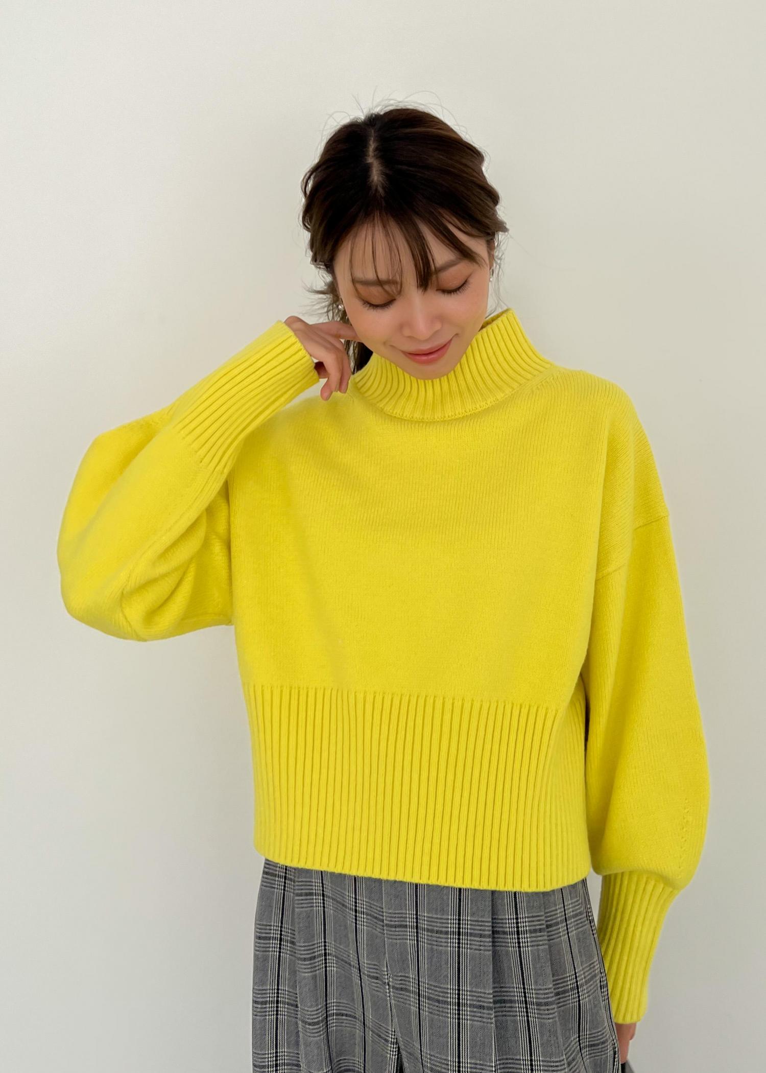 明るいイエローのニットは、柔らかくチクチクしない肌触りで着心地も楽ちん。