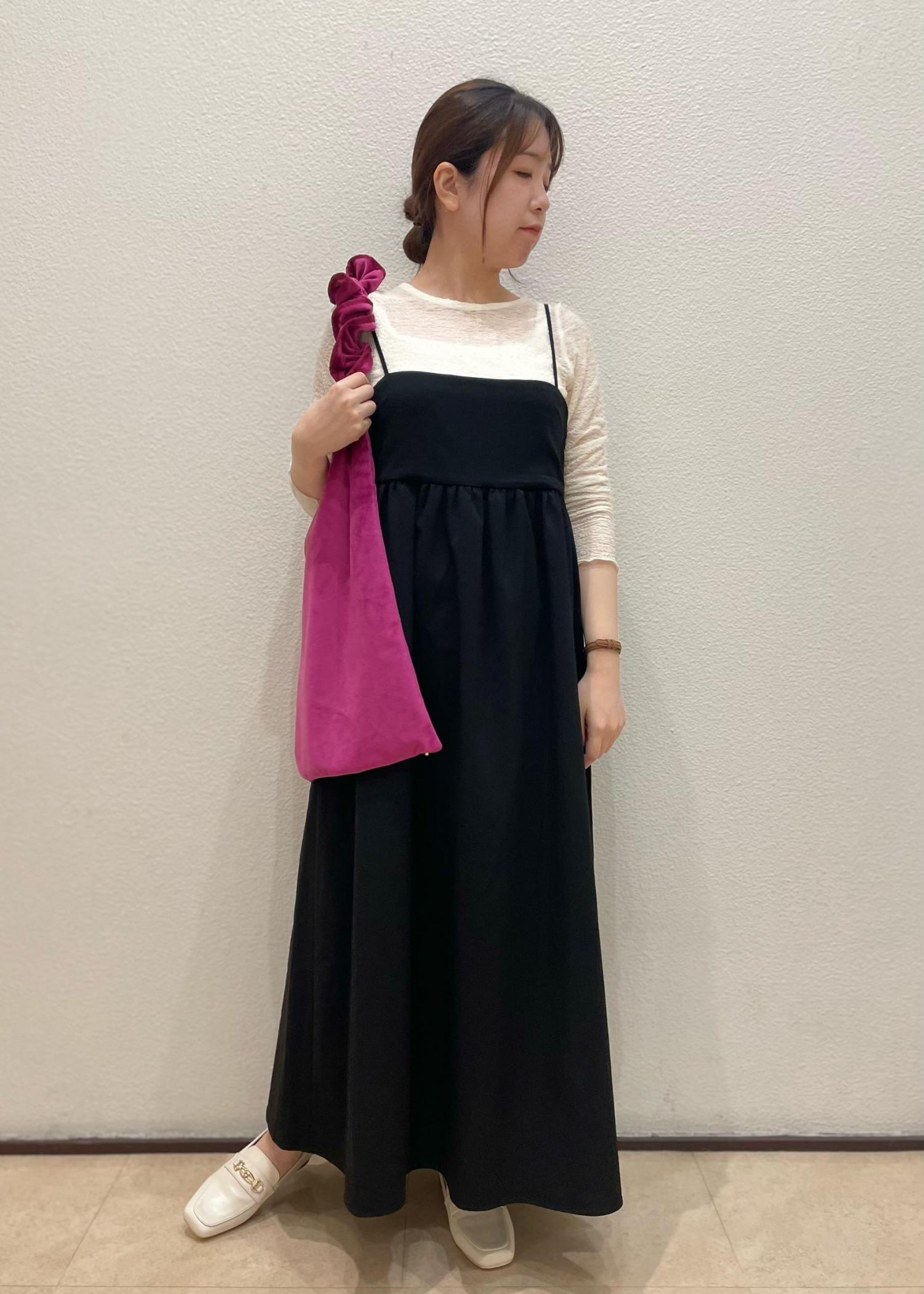 ブラックのシックなワンピースに白のレースデザインのインナーを合わせて上品な印象に仕上げました。 差し色にピンクのバッグを持っていくことでより華やかな印象になります◎