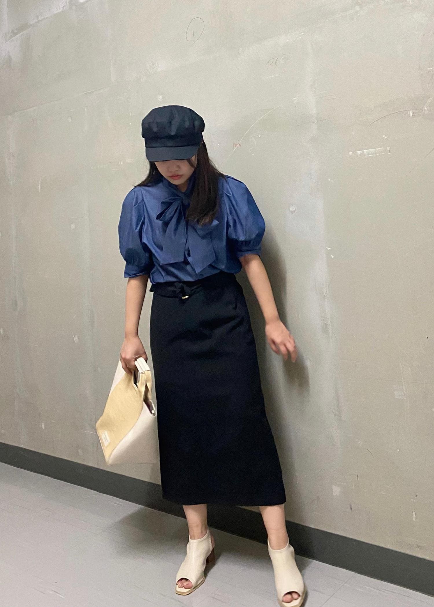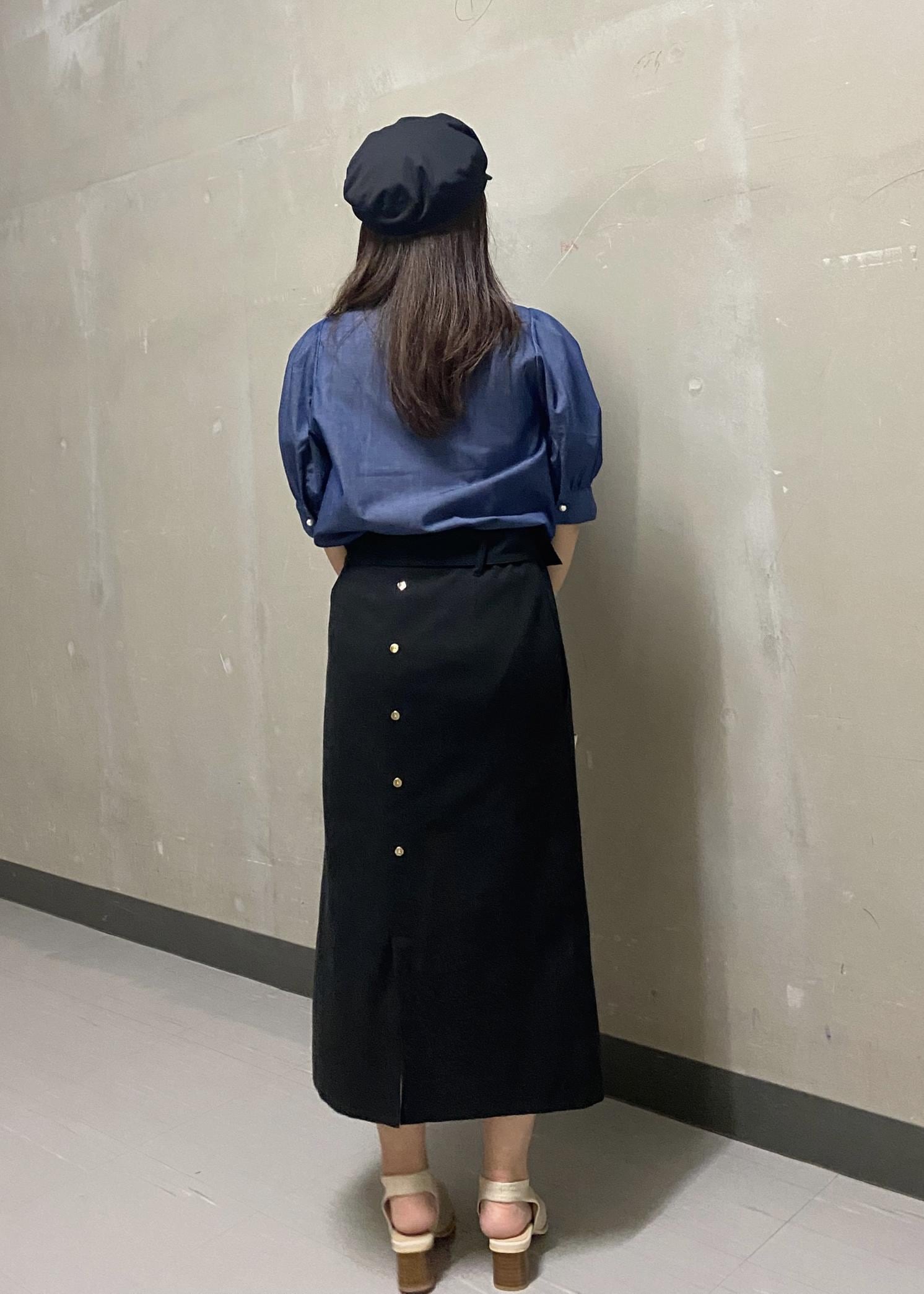タイトスカートと合わせてキレイめなスタイリングにしました。キャスケットでより女性らしい印象に。ポイントのブラウスはジャケットと合わせて秋にも着回し抜群アイテムです◉
