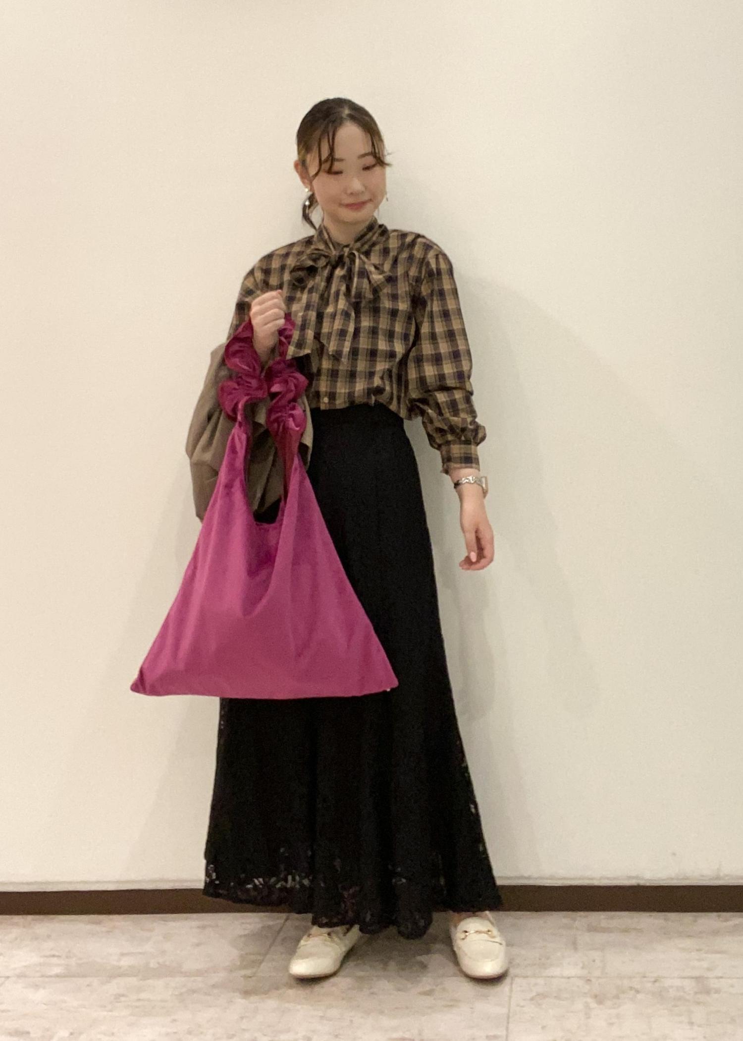 ブラウンとブラックでまとめ、秋らしいコーディネートにしました。カラーのベロアバッグが、コーディネートのアクセントになります。