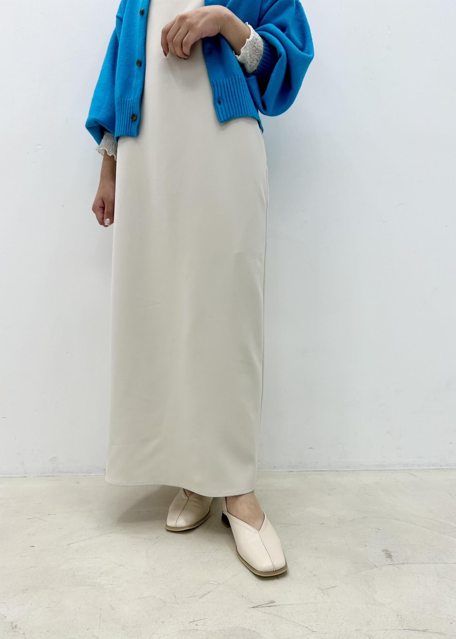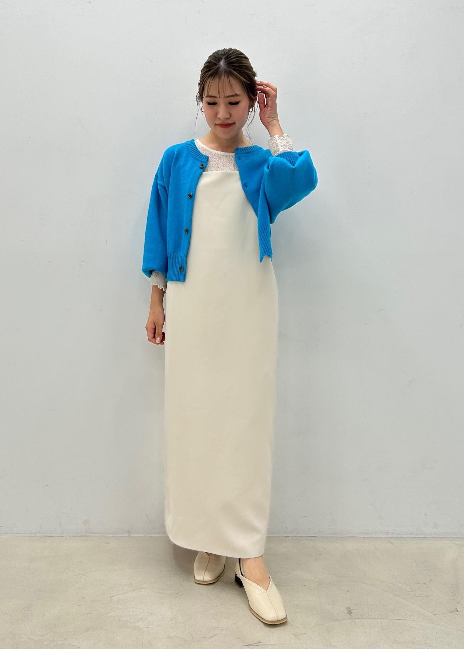 肩紐で長さの調節ができるため低身長さんでもフラットシューズで着れる丈感でした。