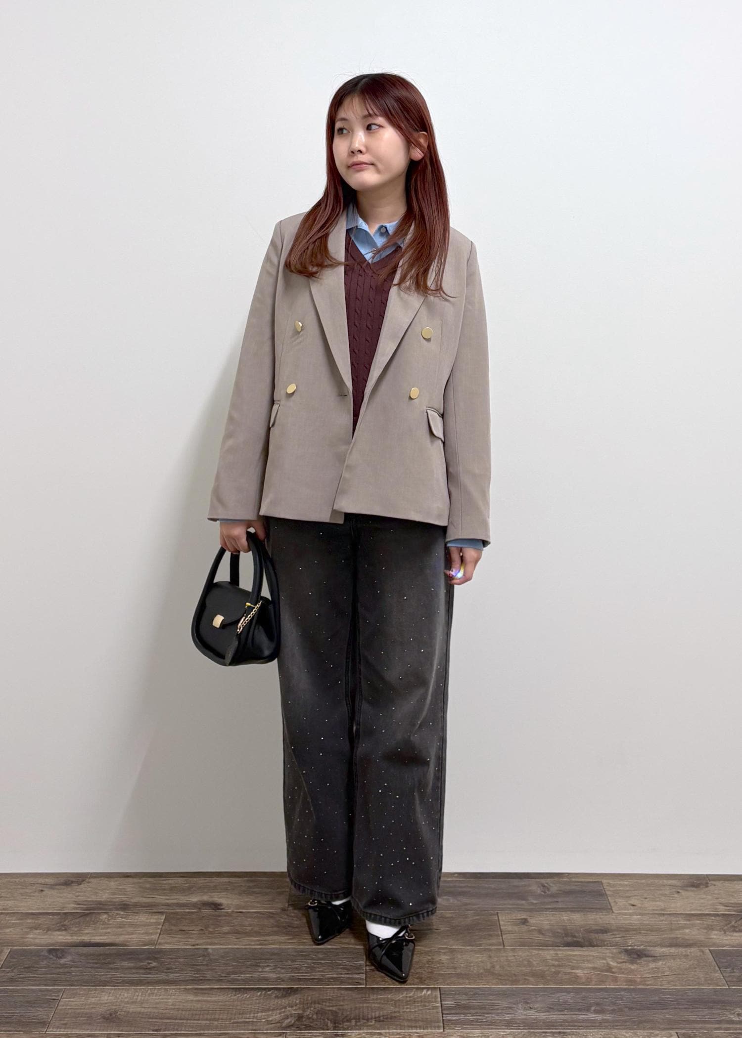 落ち着いた色味で合わせているので、バッグはピンクにしてワンポイントに…!