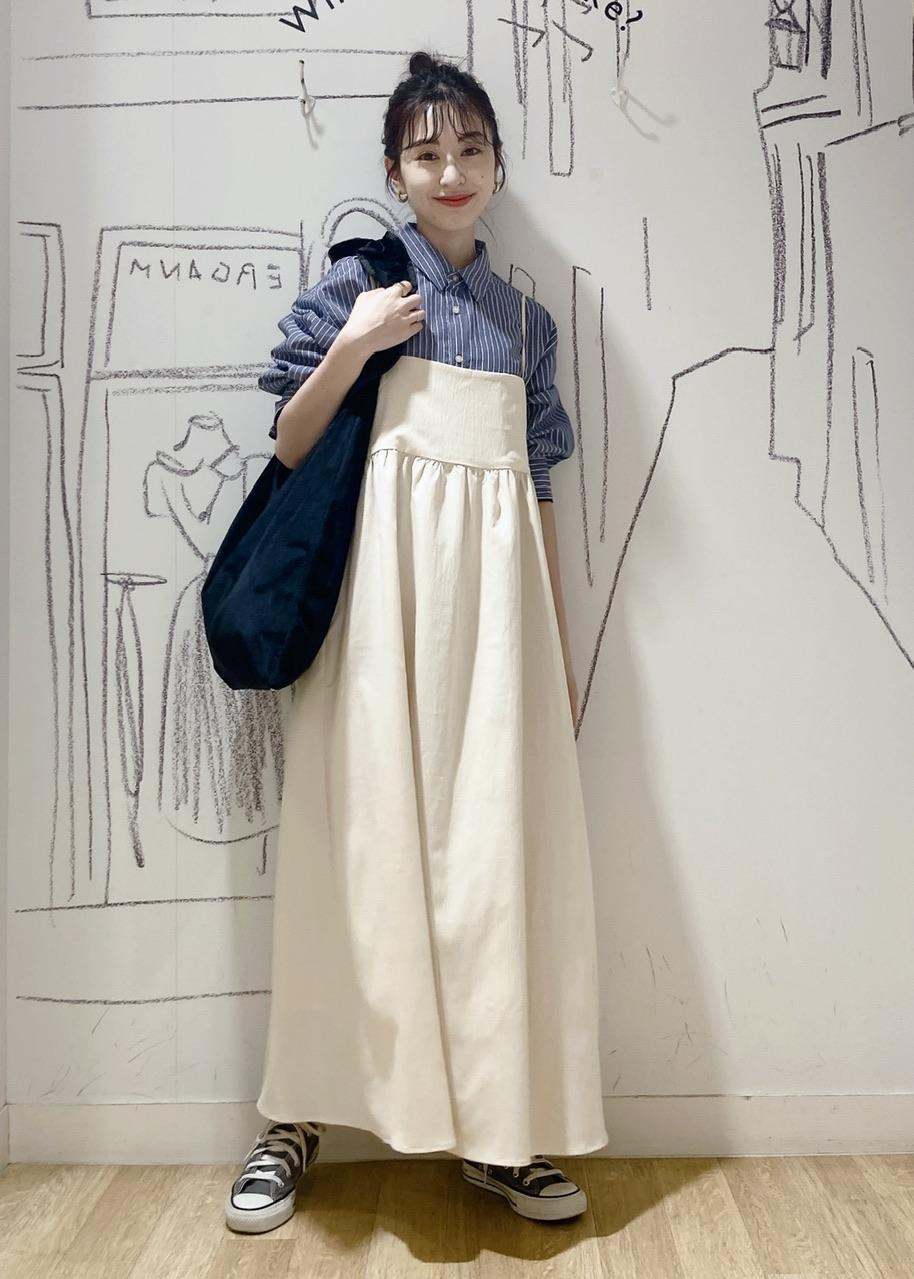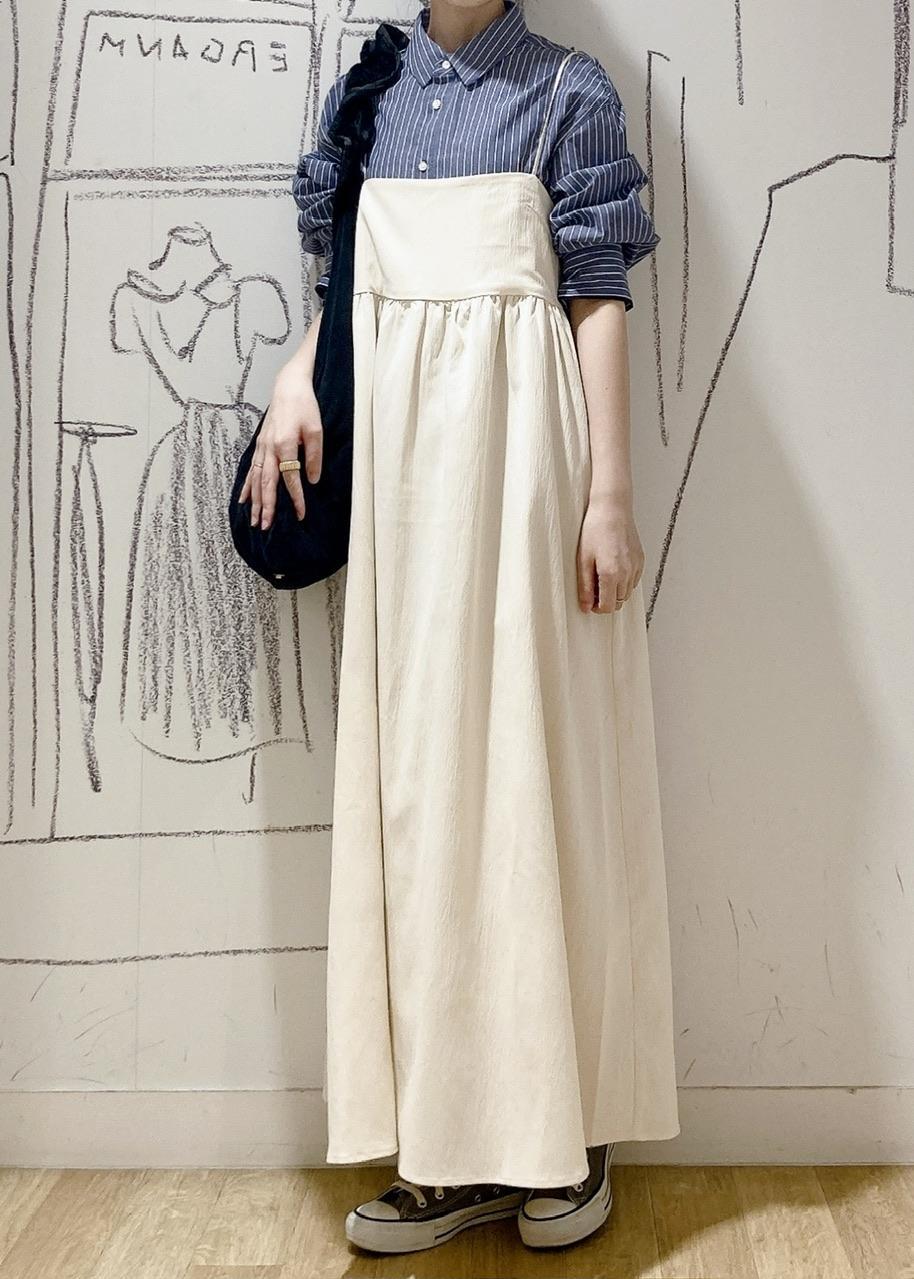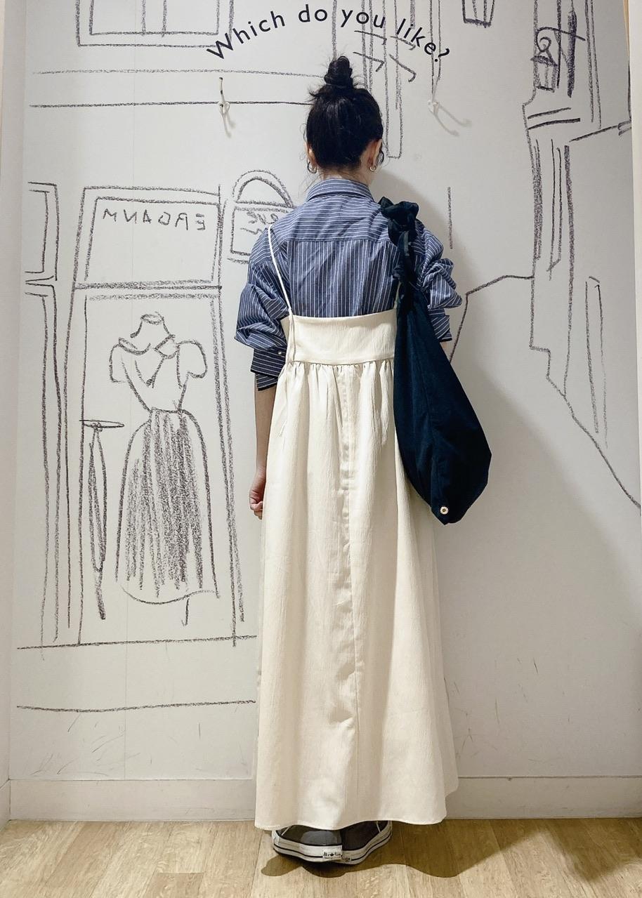 ブルー×ホワイトカラーの ストライプシャツは気映え抜群なアイテム。 今回はキャミワンピのインナーとして 着る事で大人カジュアルな スタイルにしました。