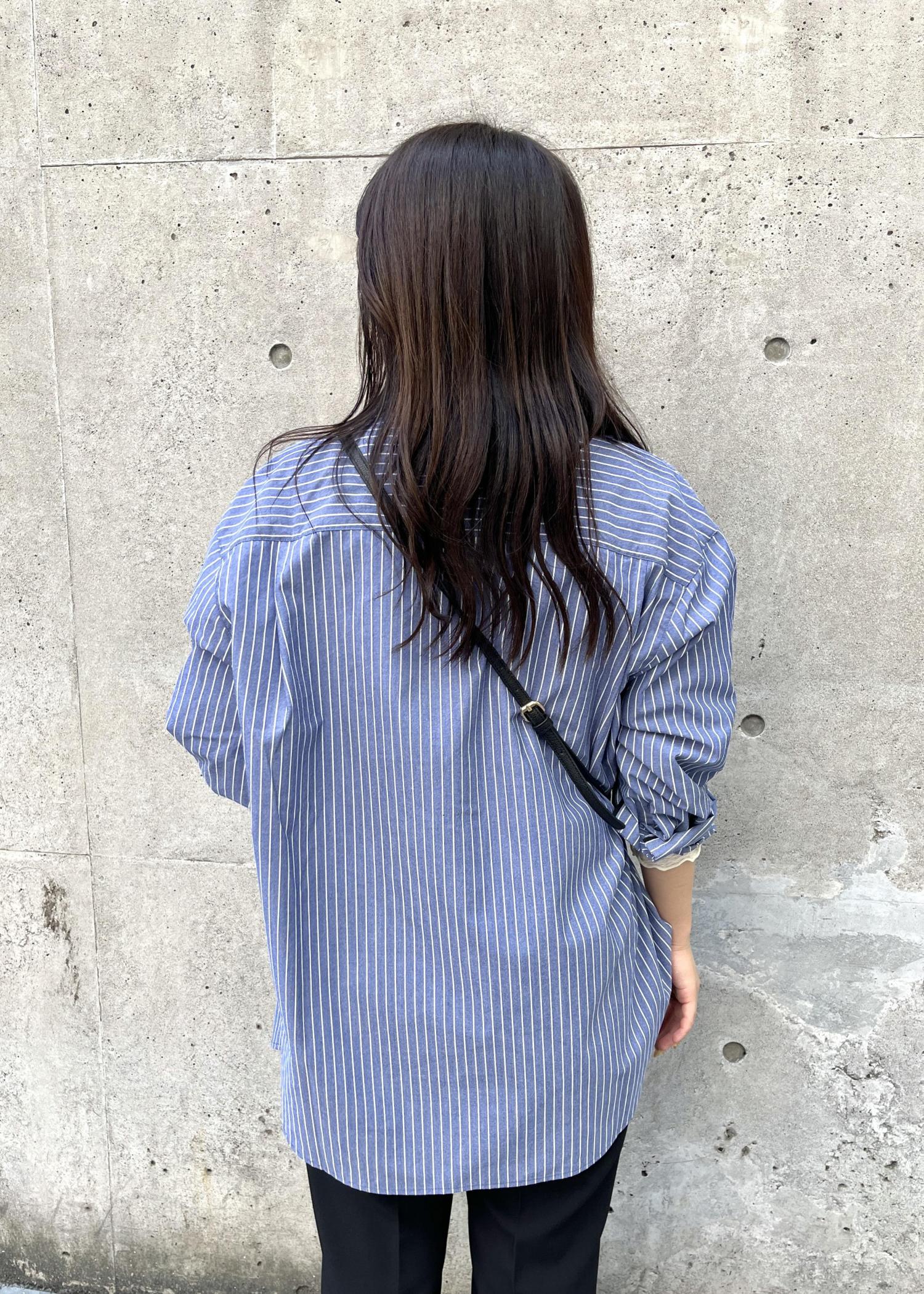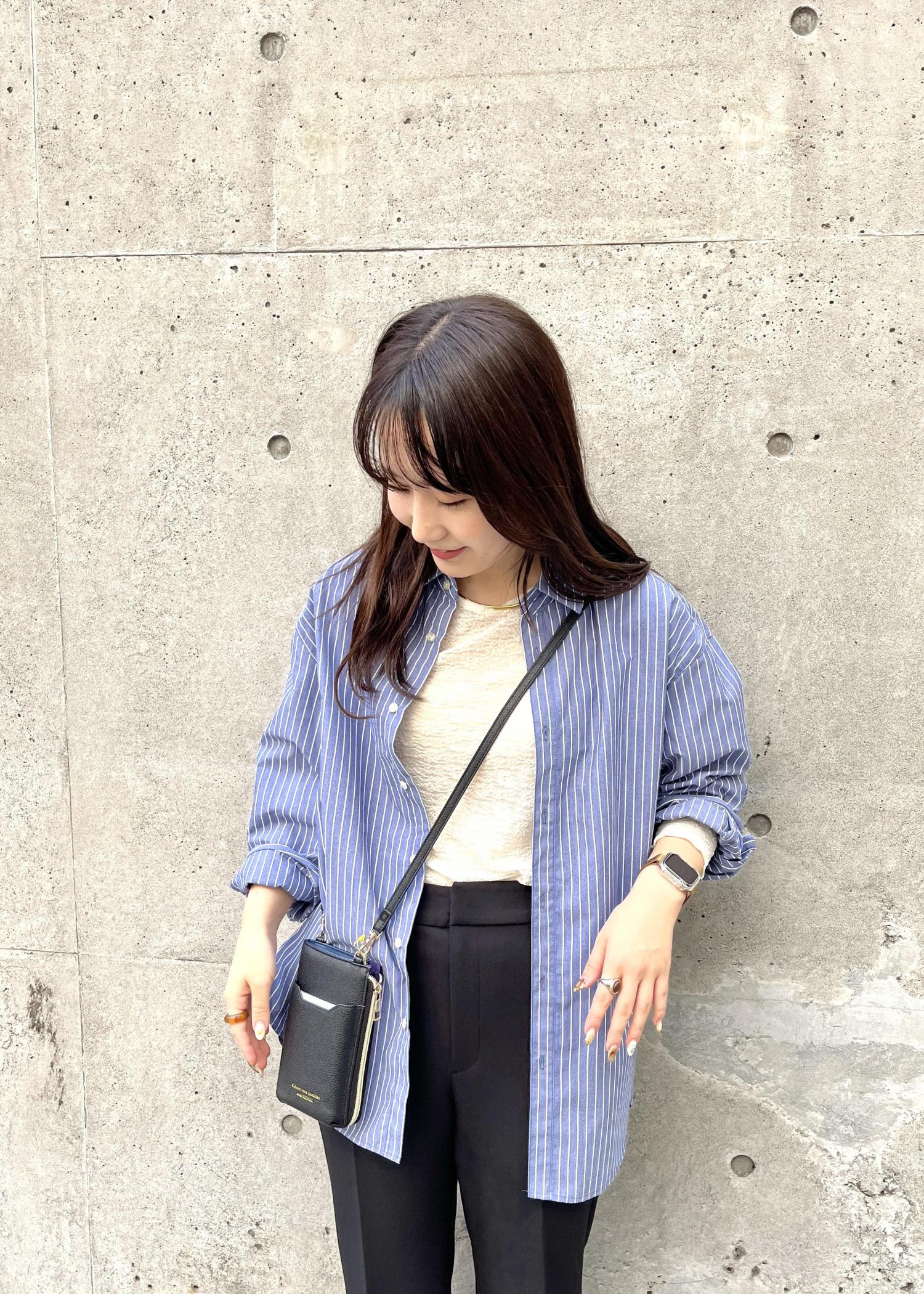 キレイめカジュアルスタイル。ストライプが存在感あるシャツは、生地感がしっかりしているので今の時期はシアーインナーを中に合わせて着るのがオススメです。