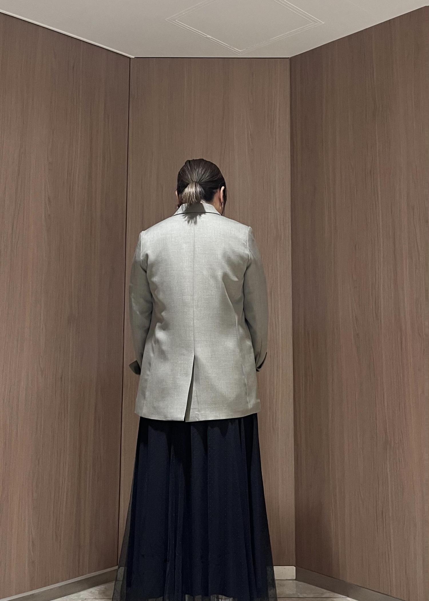 ジャケットのインナーにロゴTシャツを合わせたキレイめカジュアルコーデ。 チュールスカートは黒を合わせてお出かけスタイルに。