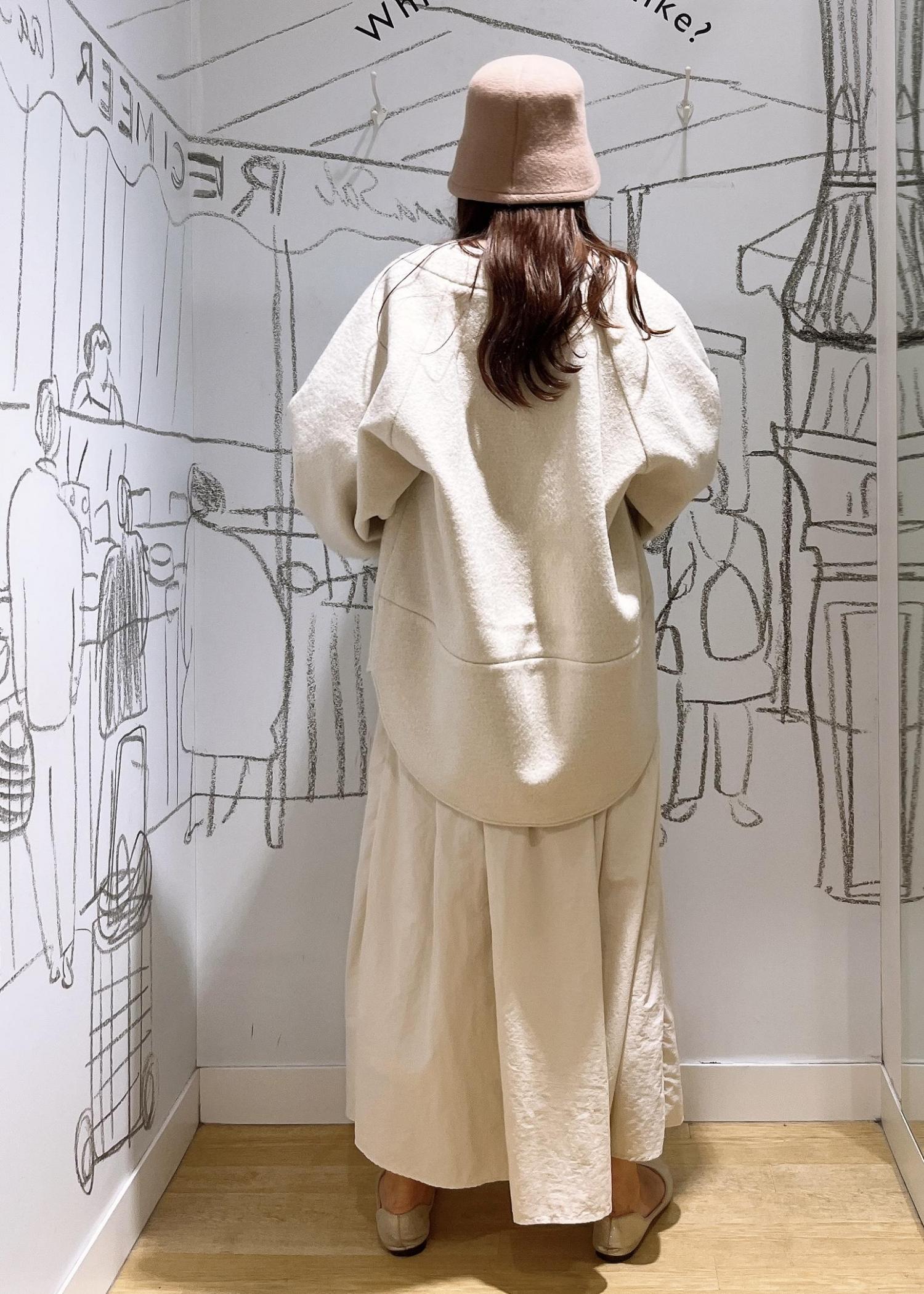 秋オススメのジャージメルトンコートカーディガン♪アイボリーのワンピースと合わせて、全体的に明るめのコーディネートになっています♪