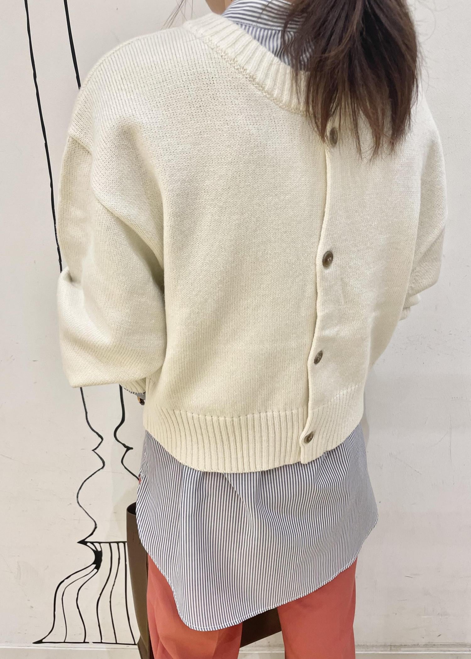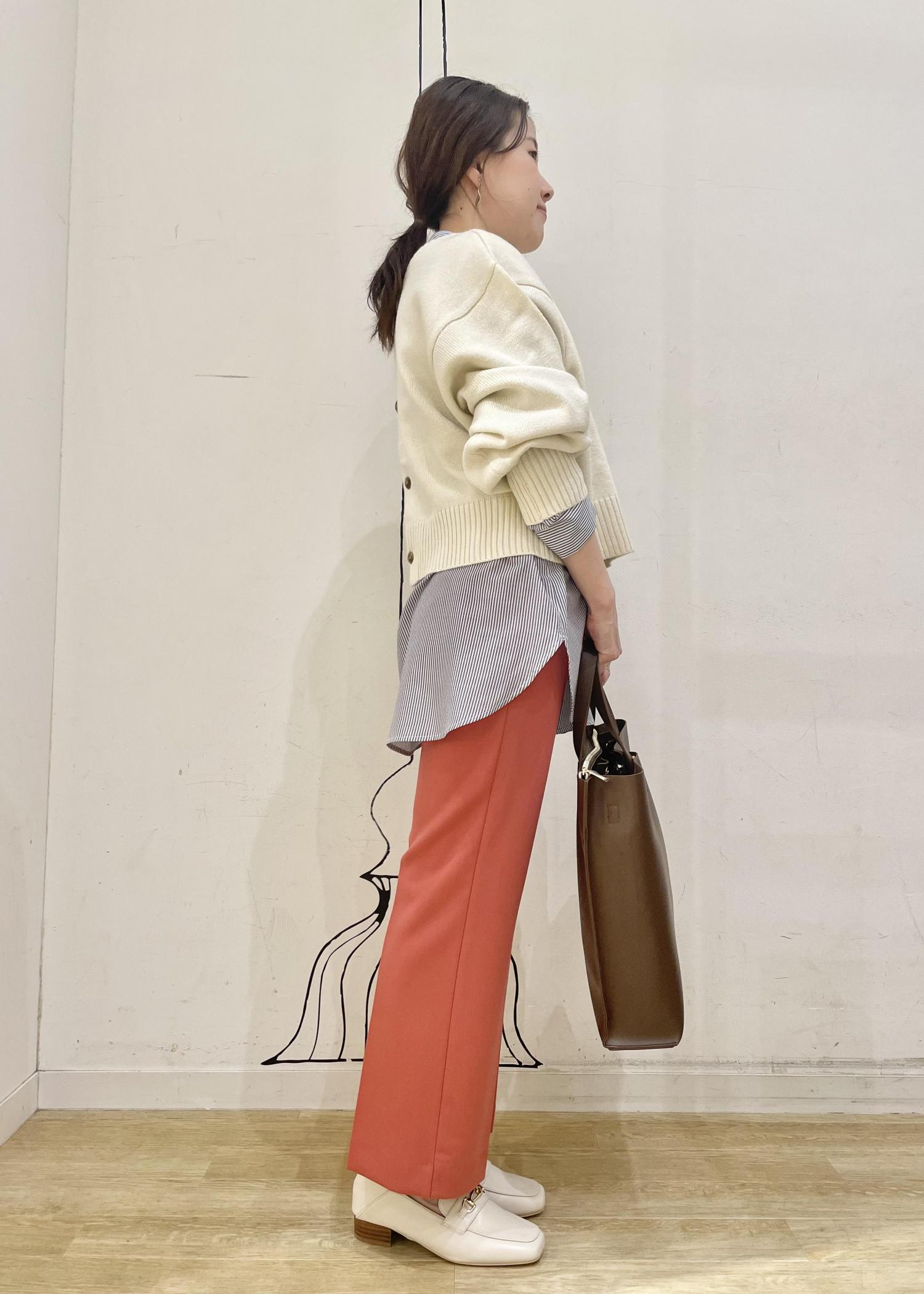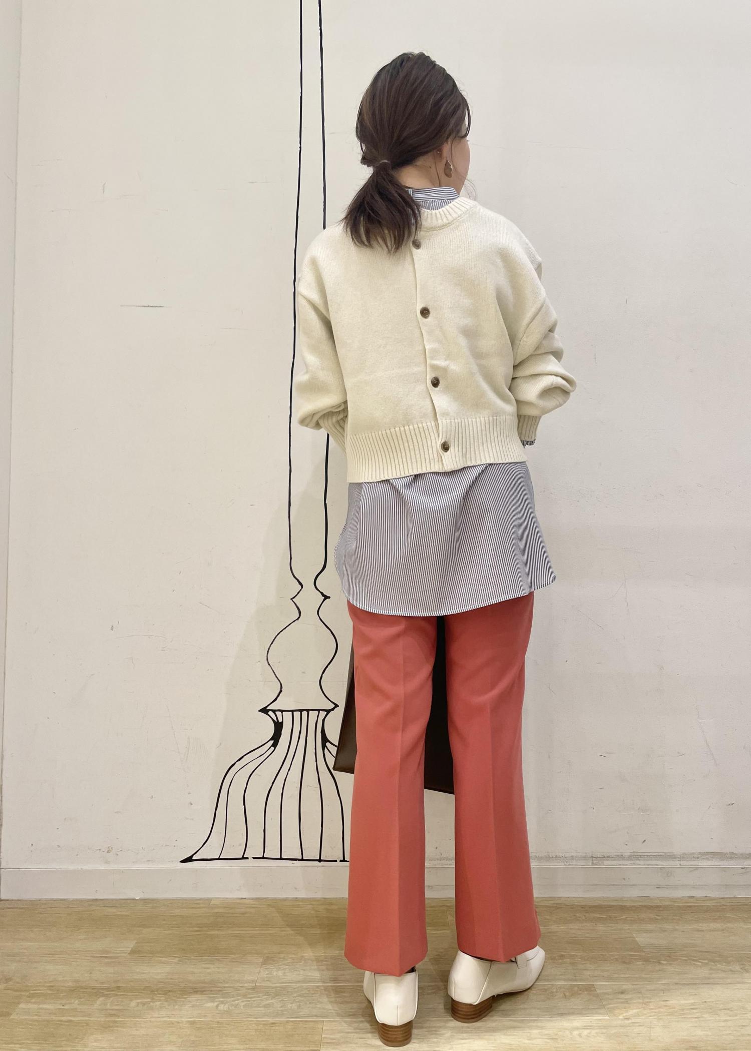 前後2wayで着れるカーディガンをボタンを後ろにしてニットとして着用し、シャツをレイヤードしました。