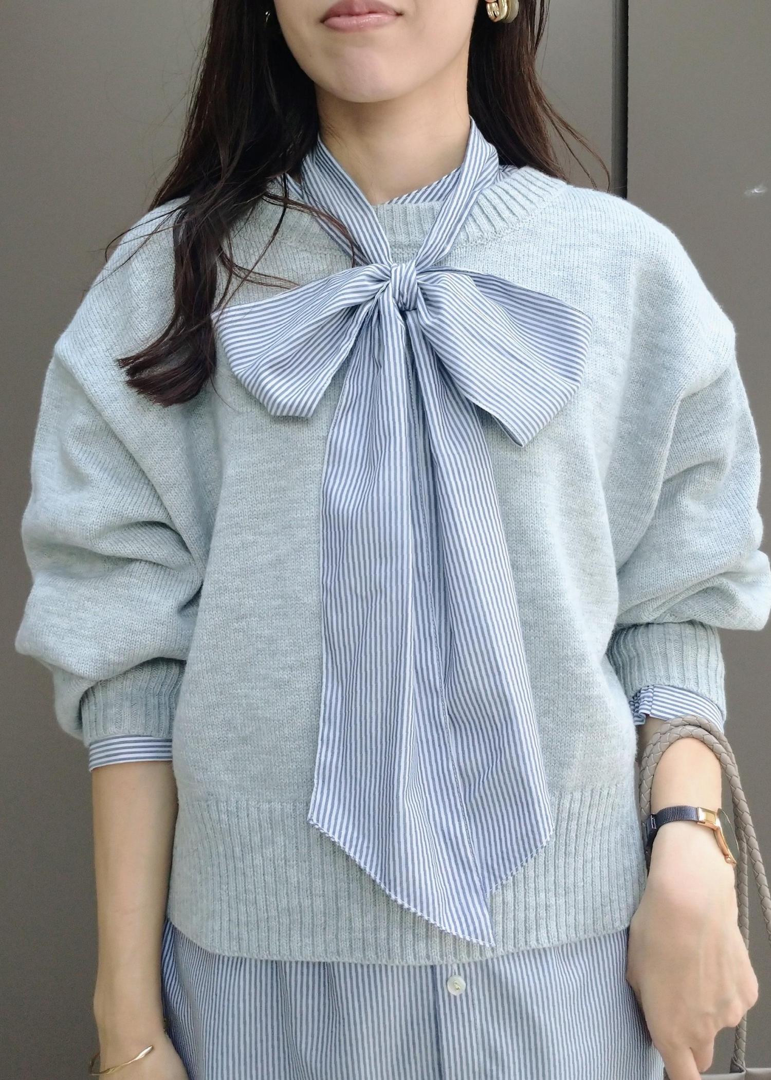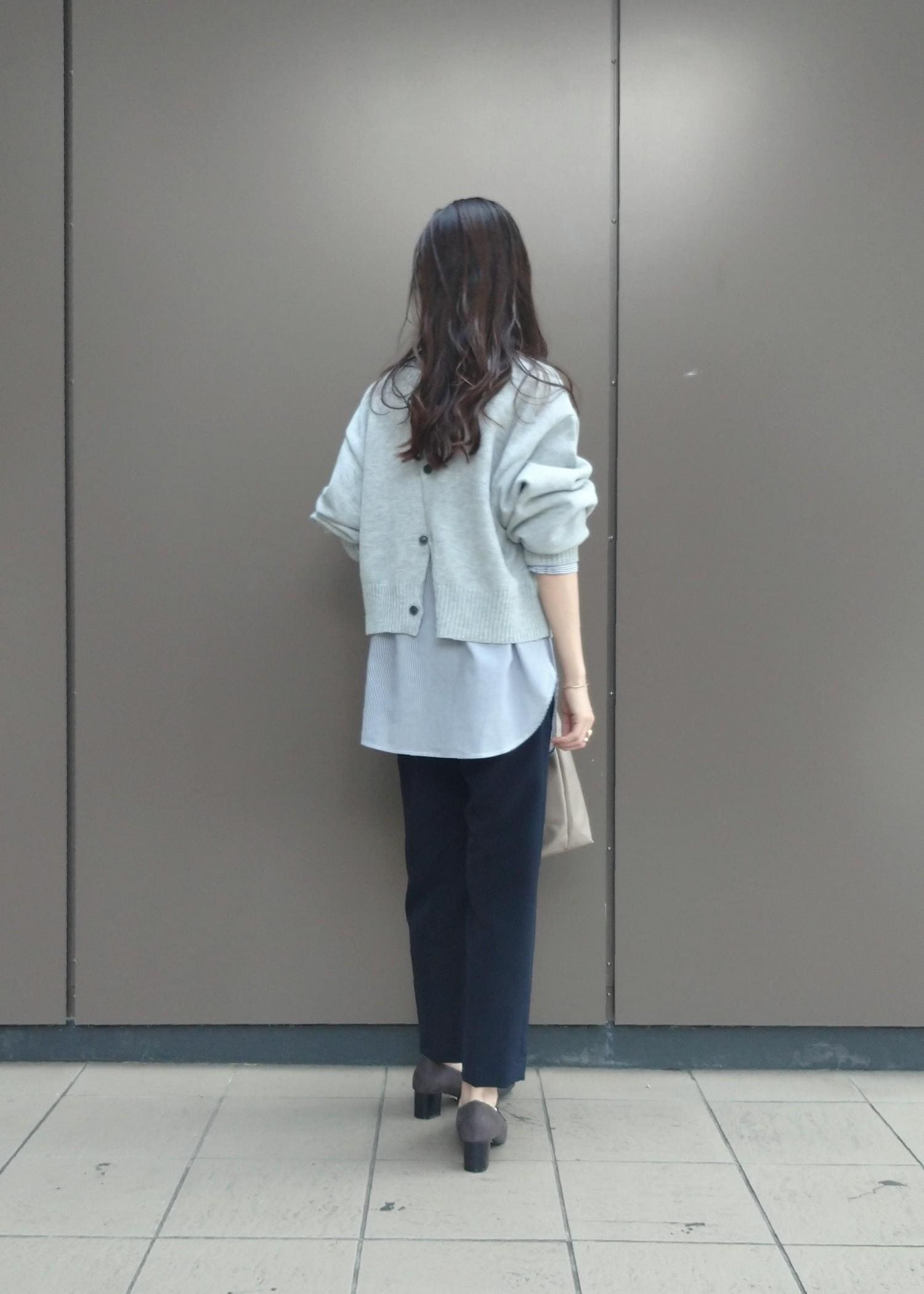前後2wayのカーディガンを、ボタンを後ろにして着用し、リボンタイブラウスとのレイヤードスタイルに!!