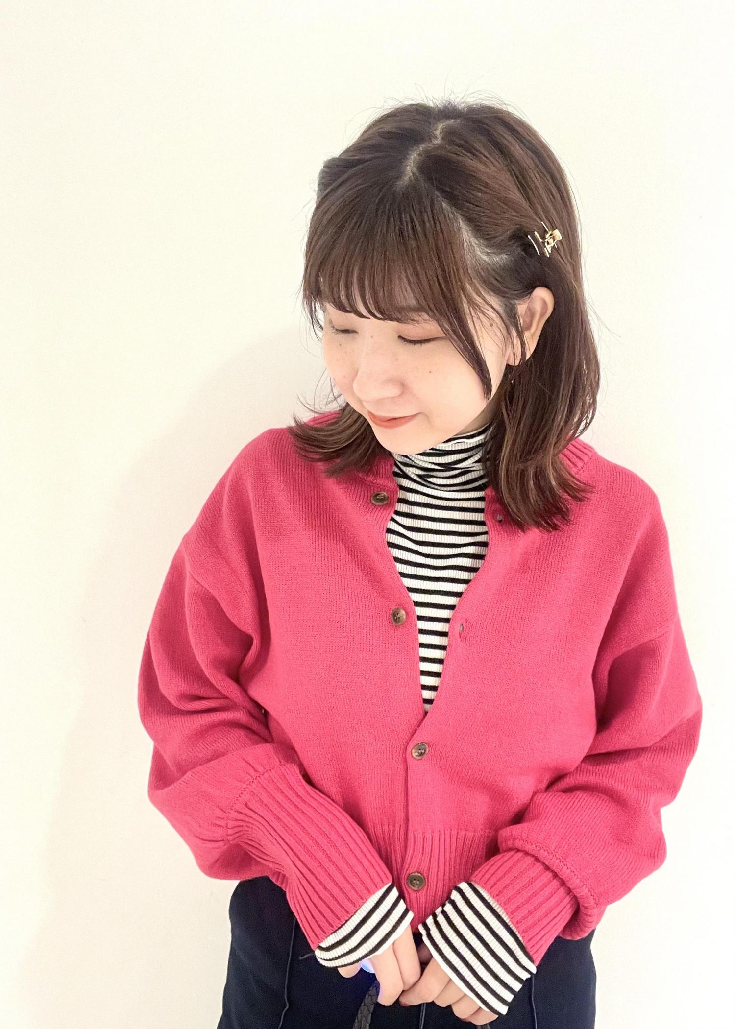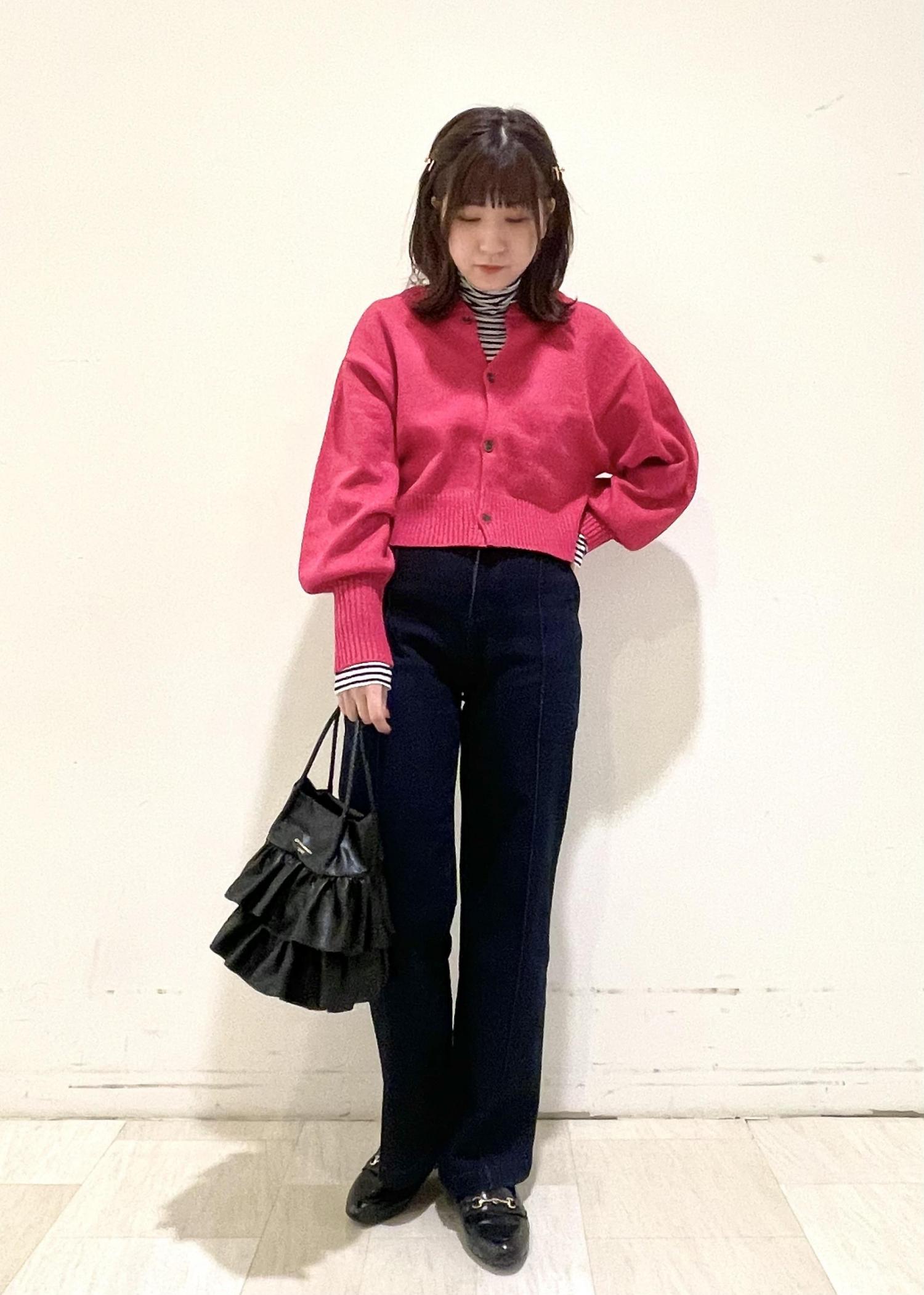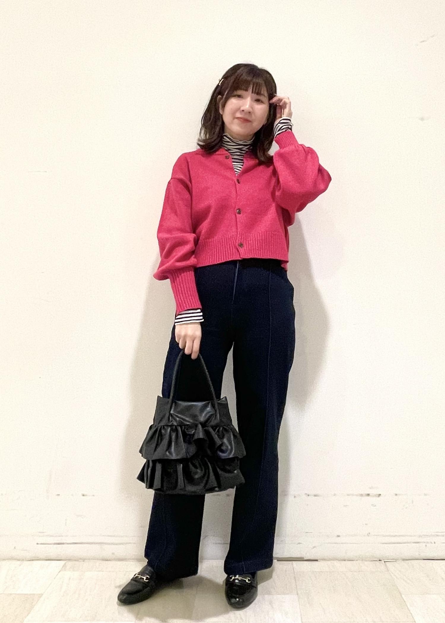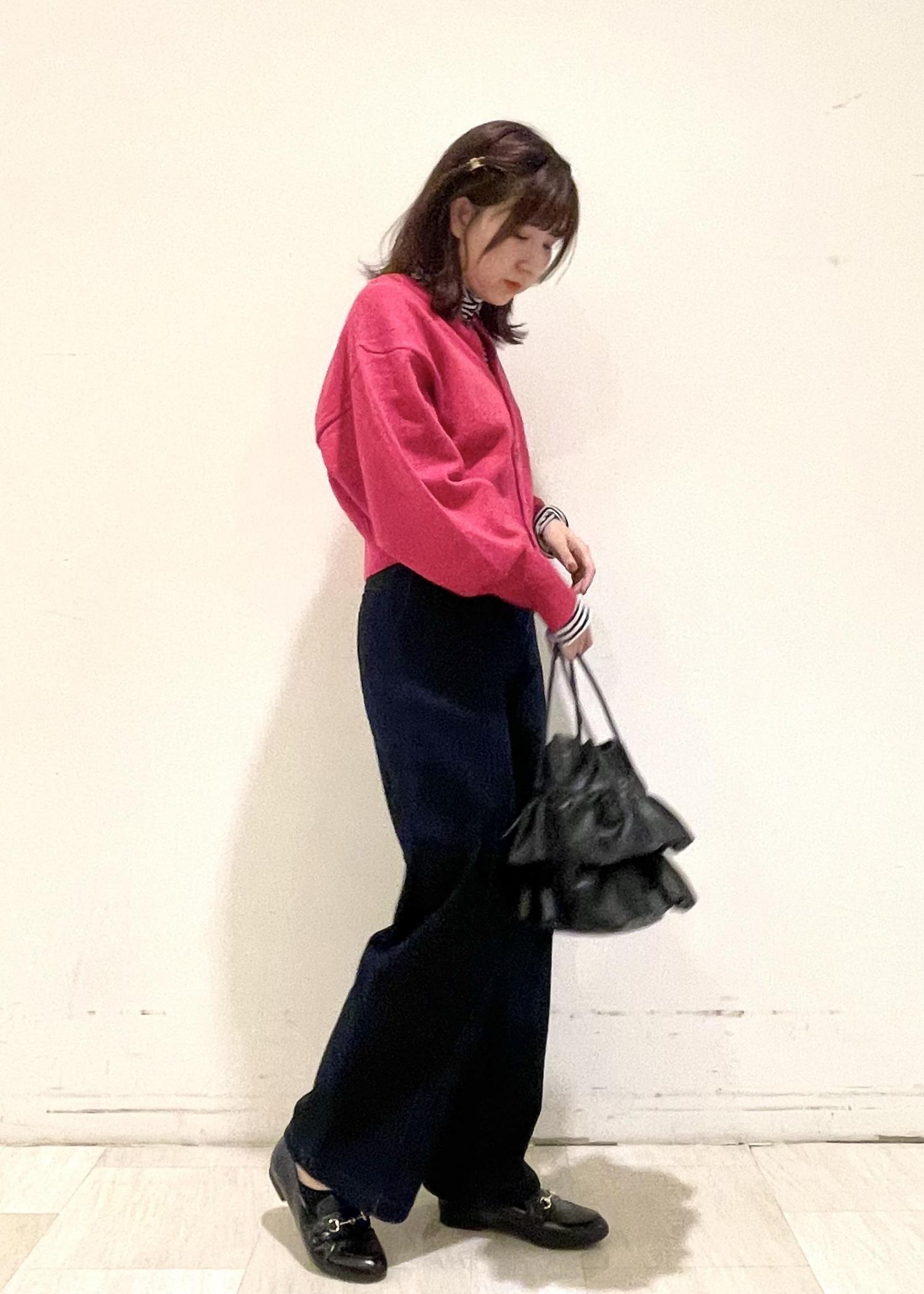 マゼンダピンクが映えるようにブラックデニムでおとなっぽい印象にしました。 小物もブラックでまとめてピンク×ボーダーが映えるコーデに。