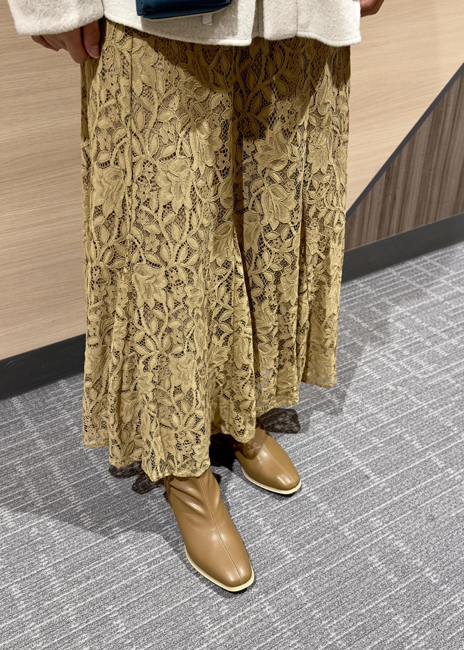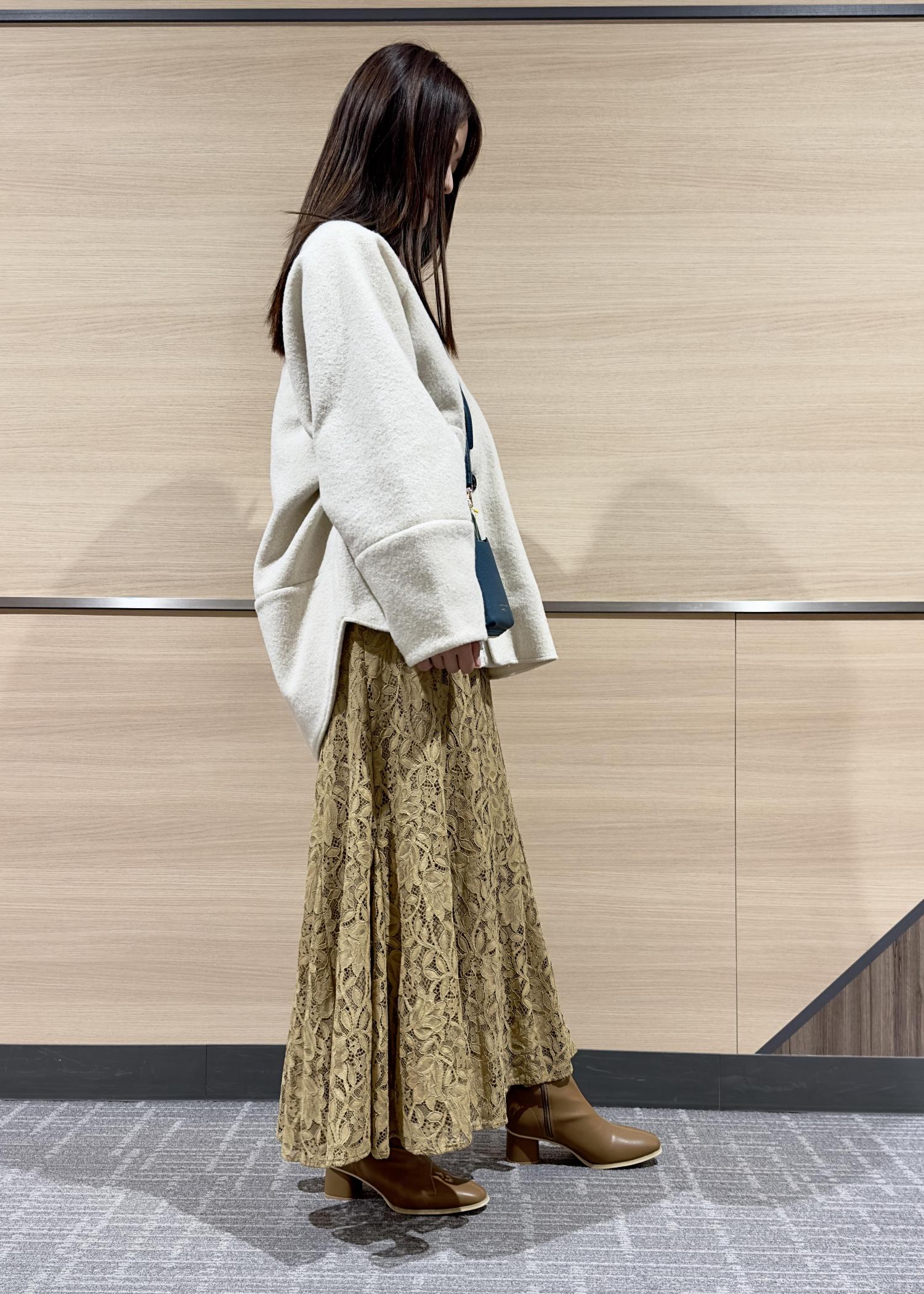 秋らしい厚めのカーディガンに女性らしいレーススカートを合わせて、カジュアルだけど大人っぽいコーデに仕上げました。
