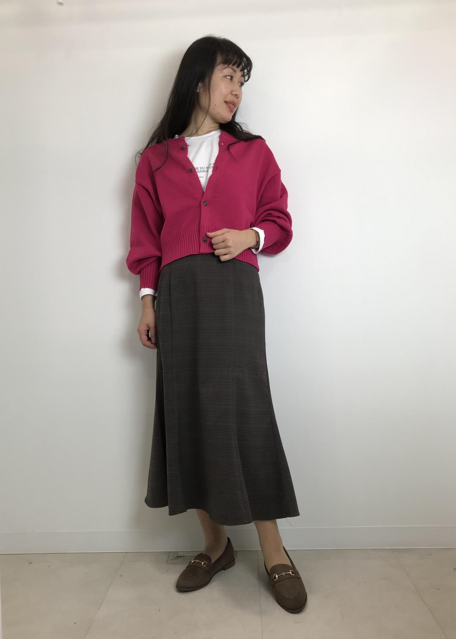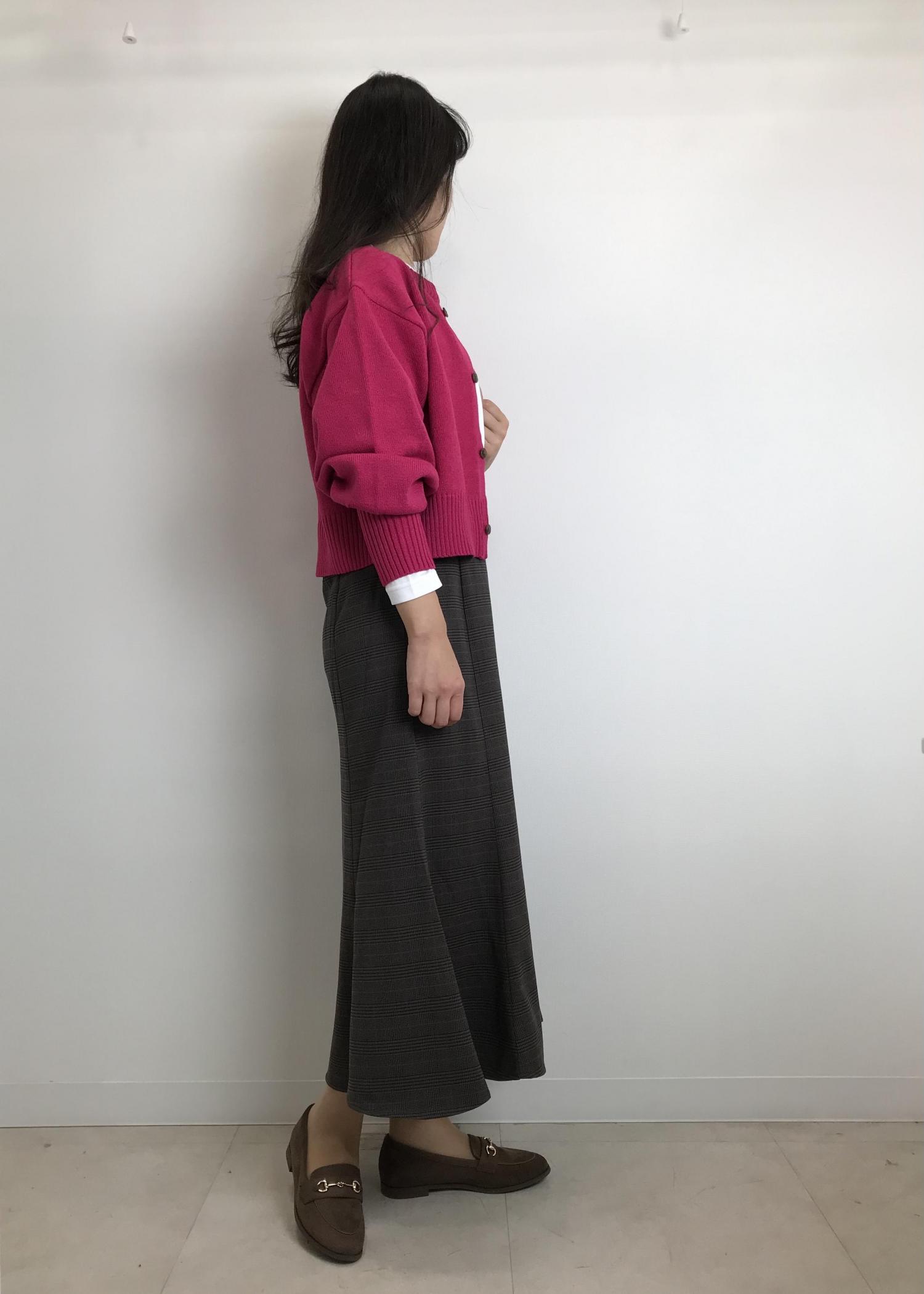 下半身の女性らしいボディラインを拾わないマーメイドスカート×ゆるめでありながら、丈が短くウエストマーク出来るニットを合わせることで、スタイルアップが叶うコーディネートです。