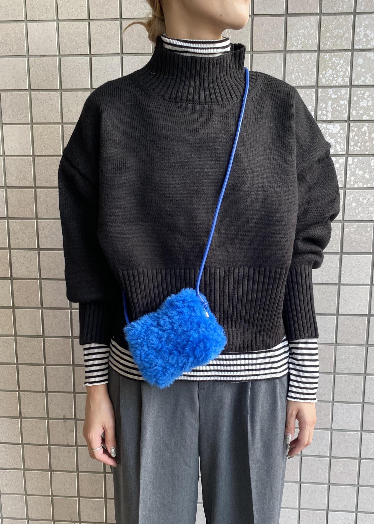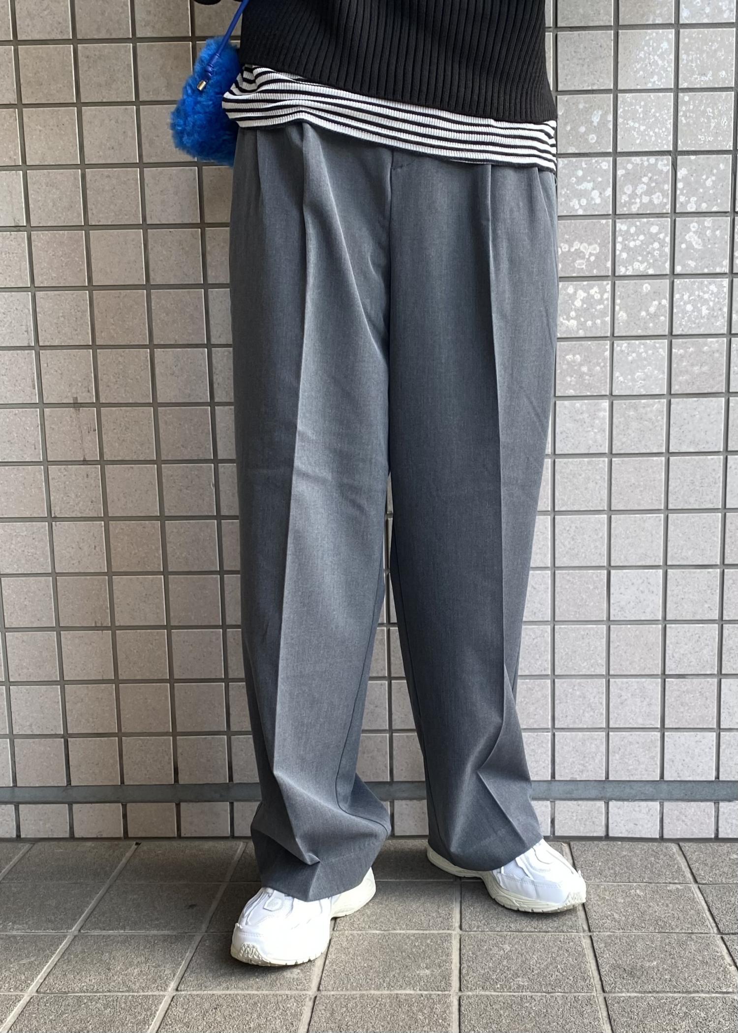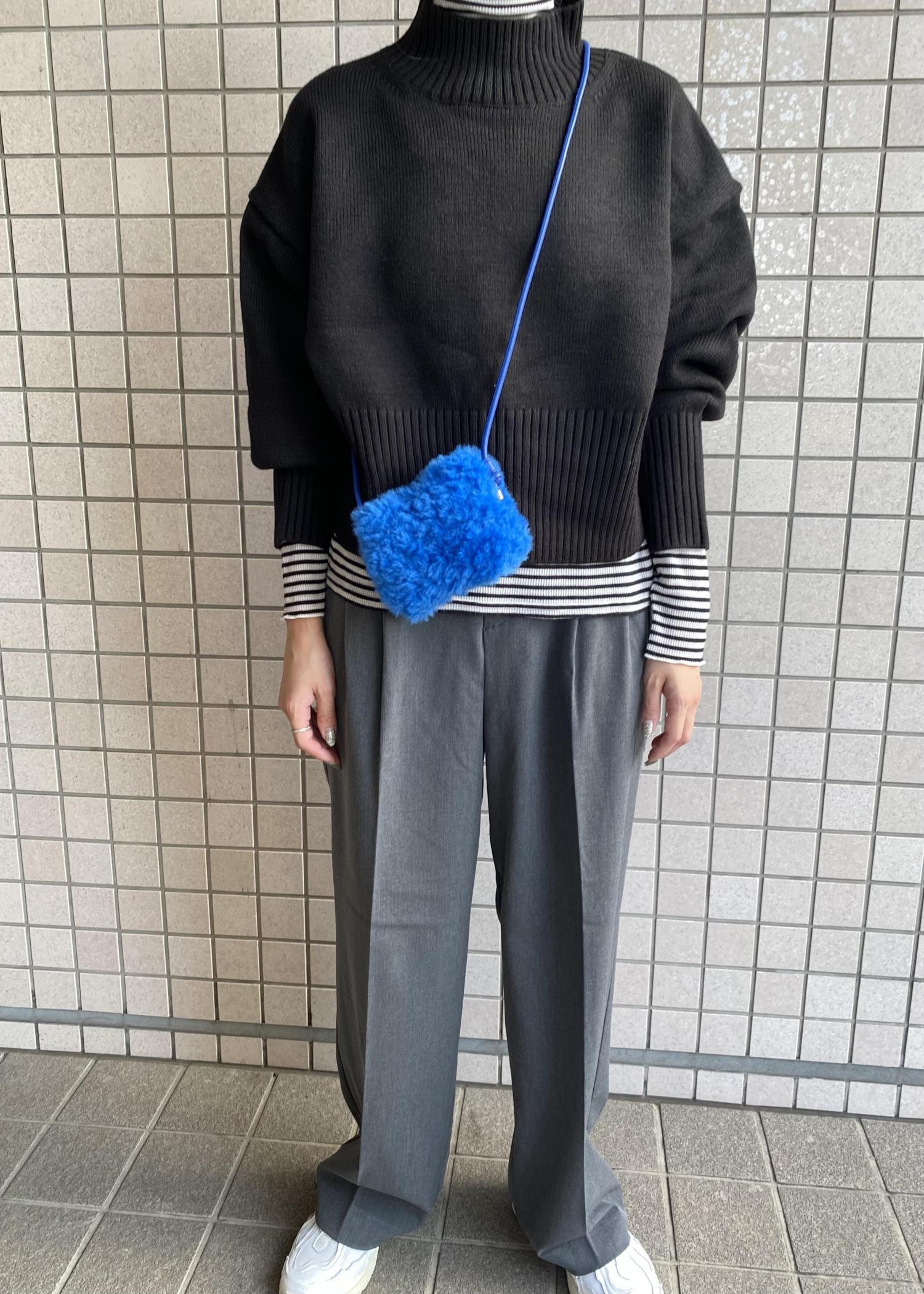 グレー〜ブラックを使ったワントーンコーディネートです。 インナーにボーダー、ブルーのバッグを合わせてアクセントにしました。