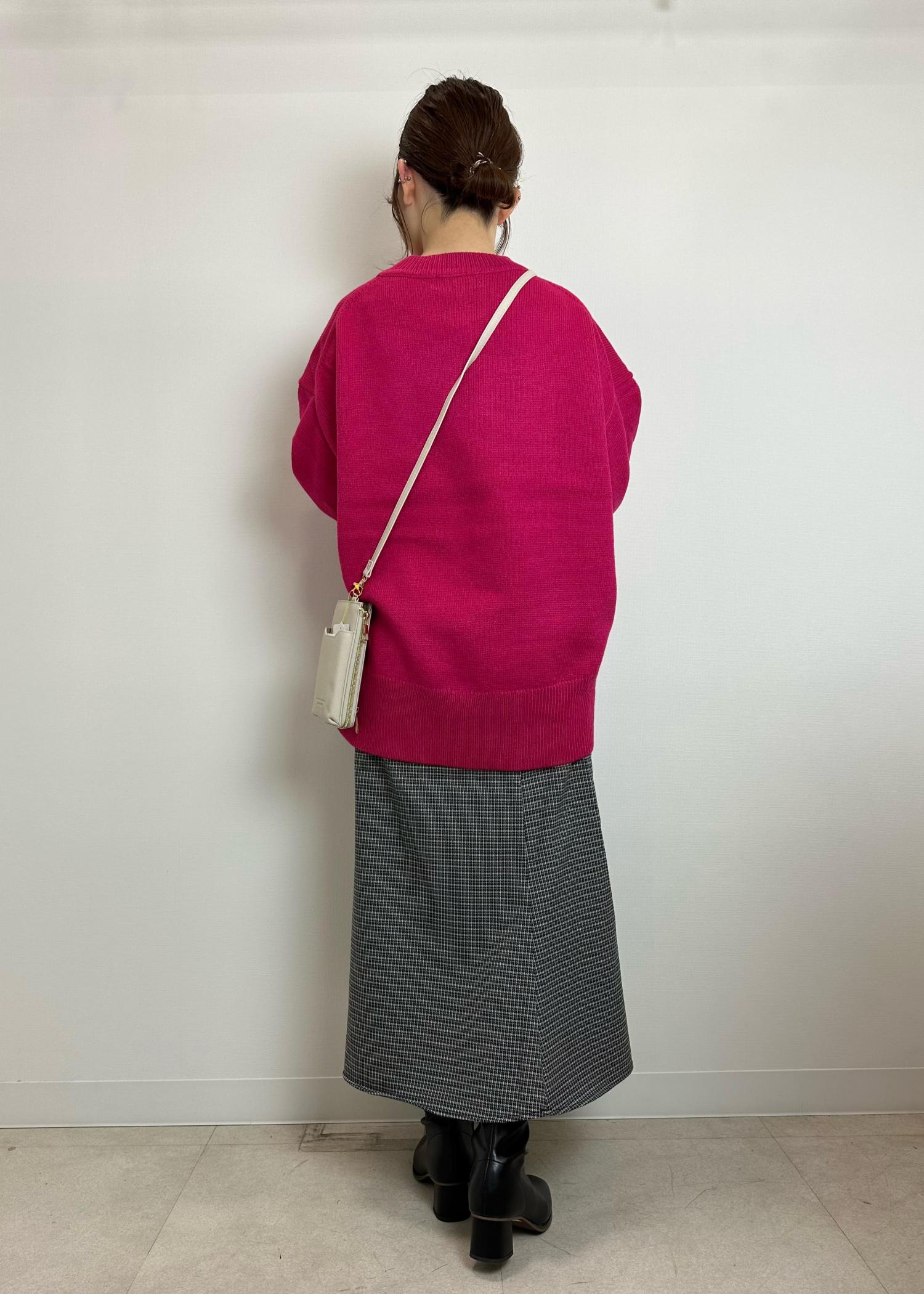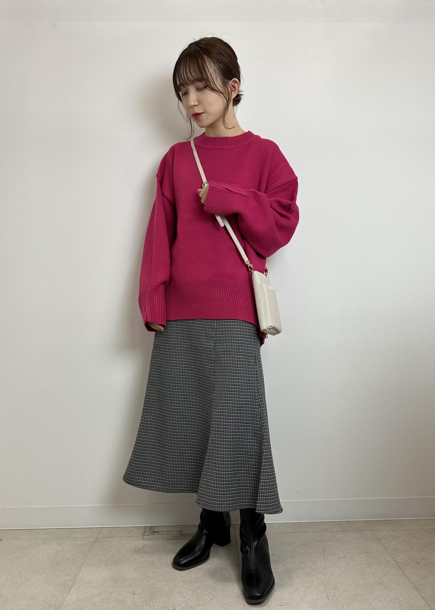 目を惹くパキッとしたピンクカラーのゆったりニットをマーメイドスカートと合わせゆるっとしながらもメリハリのあるコーデました◎