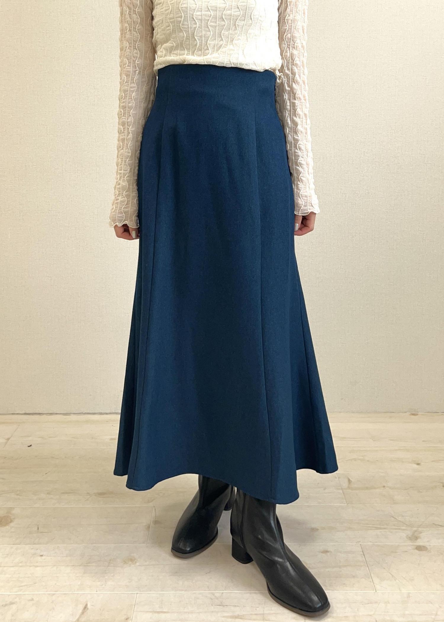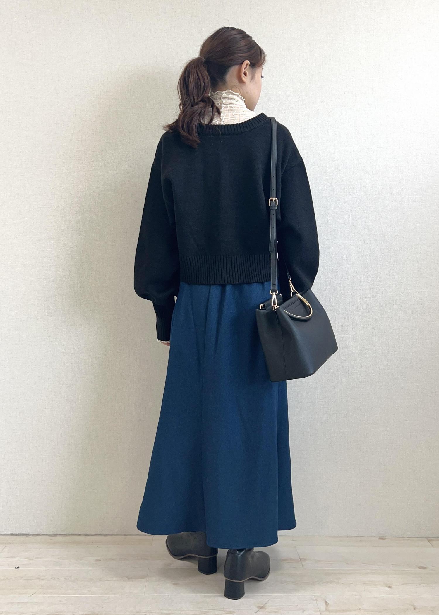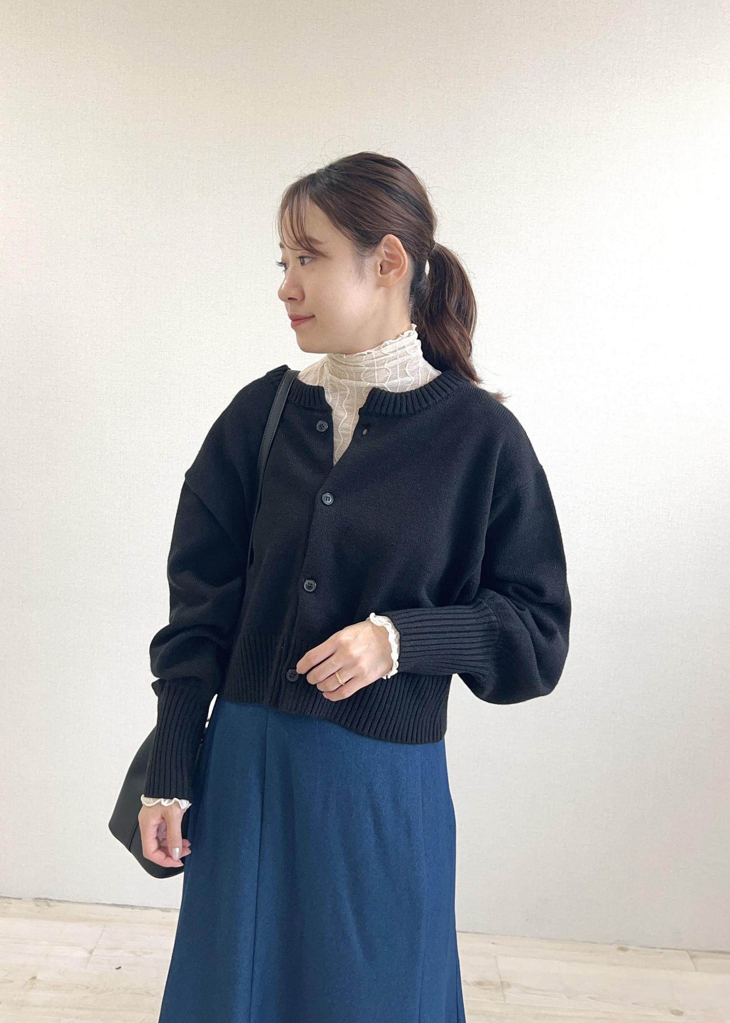 短丈のカーディガンは、着るだけでスタイルアップに。 さらにボタンを一つ空けて、こなれ感を出しました。