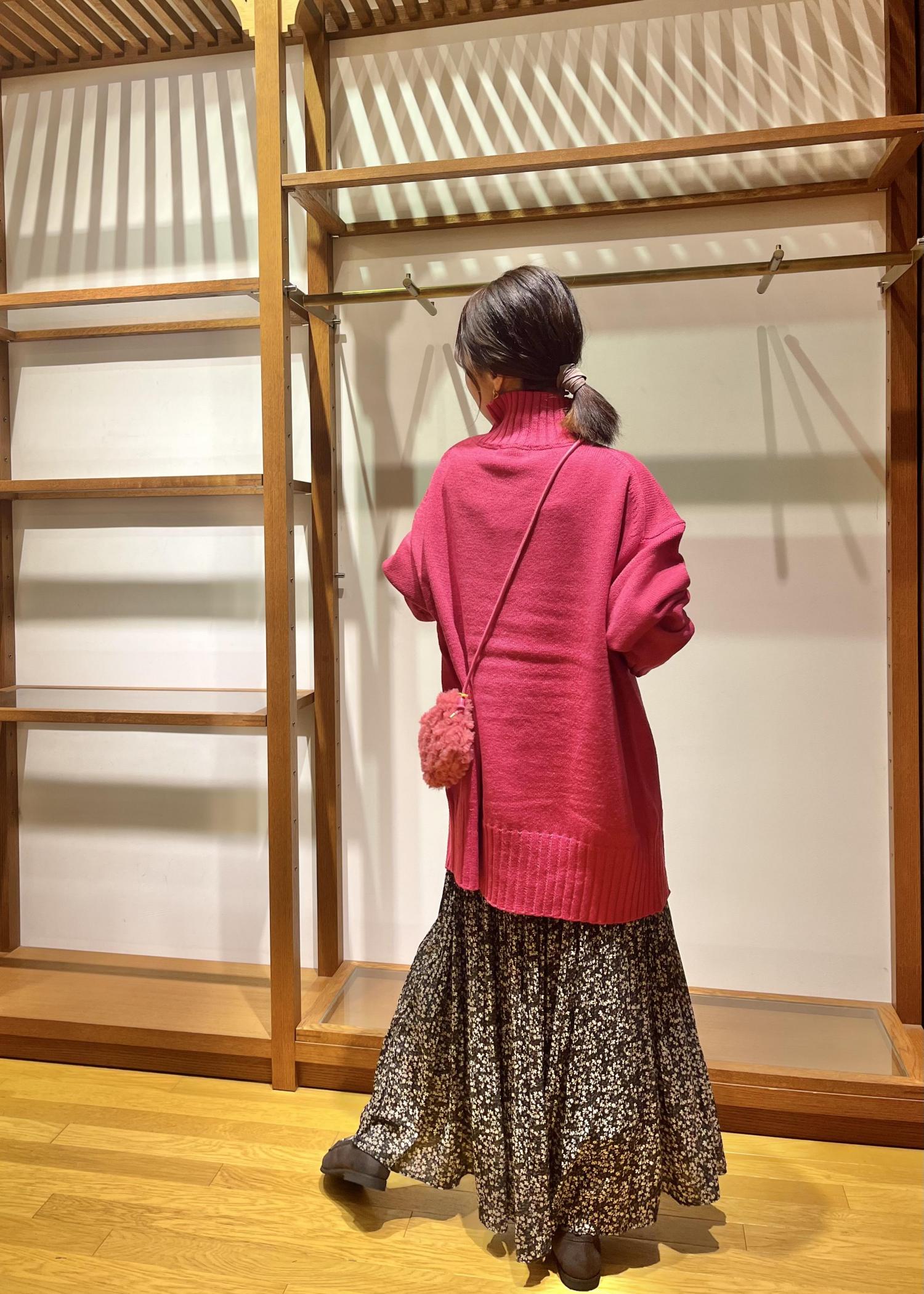 カラーニットのスカートコーデです。 ビビットなピンクがアクセントのお出かけコーデです。
