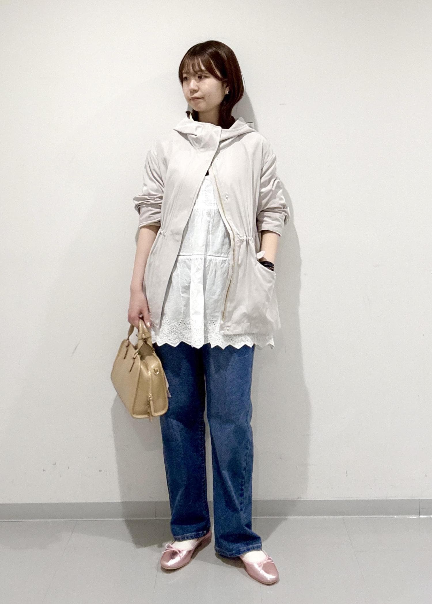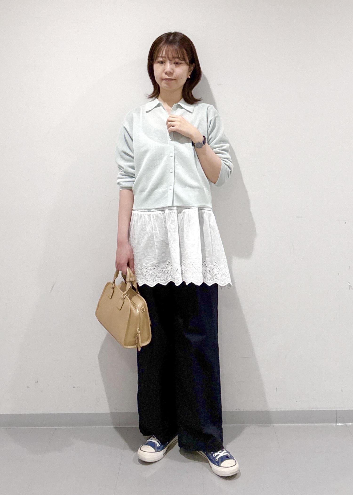 パキッとカラーが可愛いピンクのカーディガンを使ったコーデです。
