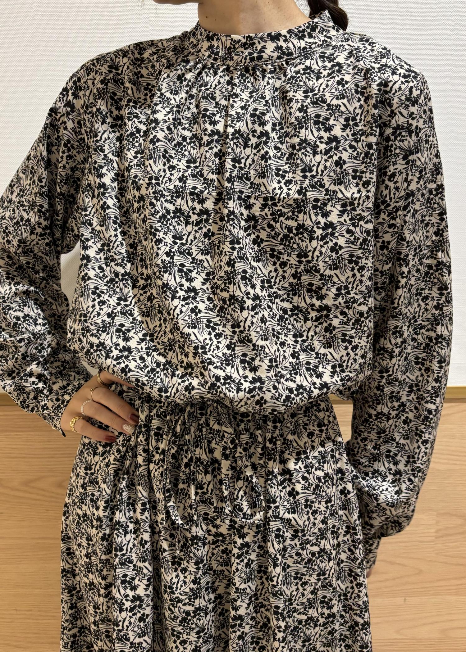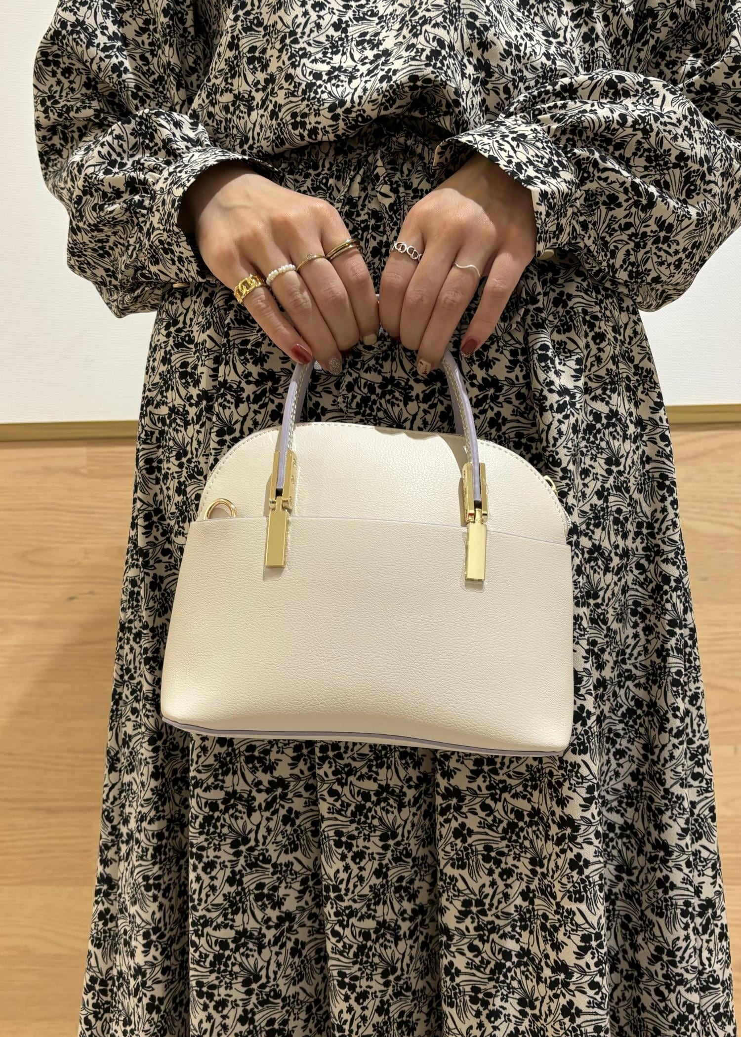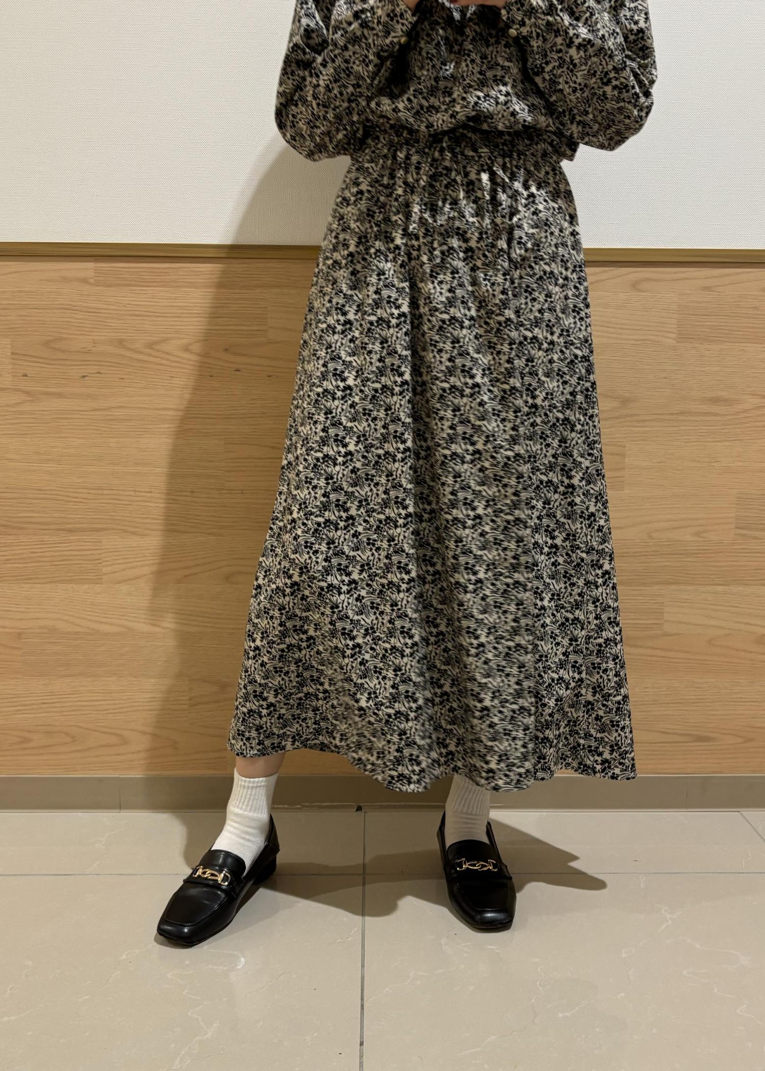 ベージュにブラックのお花柄のワンピース、1枚で着映えします。そこに柔らかい印象になるようにホワイトのカーディガンを羽織りました。