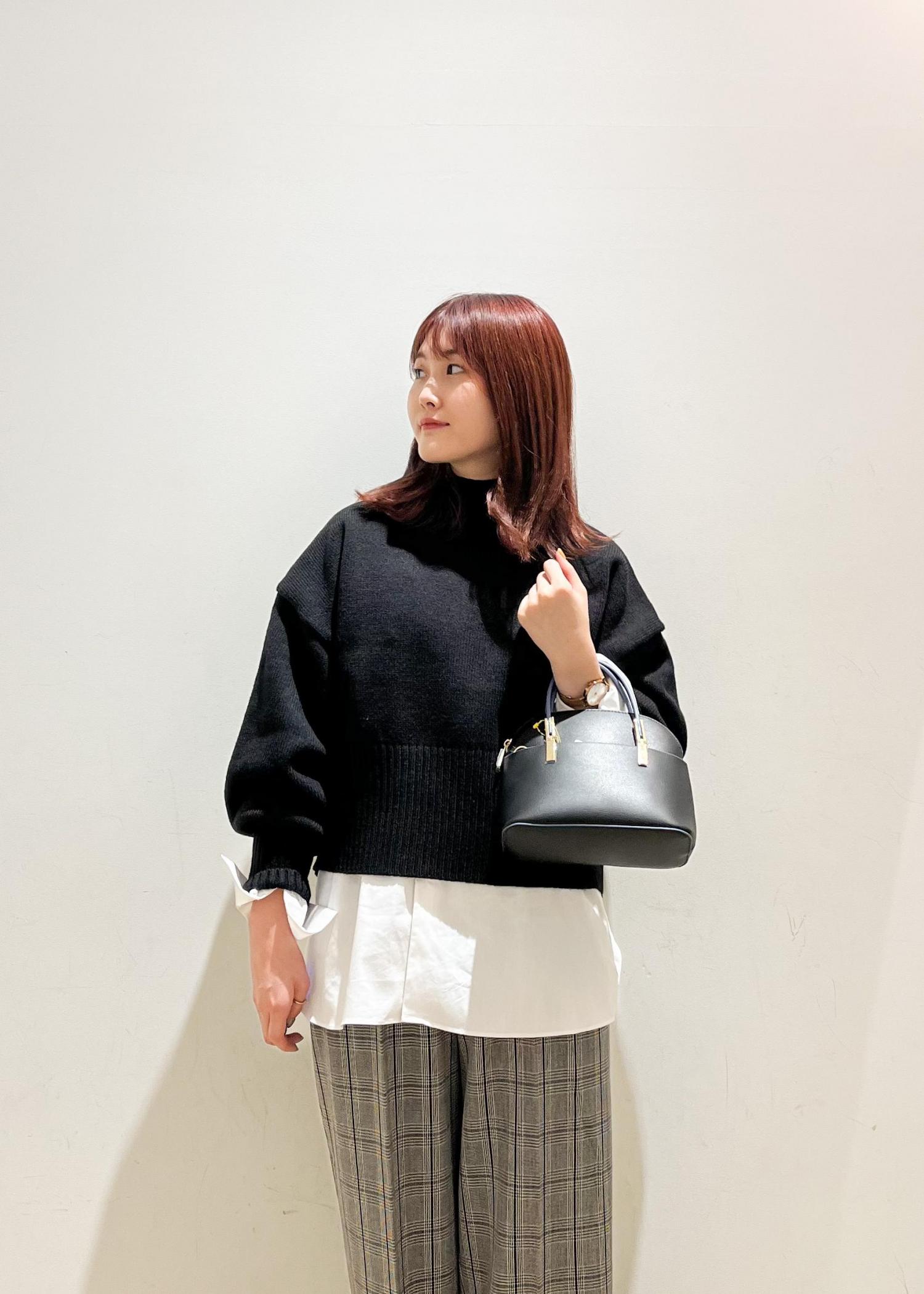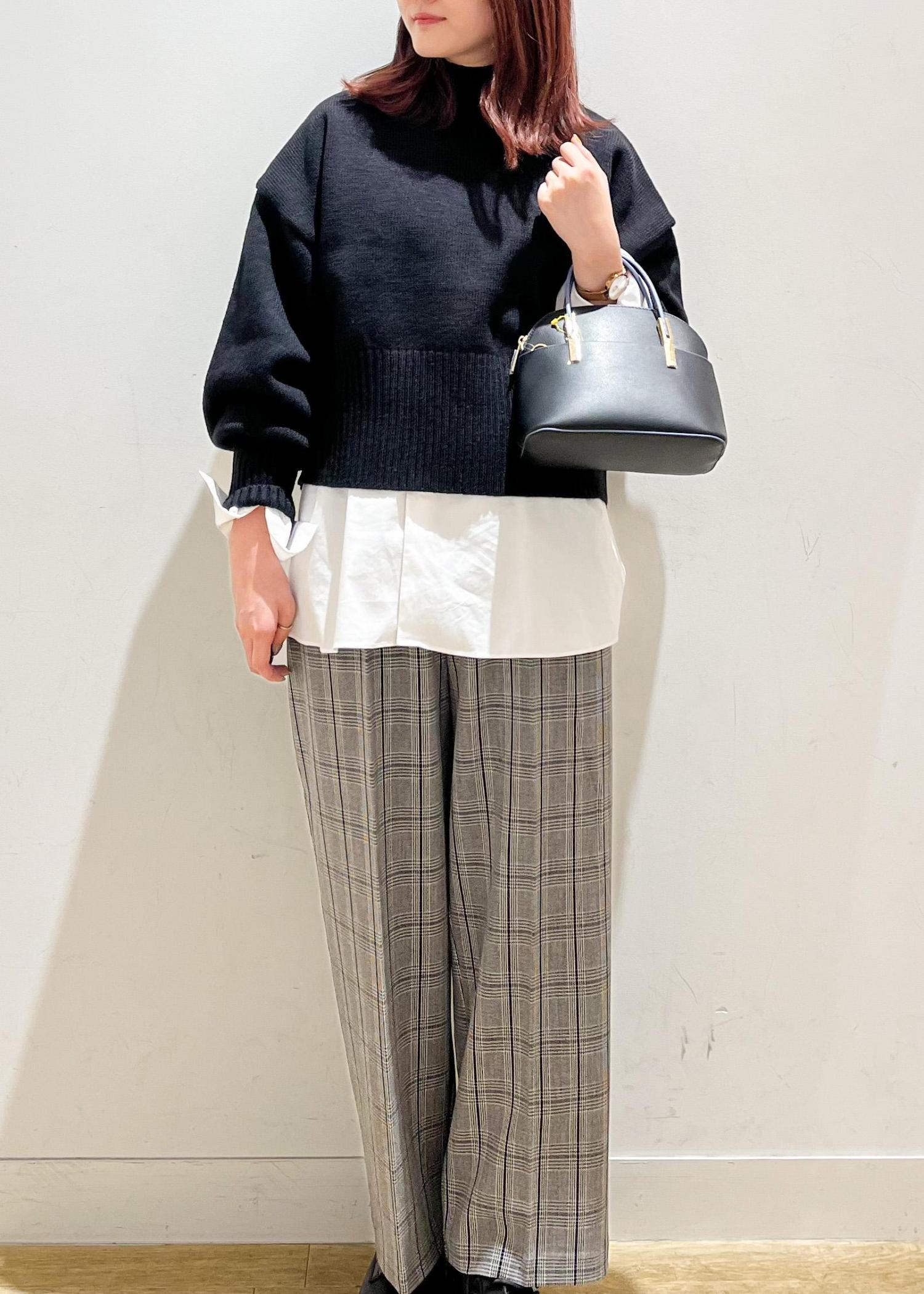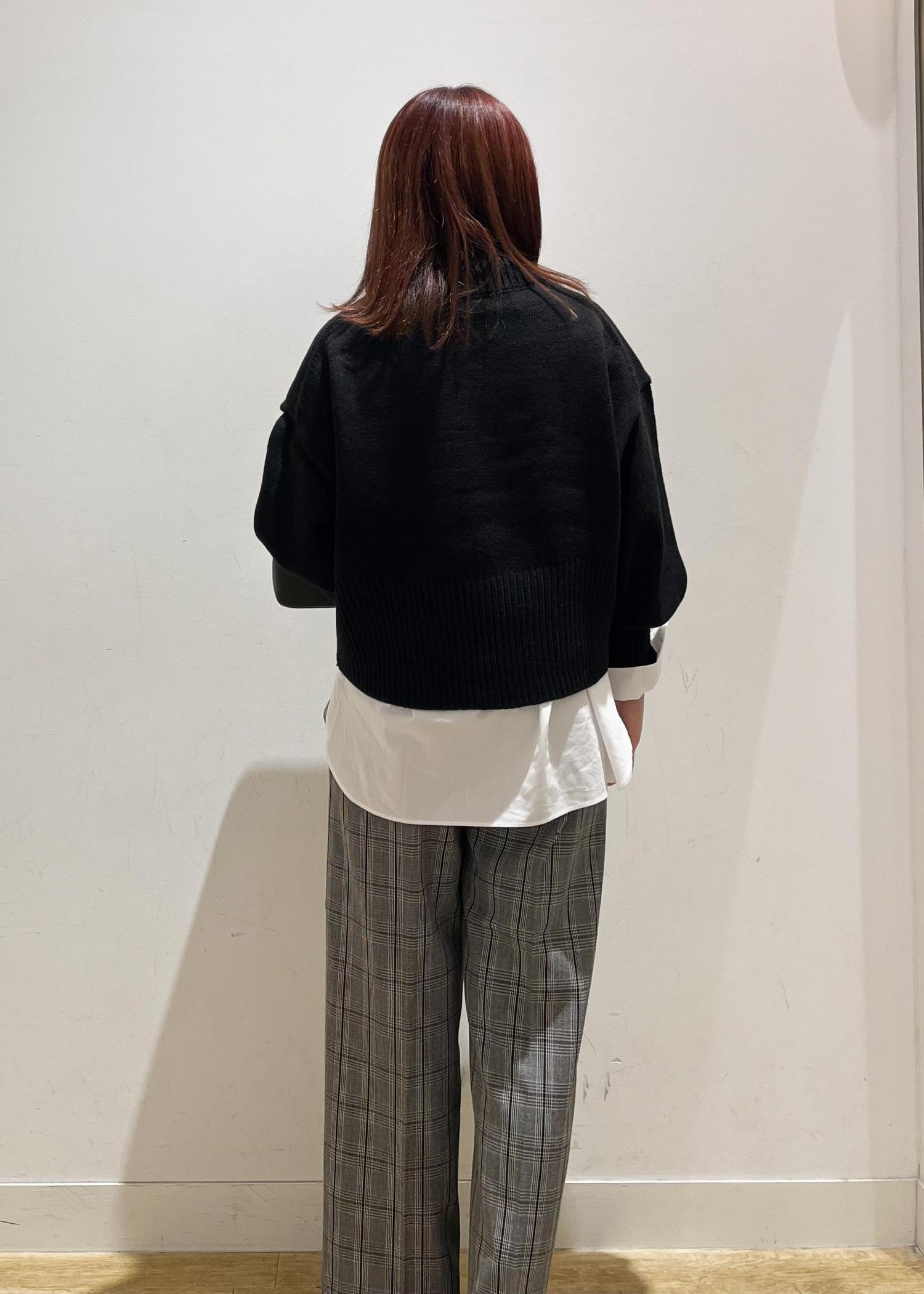 ブラック、ホワイトでまとめたモノトーンコーデ。 クロップド丈のニットにシャツをレイヤードしてトレンド感溢れるコーデに仕上げました。