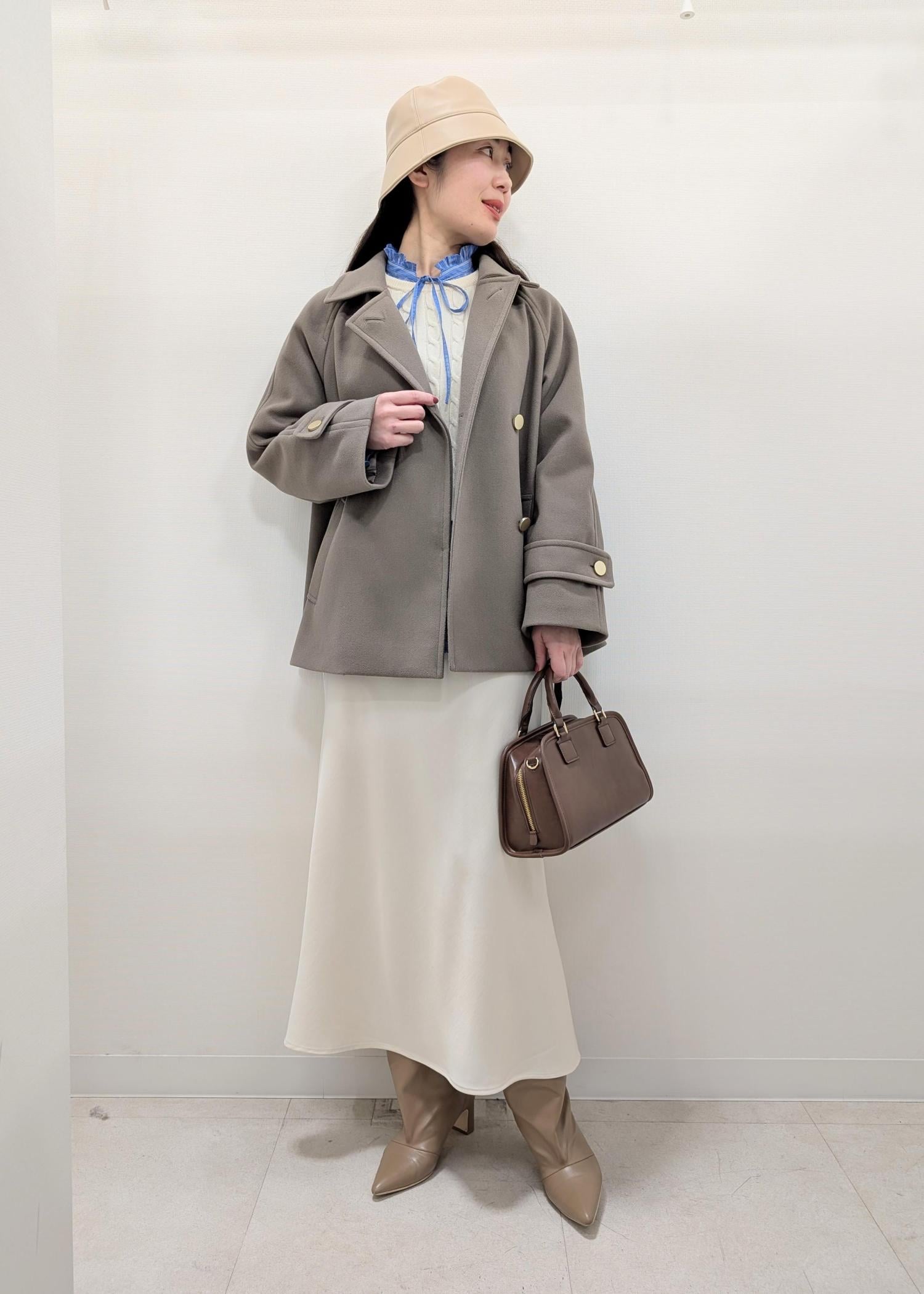 ブルーのキレイなゆったりニットにスッキリしたスカートを合わせました。チェック柄で秋らしいコーディネートにしています。