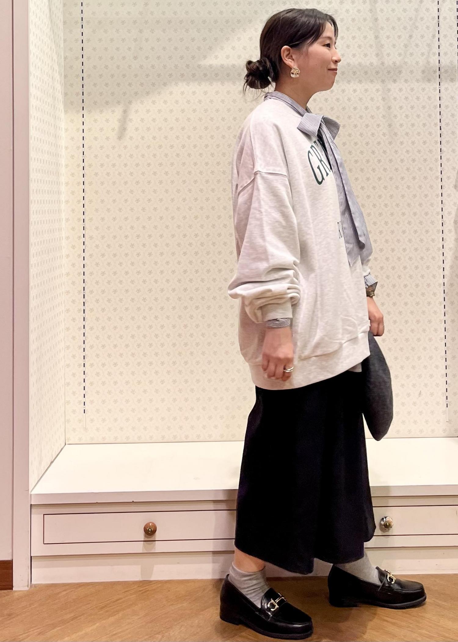 スウェットを主役に、ボウタイブラウスとレイヤードし