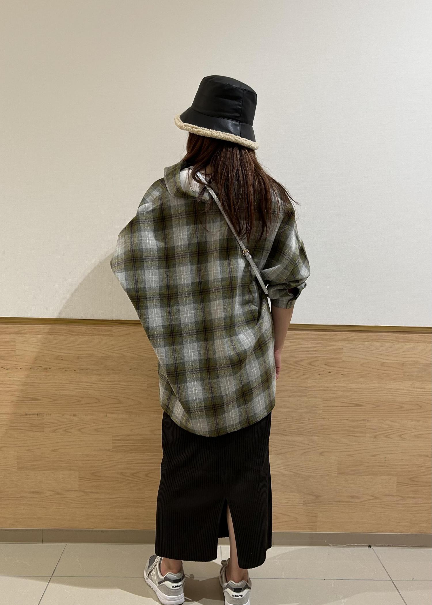 ポロのネルシャツとテレコタイトスカートを合わせたリラックスカジュアルコーデ。