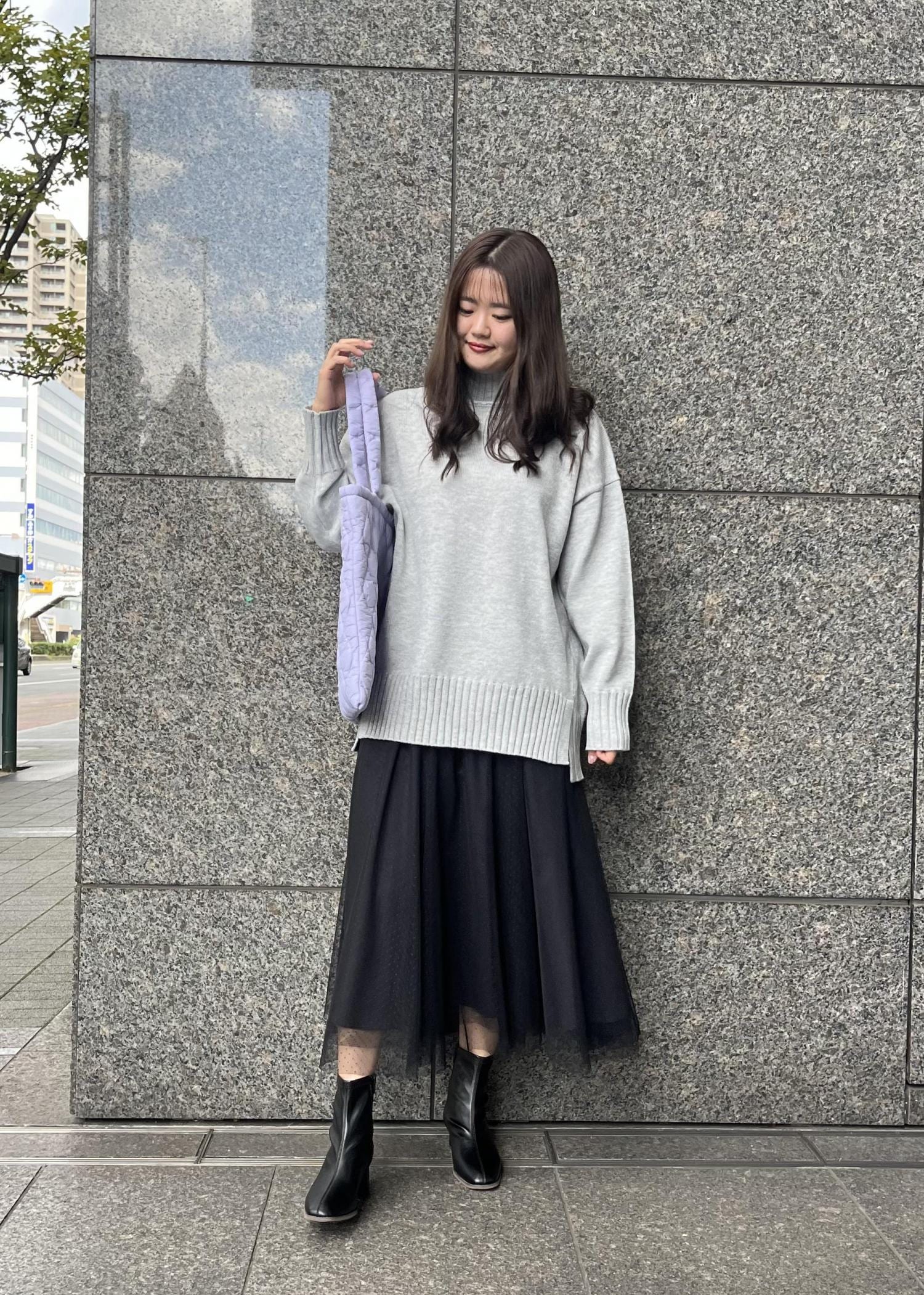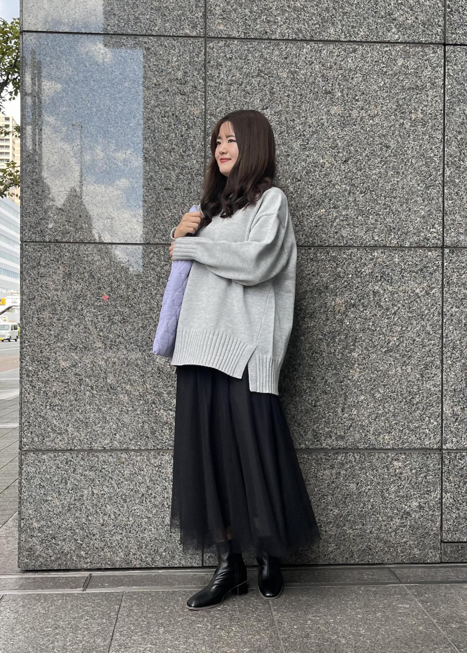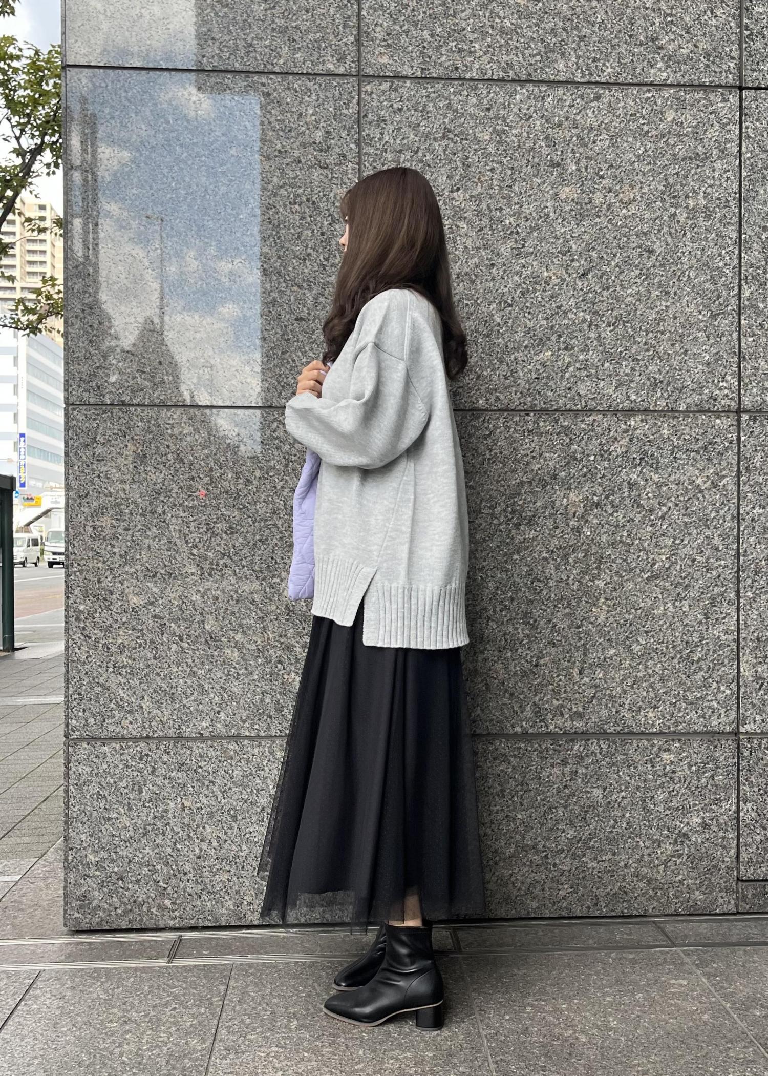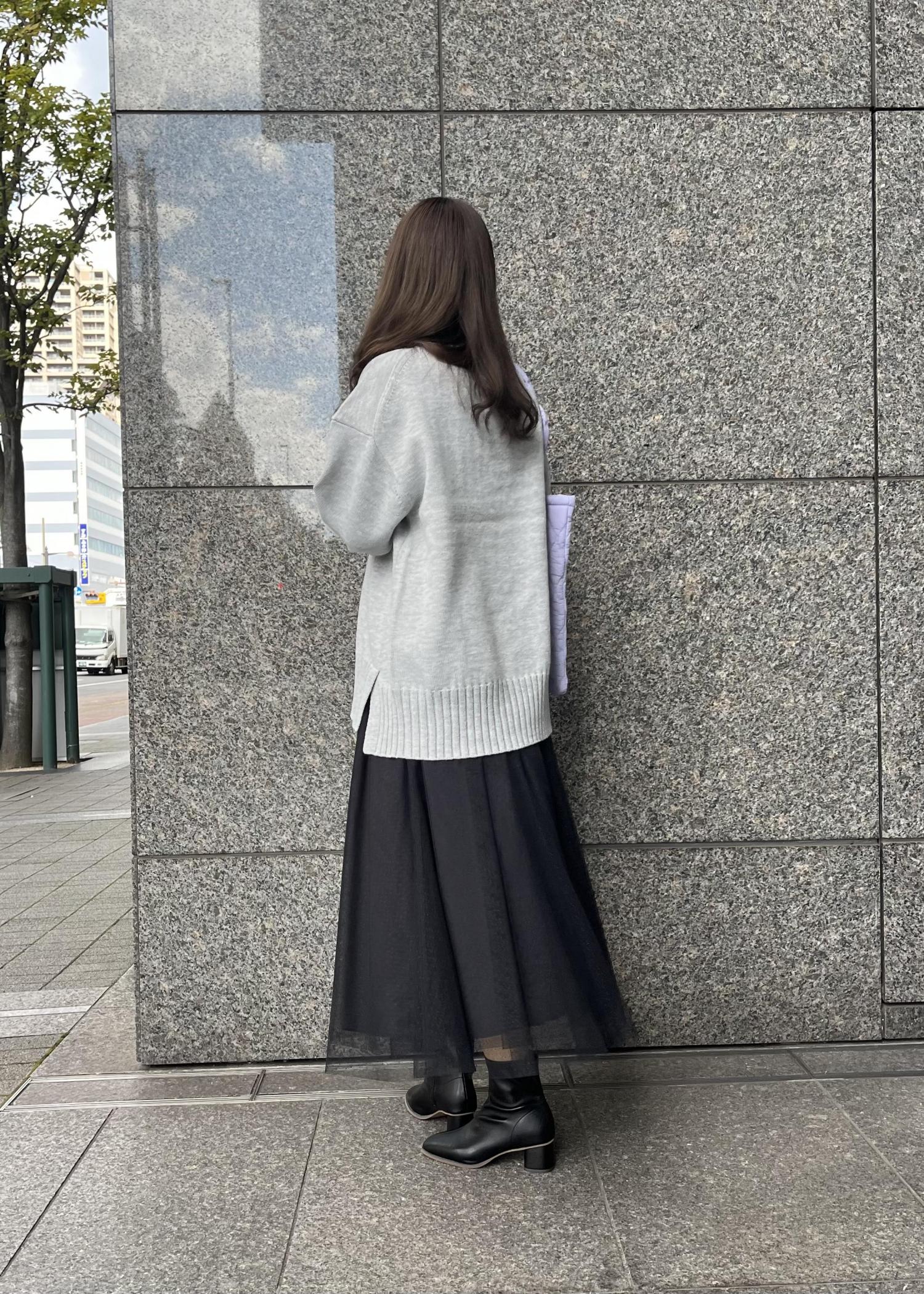 オーバーサイズのニットとチュールスカートで少し甘めのニットスタイルに。
